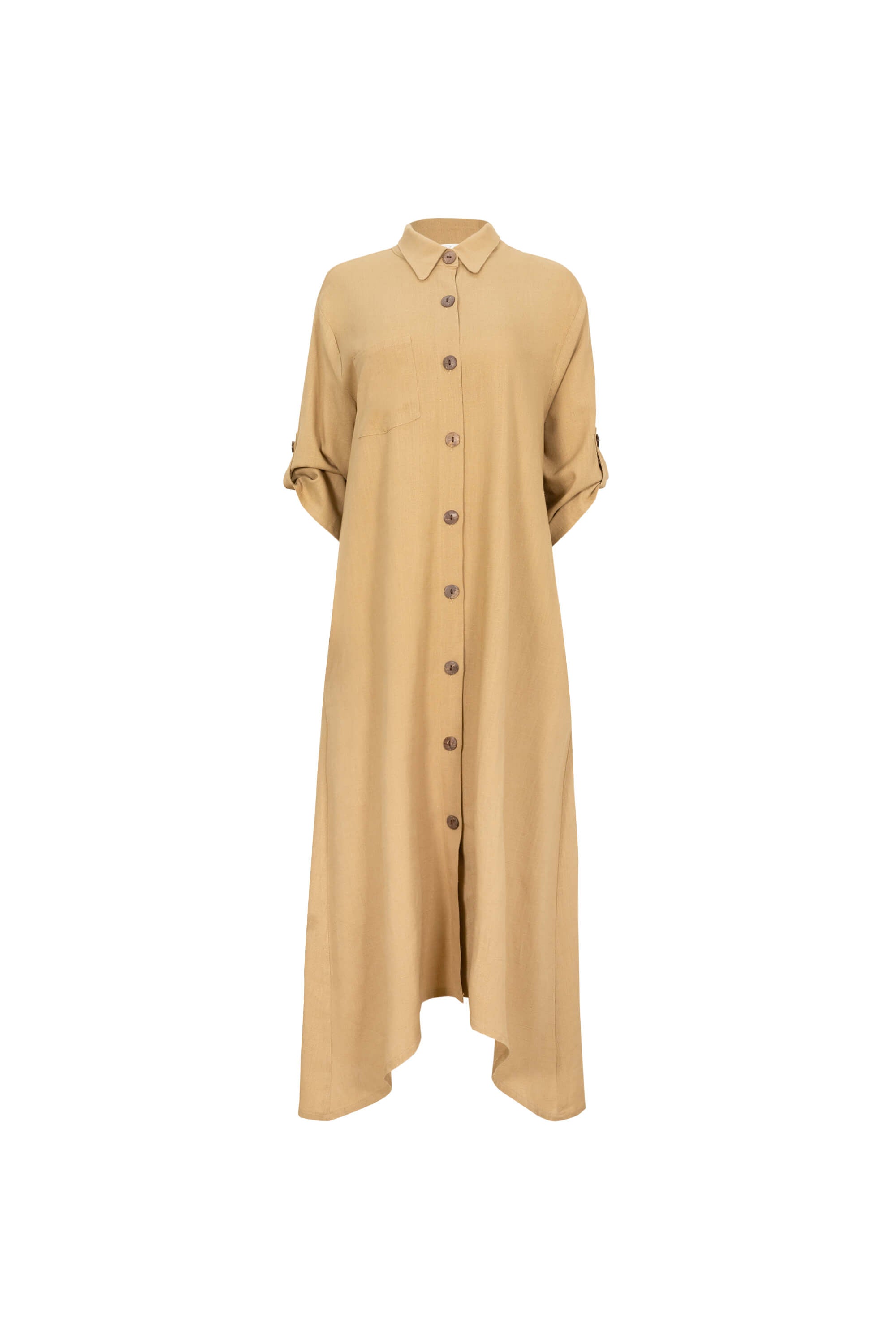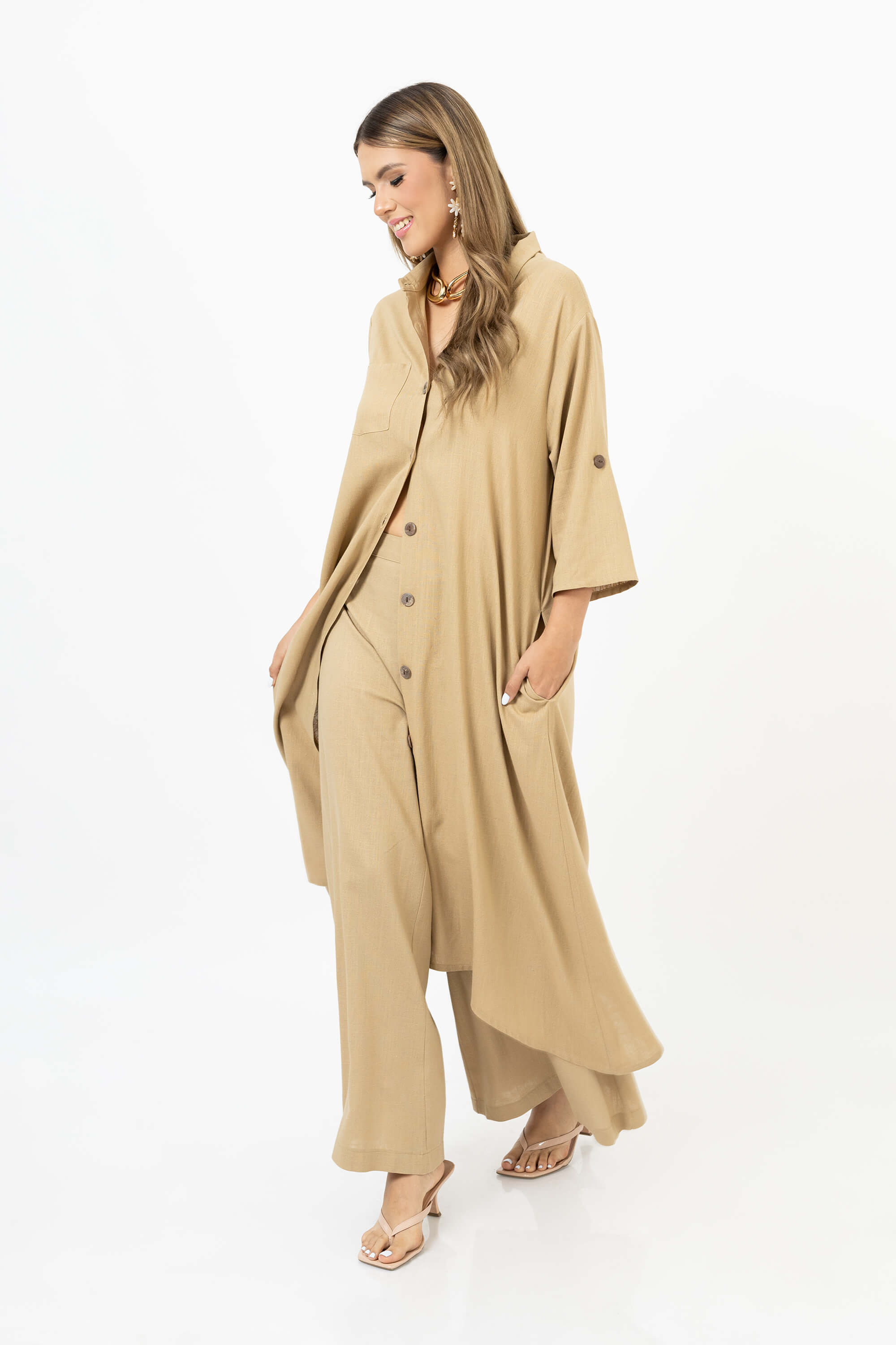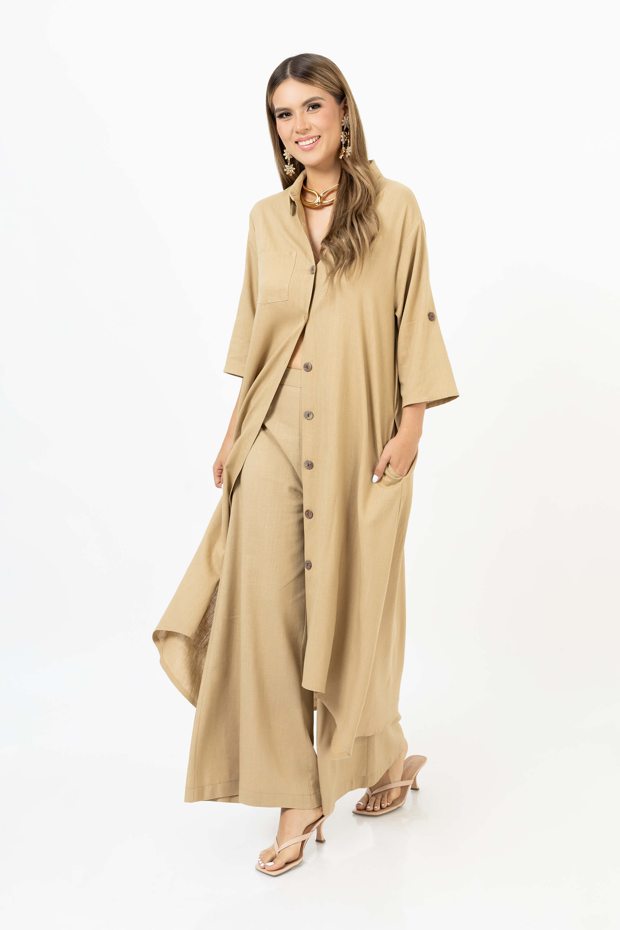 El Vestido camisero de Reina Díaz redefine la elegancia relajada con una silueta fluida y un diseño clásico. Confeccionado en tejido ligero, presenta botones al frente, cuello camisero y mangas ajustables que aportan versatilidad. Su caída natural y tonalidad neutra lo convierten en una prenda esencial para un guardarropa sofisticado. Perfecto para looks casuales con un toque refinado o para ocasiones donde el confort se combina con distinción.