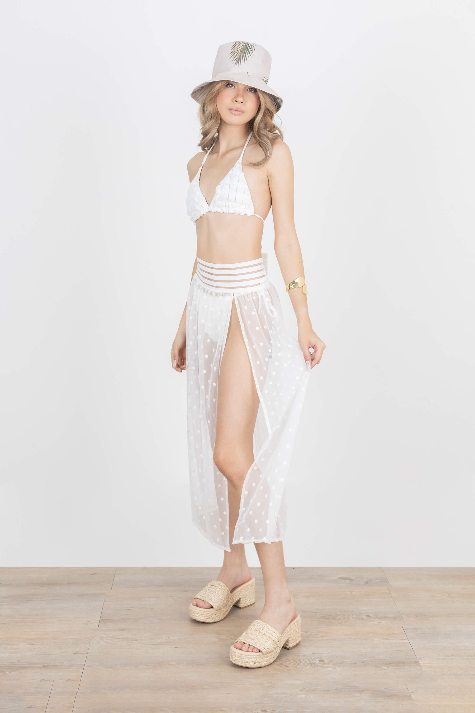 Beach skirt with side opening with elastic waist.