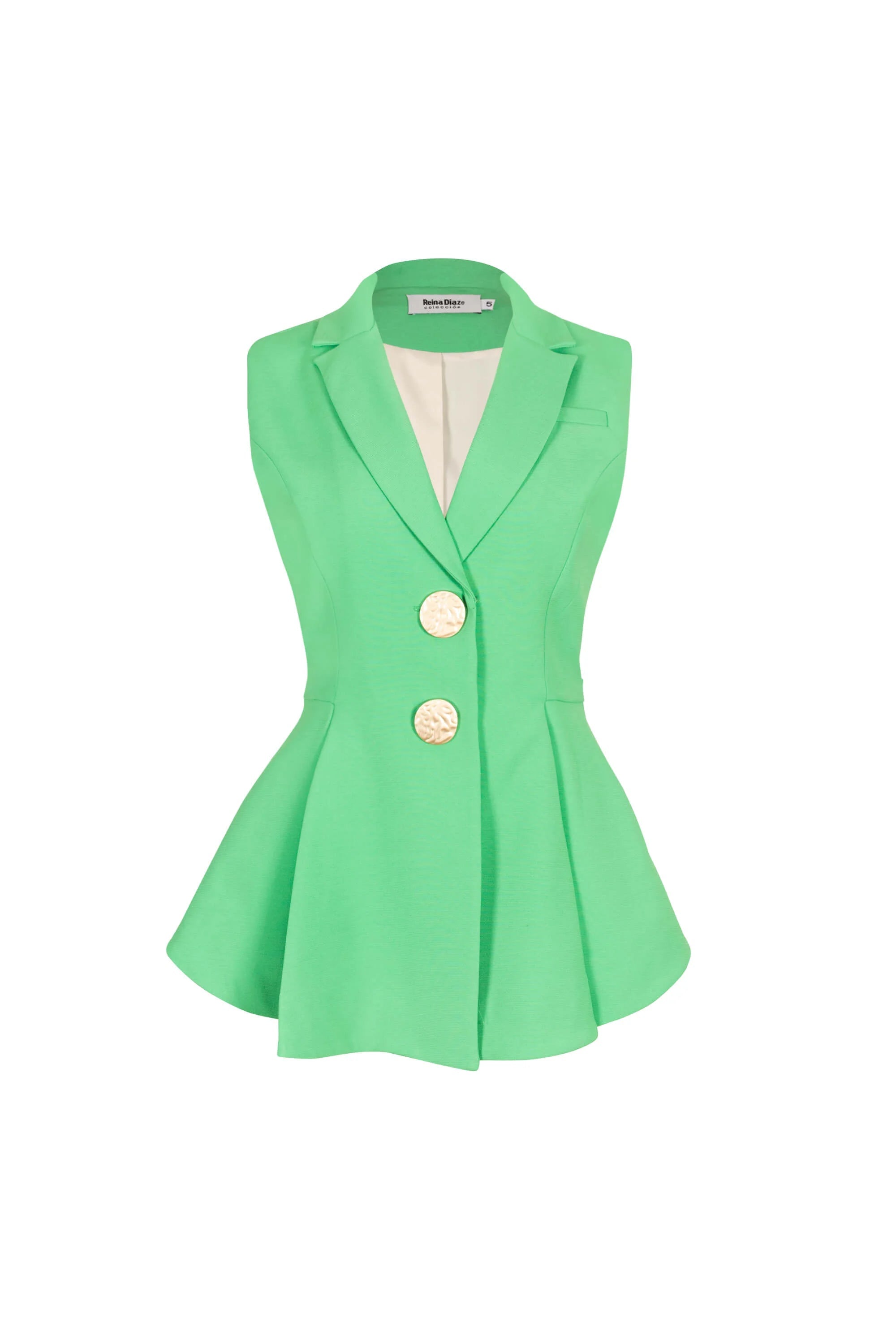 Este chaleco sastrero es una pieza de diseño arquitectónico que fusiona la elegancia formal con una silueta ultra femenina. Presenta un sofisticado cuello de solapa muescada y una estructura peplum que nace de una cintura marcadamente entallada, abriéndose en un volante circular que aporta volumen y movimiento. El punto focal son sus dos botones metálicos dorados de gran formato con relieve artesanal, que elevan la prenda a un nivel de alta costura.