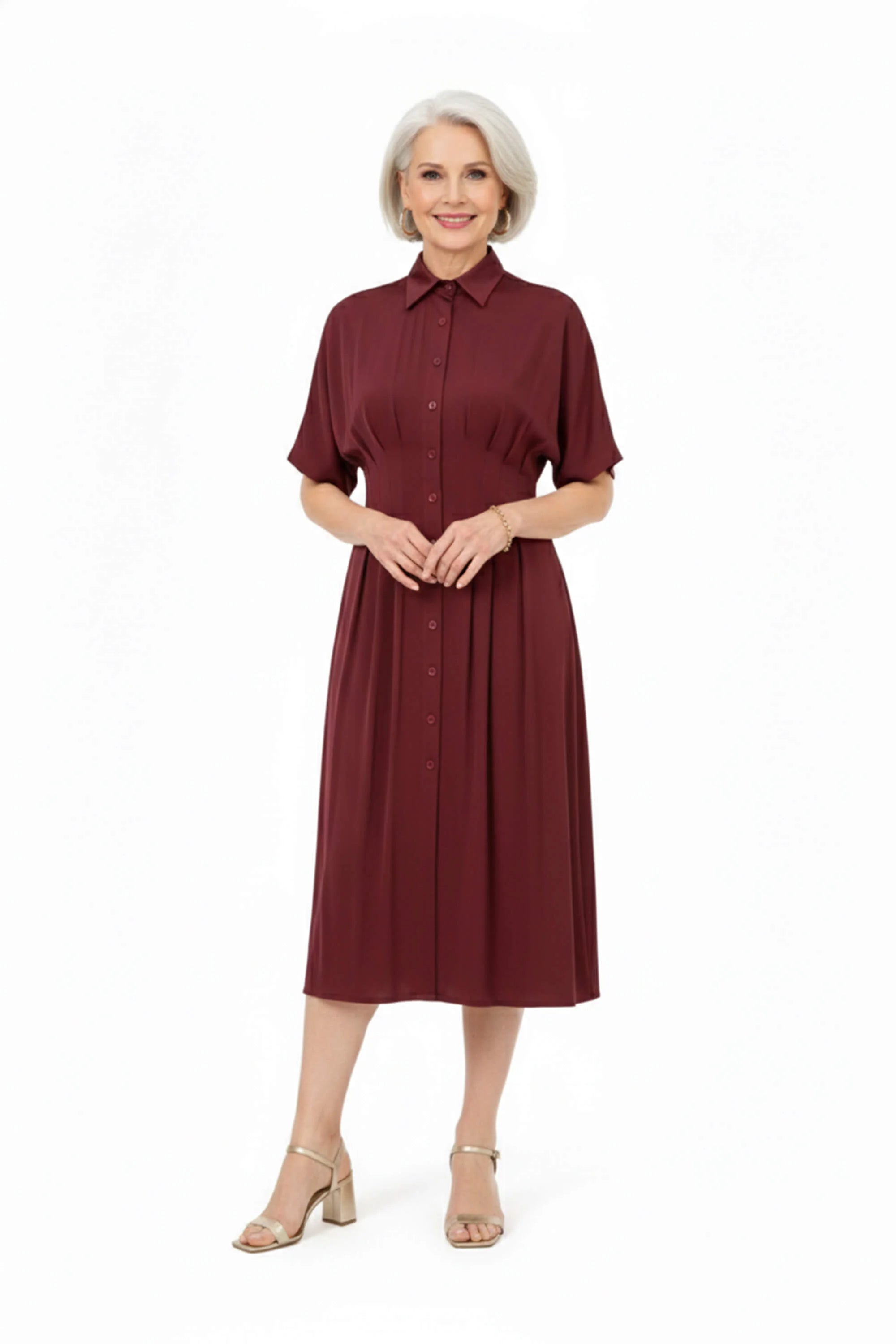 Este vestido destaca por su refinada silueta camisera con cuello de solapa, que aporta una estructura profesional y atemporal a la prenda. El punto focal de diseño es su cintura magistralmente plisada, con pliegues verticales que convergen en el talle para esculpir una figura de reloj de arena antes de abrirse en una falda de corte A de gran movimiento. Presenta una botonadura frontal y mangas cortas de corte fluido que equilibran la sobriedad del cuello con una ligereza moderna.