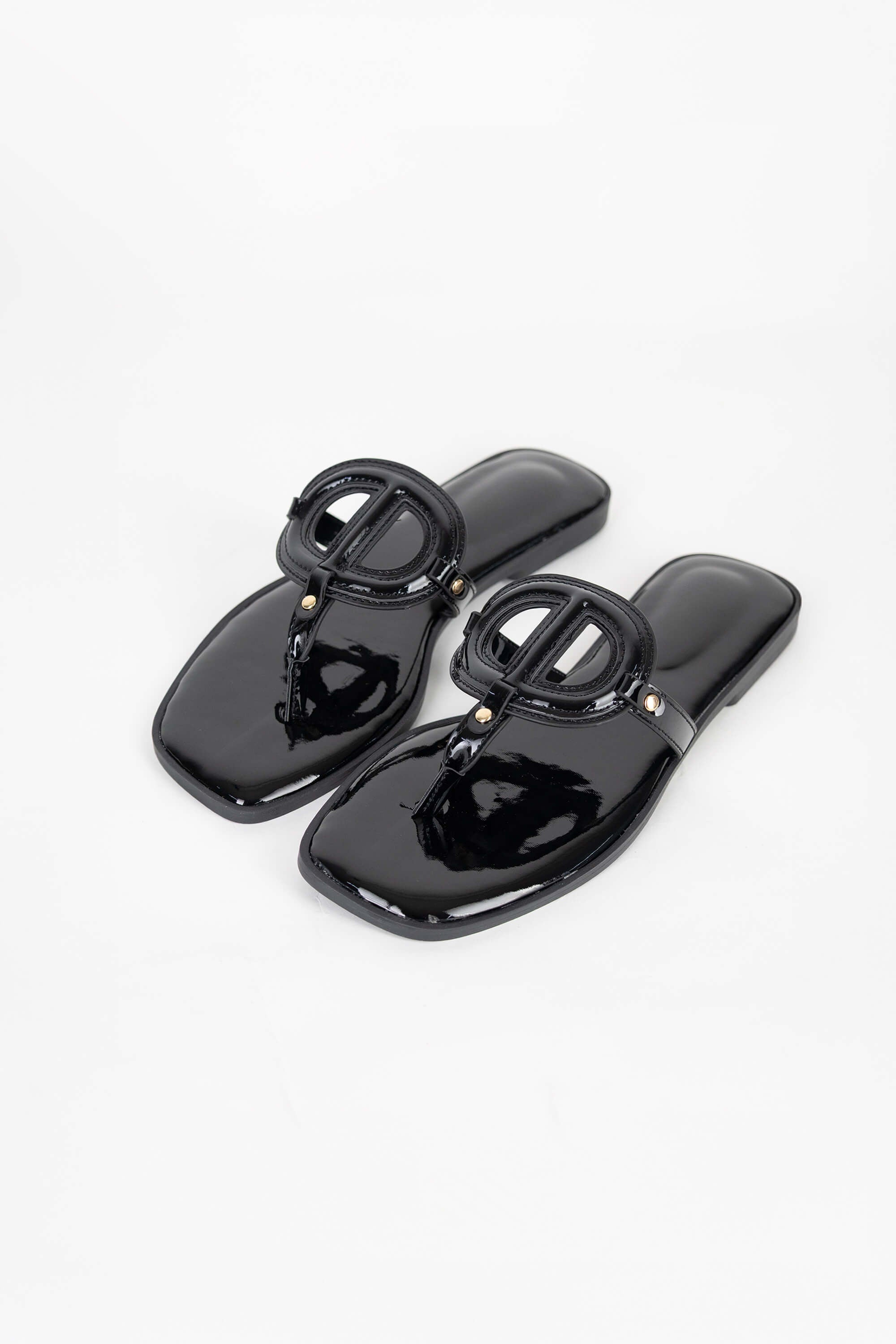 El modelo ofrece un ajuste ergonómico con una tira suave entre los dedos, diseñada para evitar fricciones y proporcionar confort durante todo el día. La plantilla cuenta con un ligero acolchado que mejora la experiencia de uso, mientras que el contraste entre el charol negro y los herrajes dorados define estas sandalias como un esencial indispensable para la mujer moderna que busca piezas de inversión que funcionen tanto con bikinis como con vestidos de lino.
