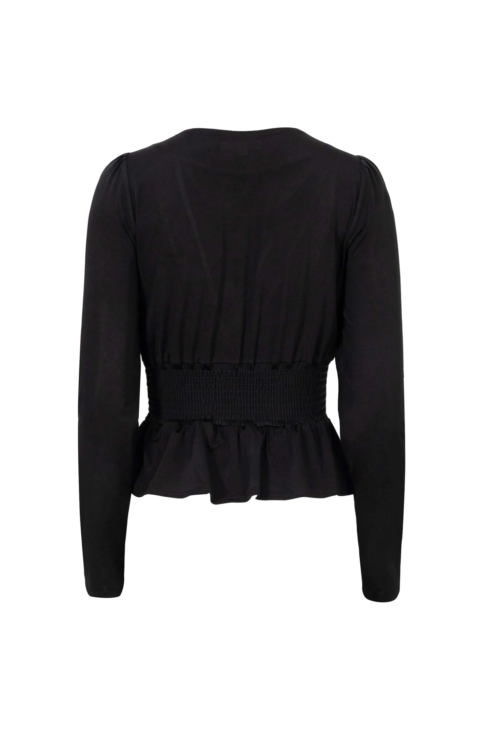 La blusa negra con escote “V” de Reina Díaz encarna la elegancia atemporal. Su diseño con olán en ruedo y mangas mutton leg crea una silueta refinada que combina perfectamente con looks formales o de noche.