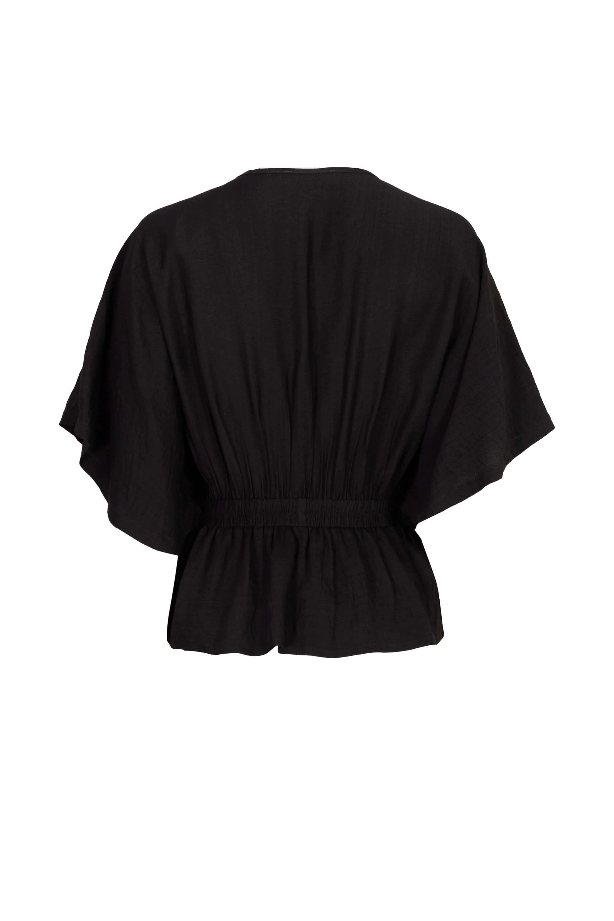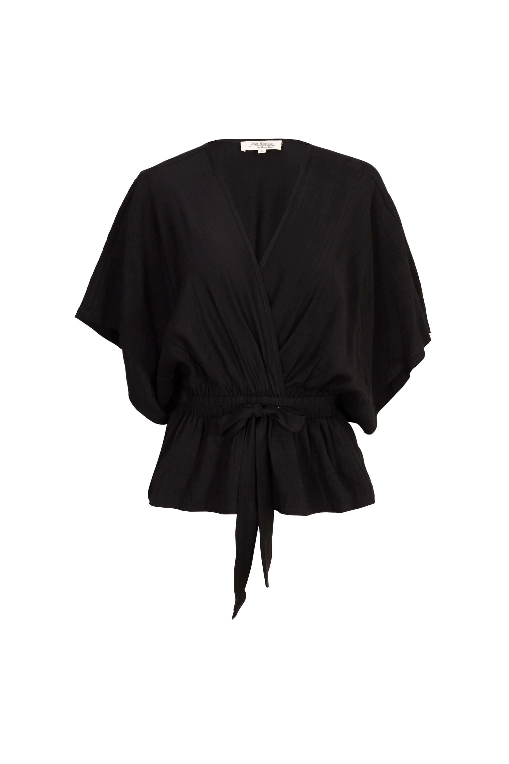 Esta blusa de manga murciélago con escote cruzado encarna la esencia de la elegancia relajada con una silueta que envuelve con gracia y ligereza. El diseño envolvente en la parte superior crea un efecto visual que estiliza el torso, mientras que el cinturón del mismo textil define la cintura con naturalidad.
