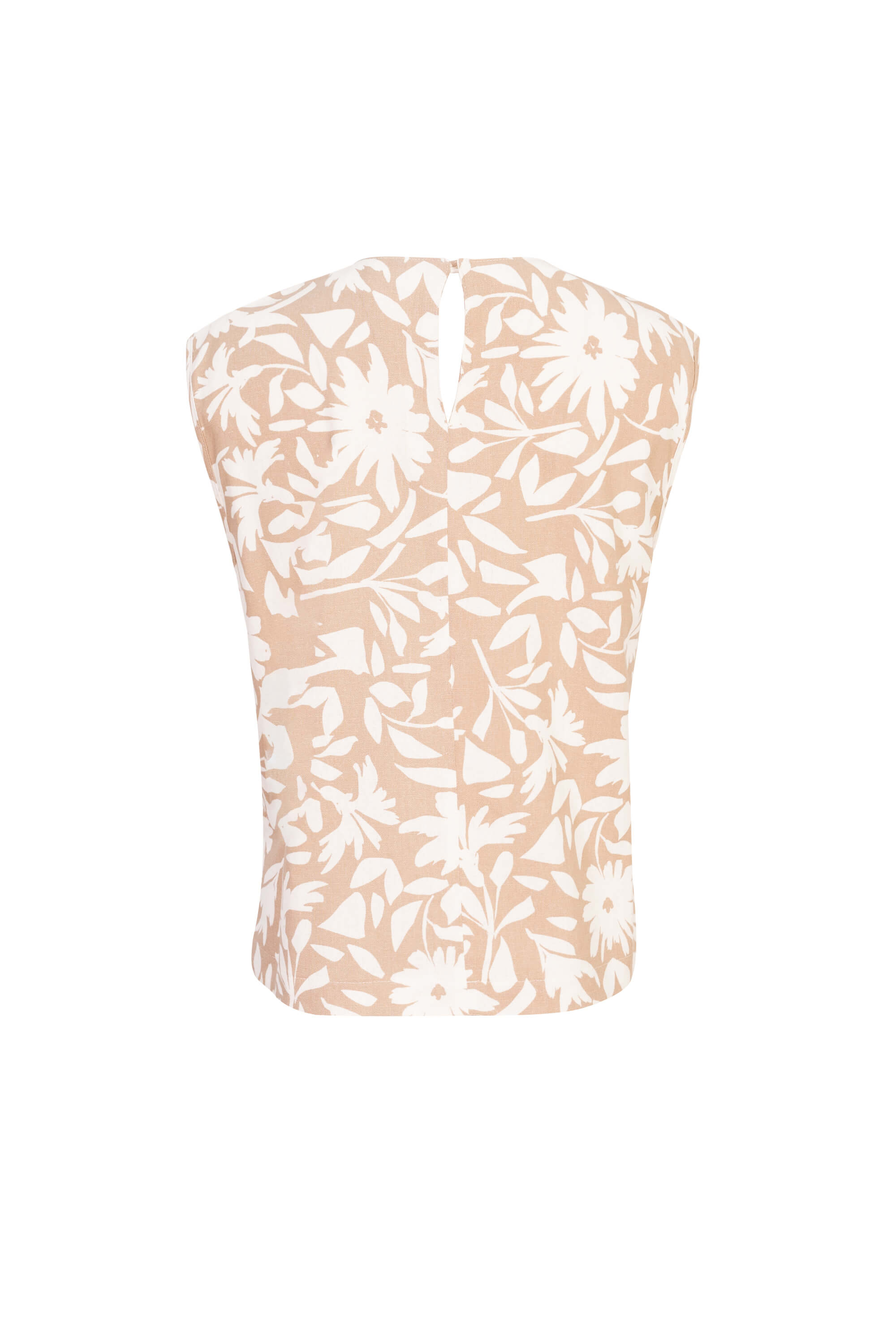 Confeccionada en tejido ligero y suave, esta blusa sin mangas presenta un corte clásico con escote básico y cartera al frente. Su estampado floral beige sobre fondo blanco aporta un toque moderno y veraniego, perfecto para outfits relajados y sofisticados.