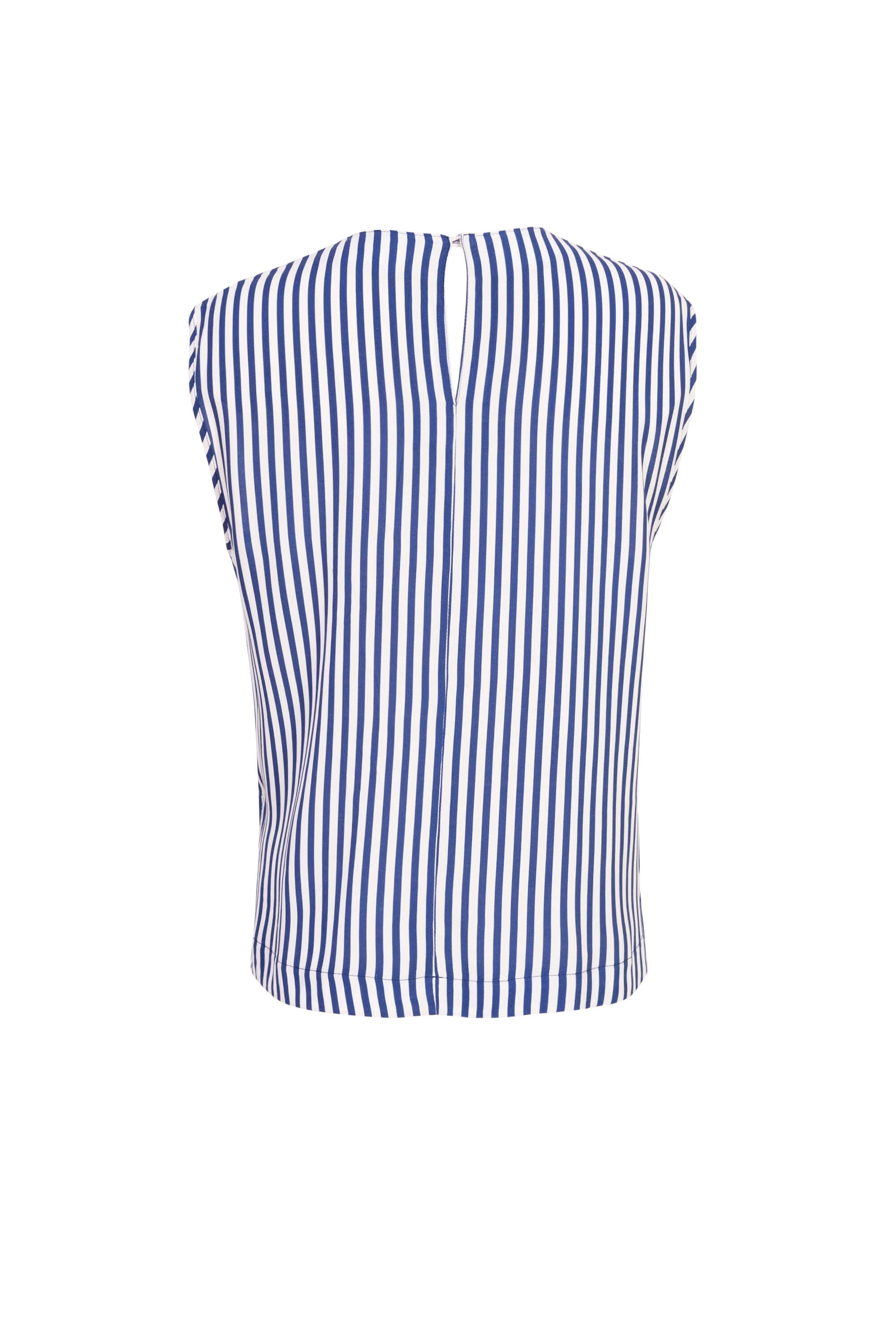 Elaborada en tejido de alta calidad con un patrón de rayas verticales, esta blusa sin mangas presenta un escote básico y una cartera frontal que aporta estructura y estilo contemporáneo. Su corte recto y fresco la convierte en una prenda ideal para combinar con pantalones o faldas de temporada.