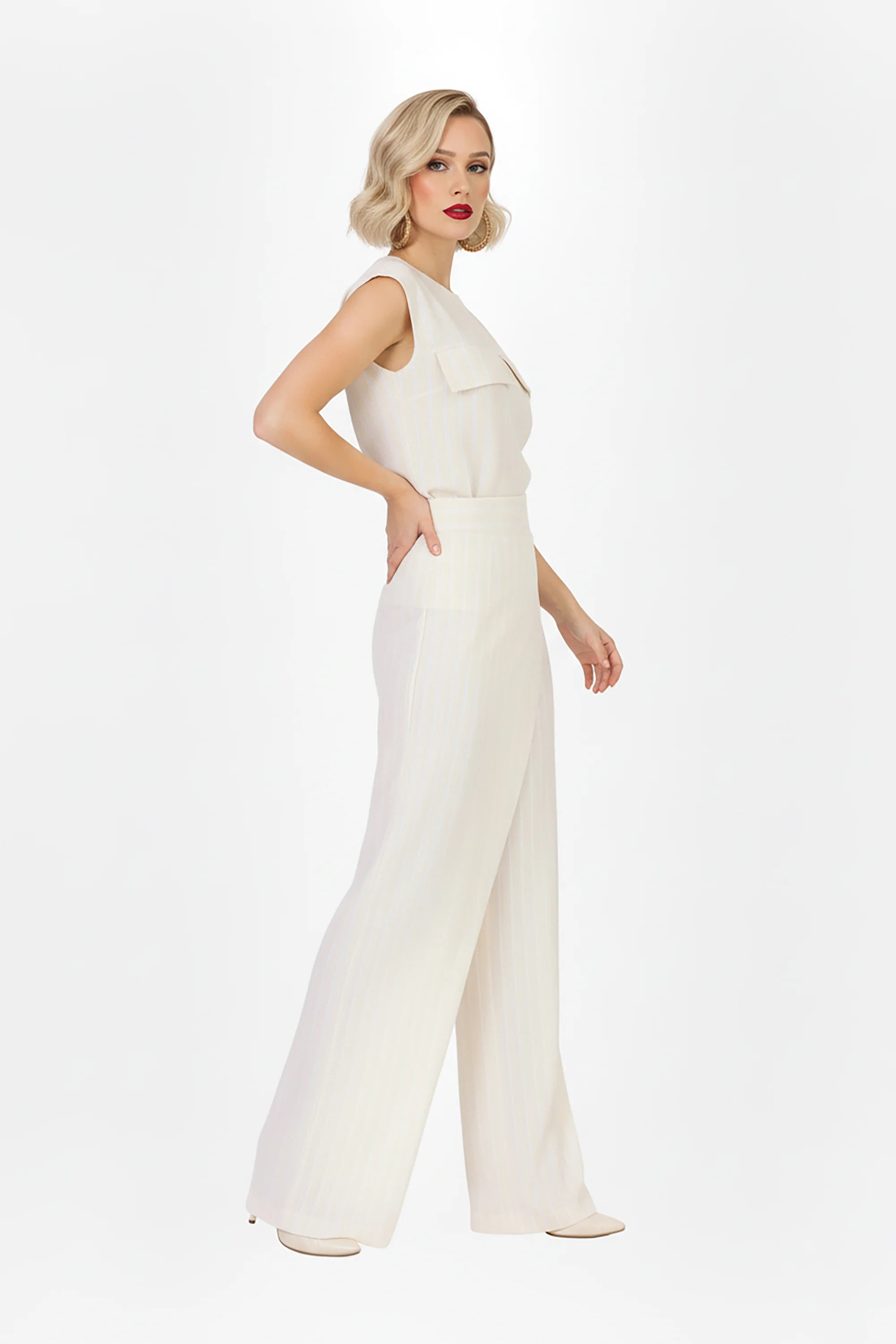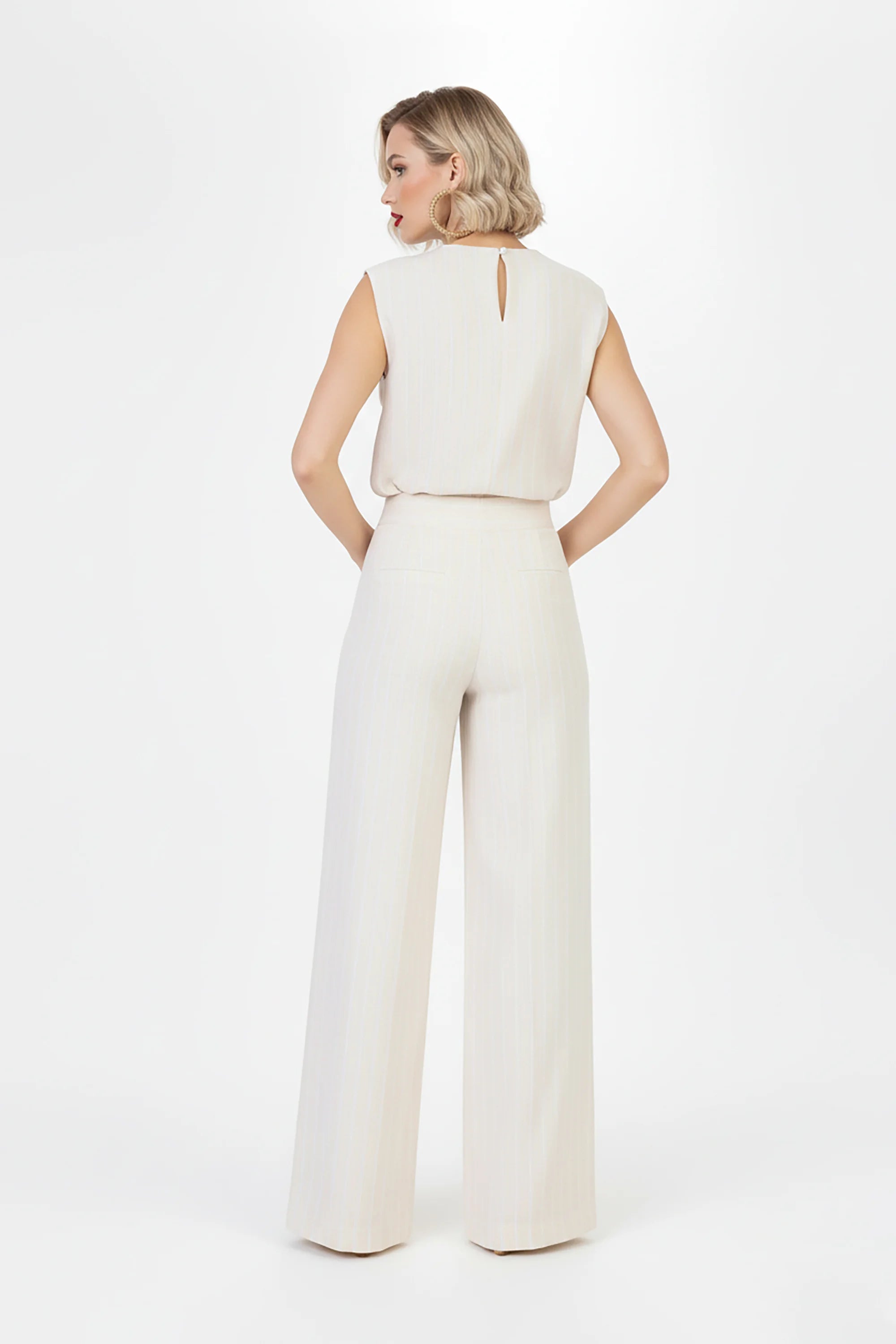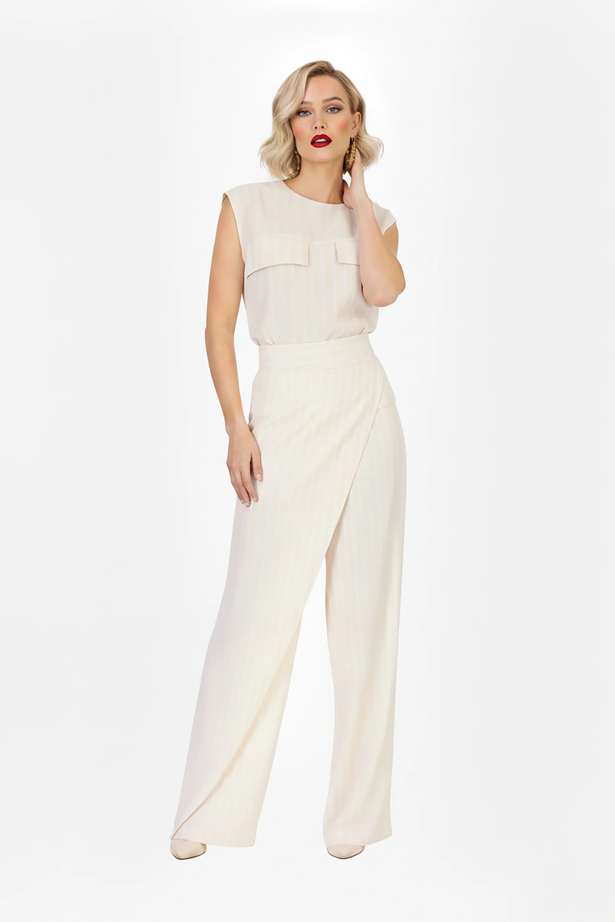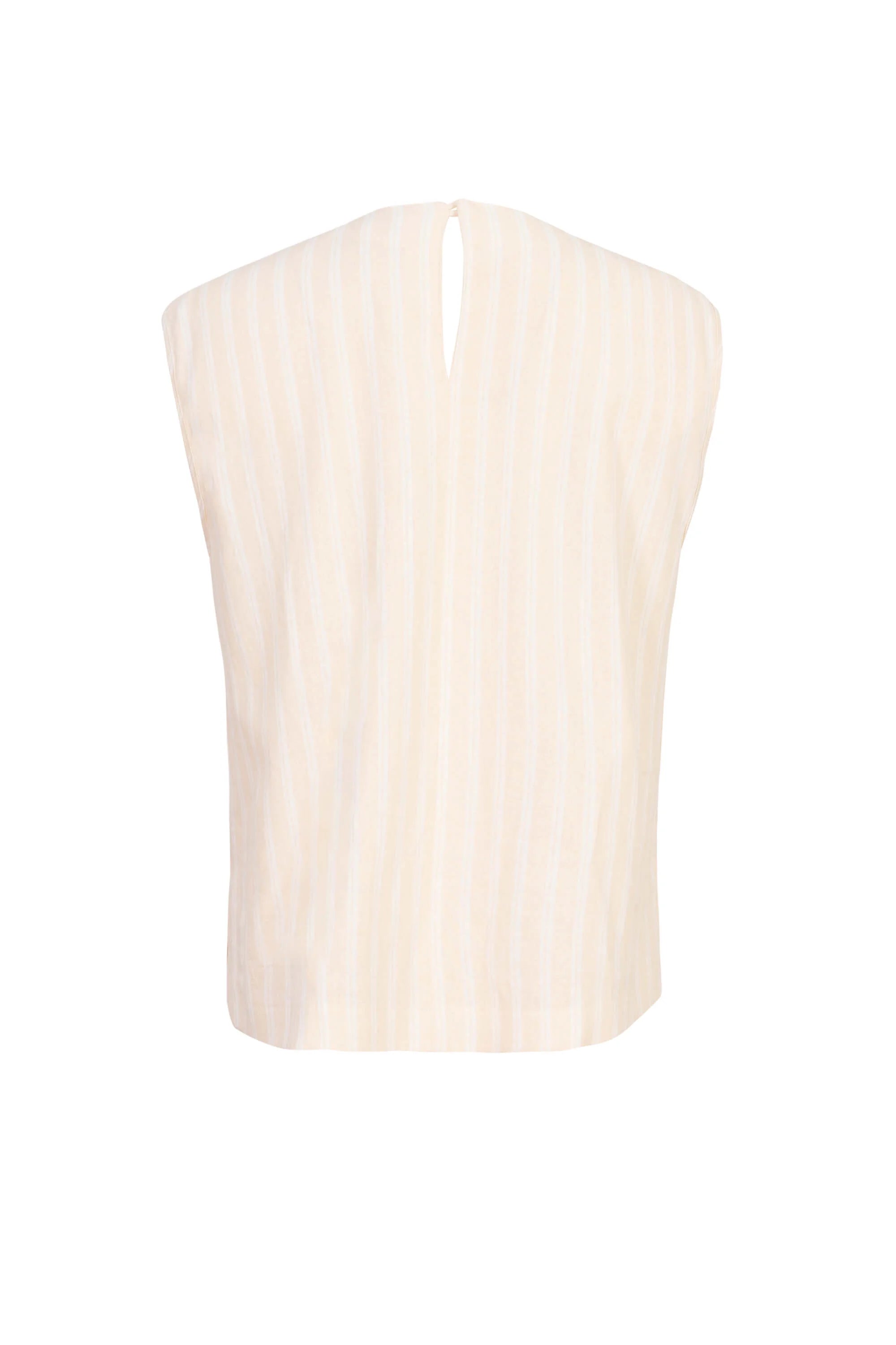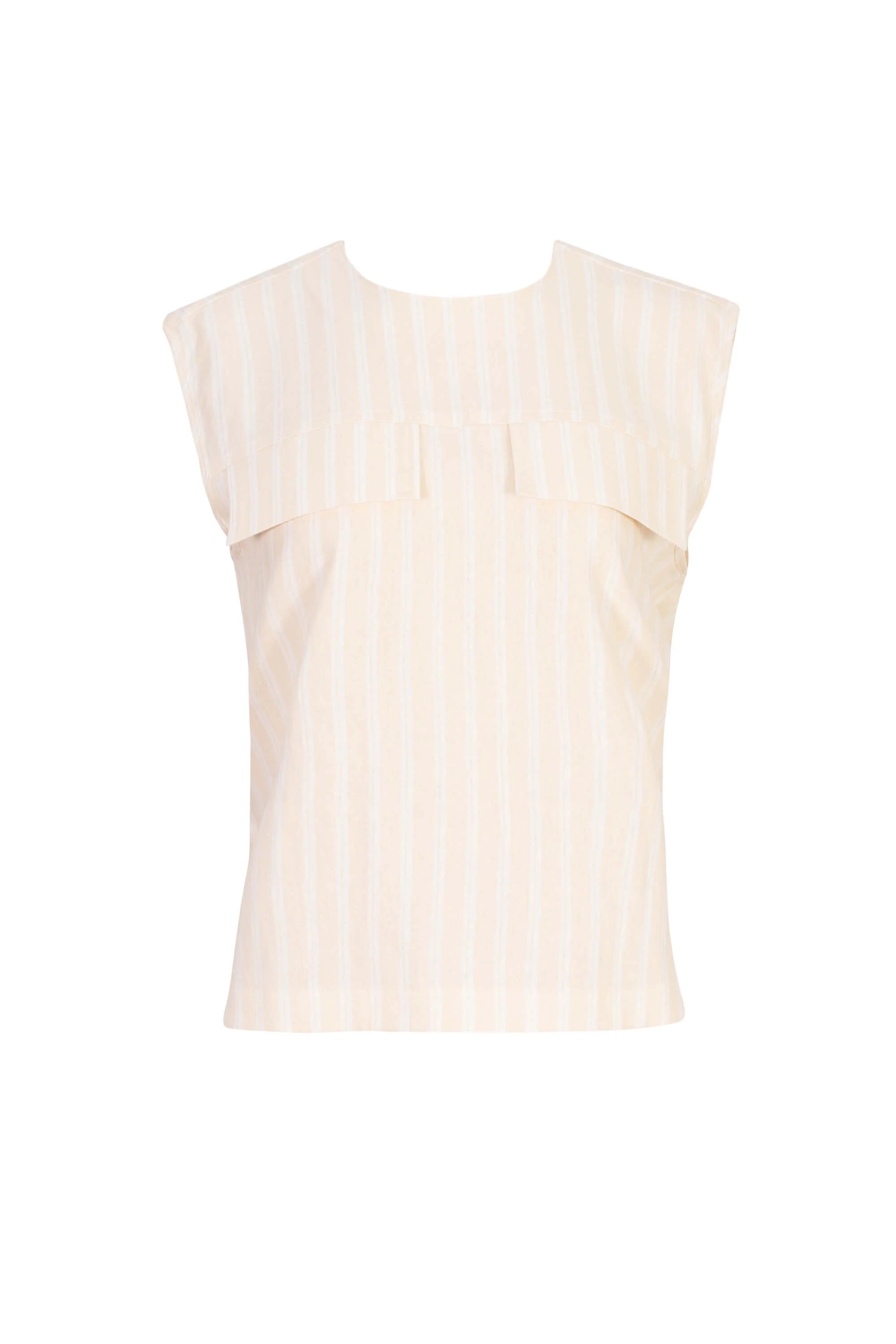 Elaborada en tejido de alta calidad con un patrón de rayas verticales, esta blusa sin mangas presenta un escote básico y una cartera frontal que aporta estructura y estilo contemporáneo. Su corte recto y fresco la convierte en una prenda ideal para combinar con pantalones o faldas de temporada.