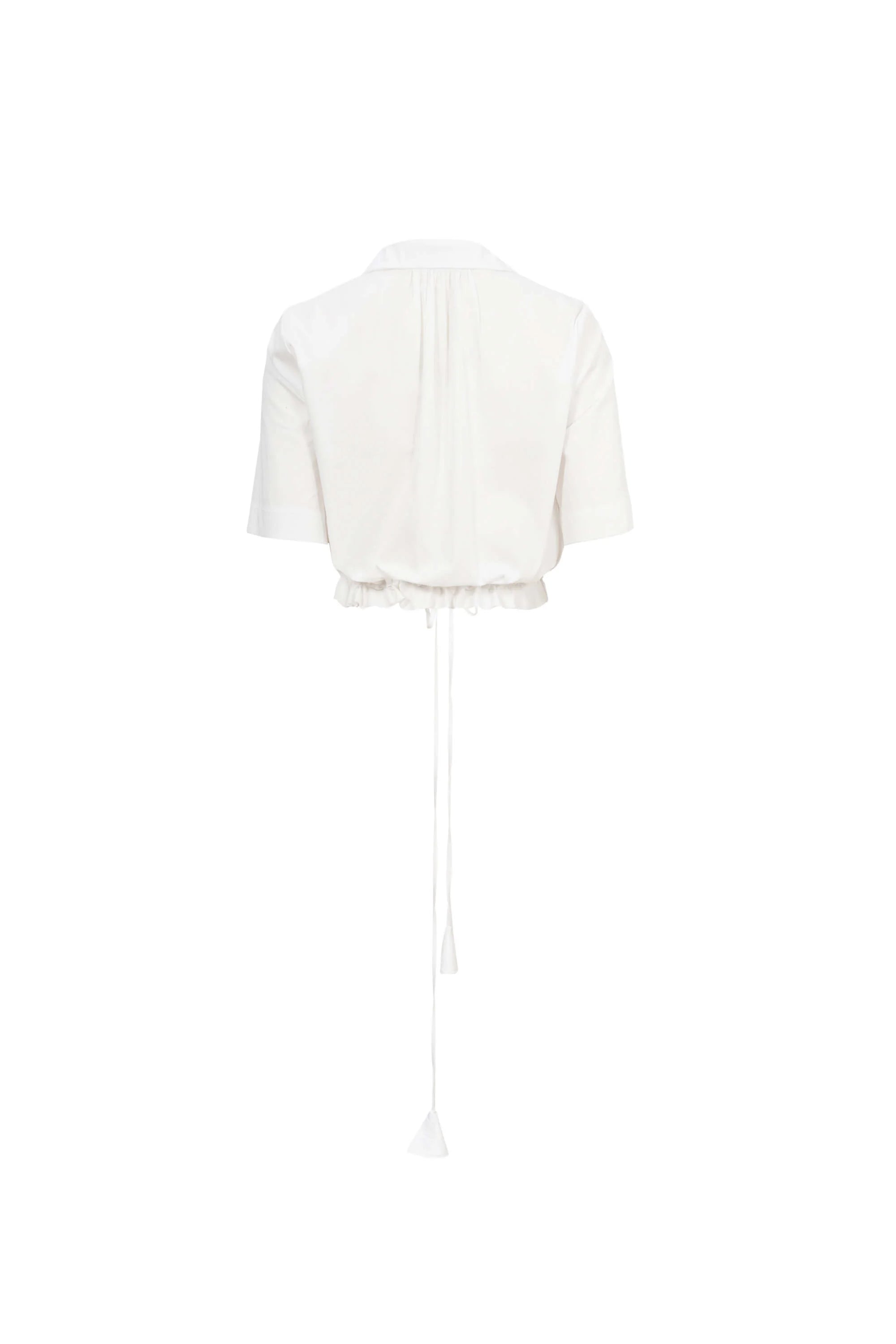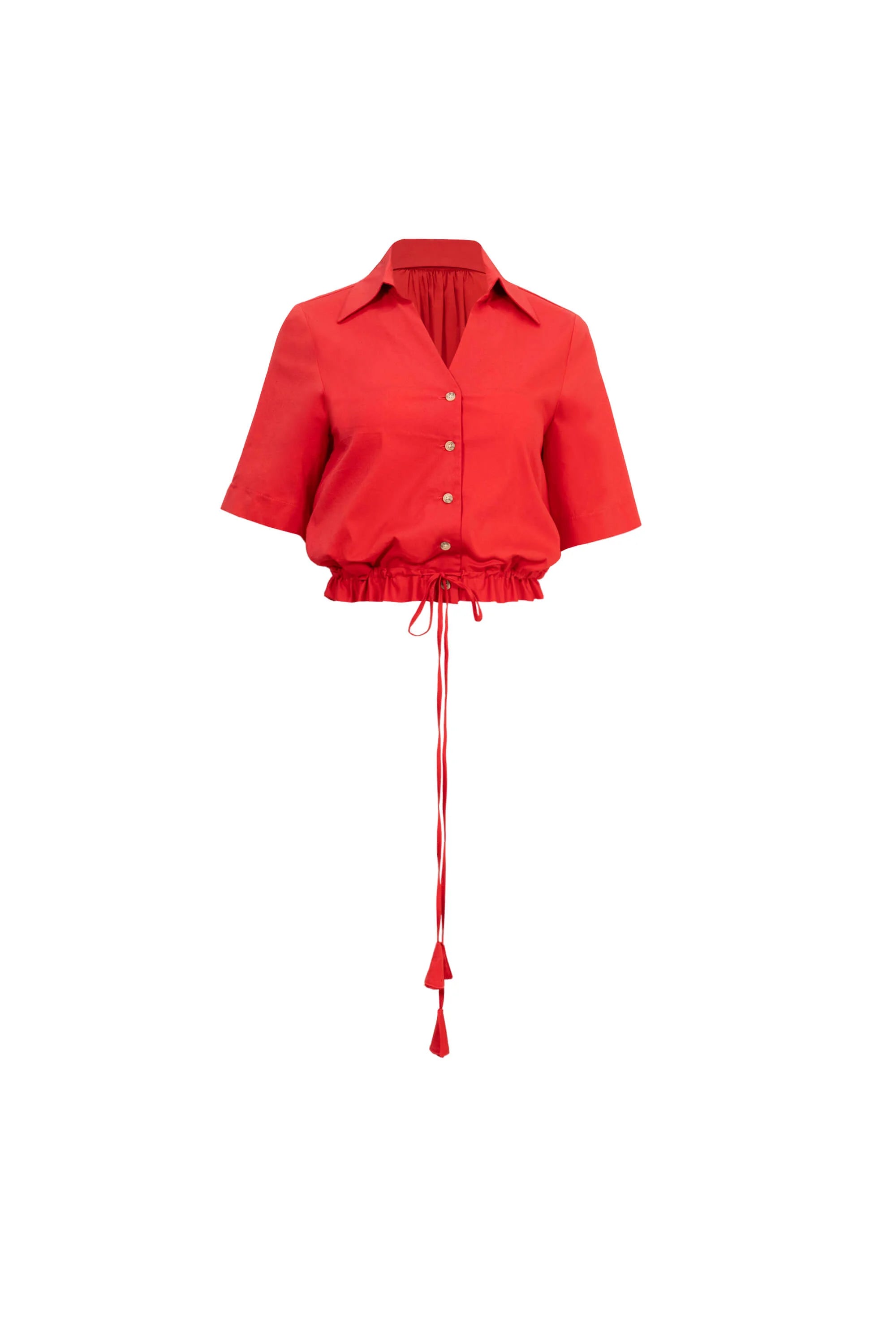 Blusa de manga corta con diseño fresco y versátil. Presenta cuello clásico y cierre frontal con botones pequeños, acompañada de un cordón ajustable en la cintura que permite definir la silueta. El bajo fruncido con terminaciones en borlas decorativas aporta un detalle distintivo y moderno. Su confección ligera la convierte en una prenda ideal para climas cálidos y looks casuales con estilo relajado.