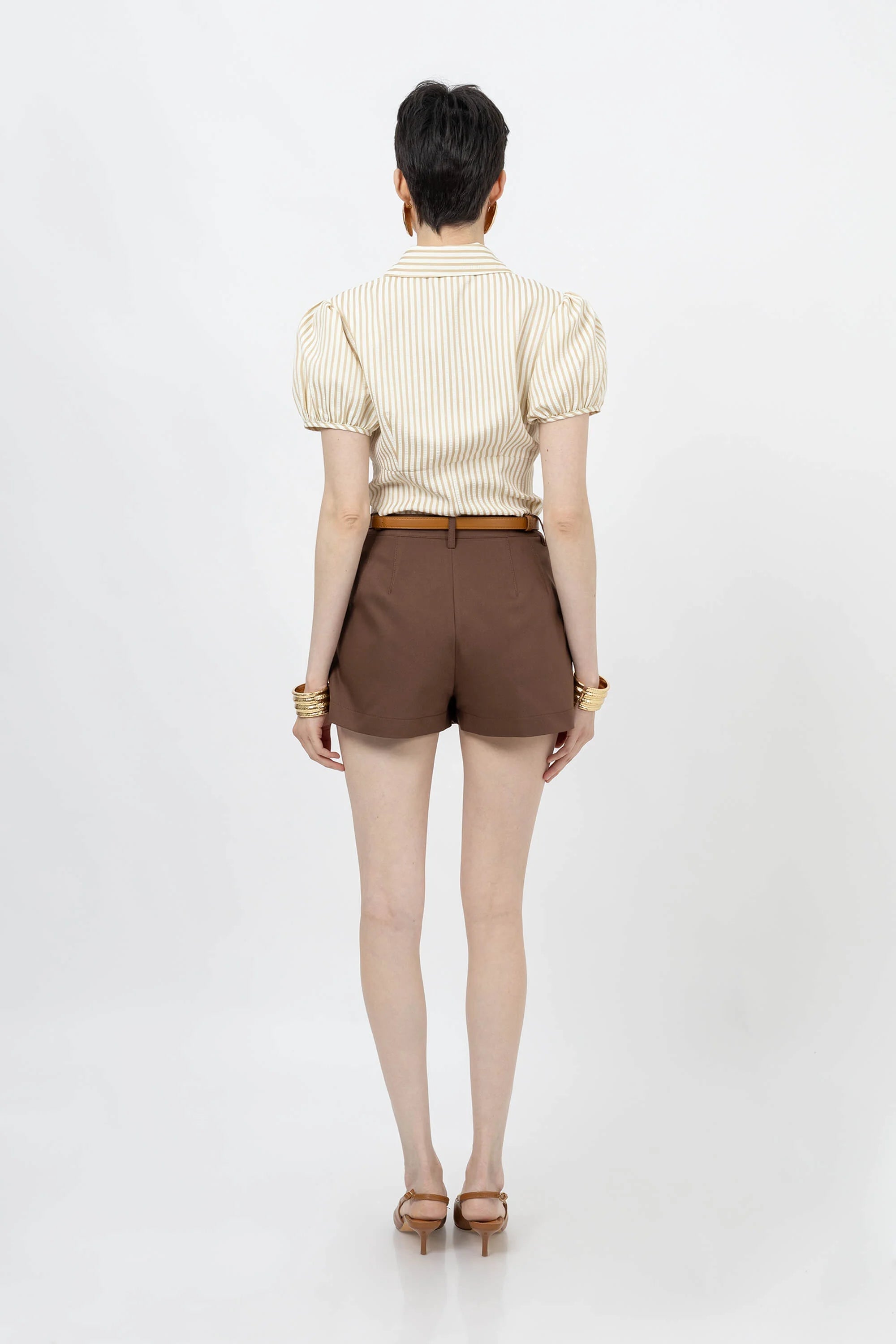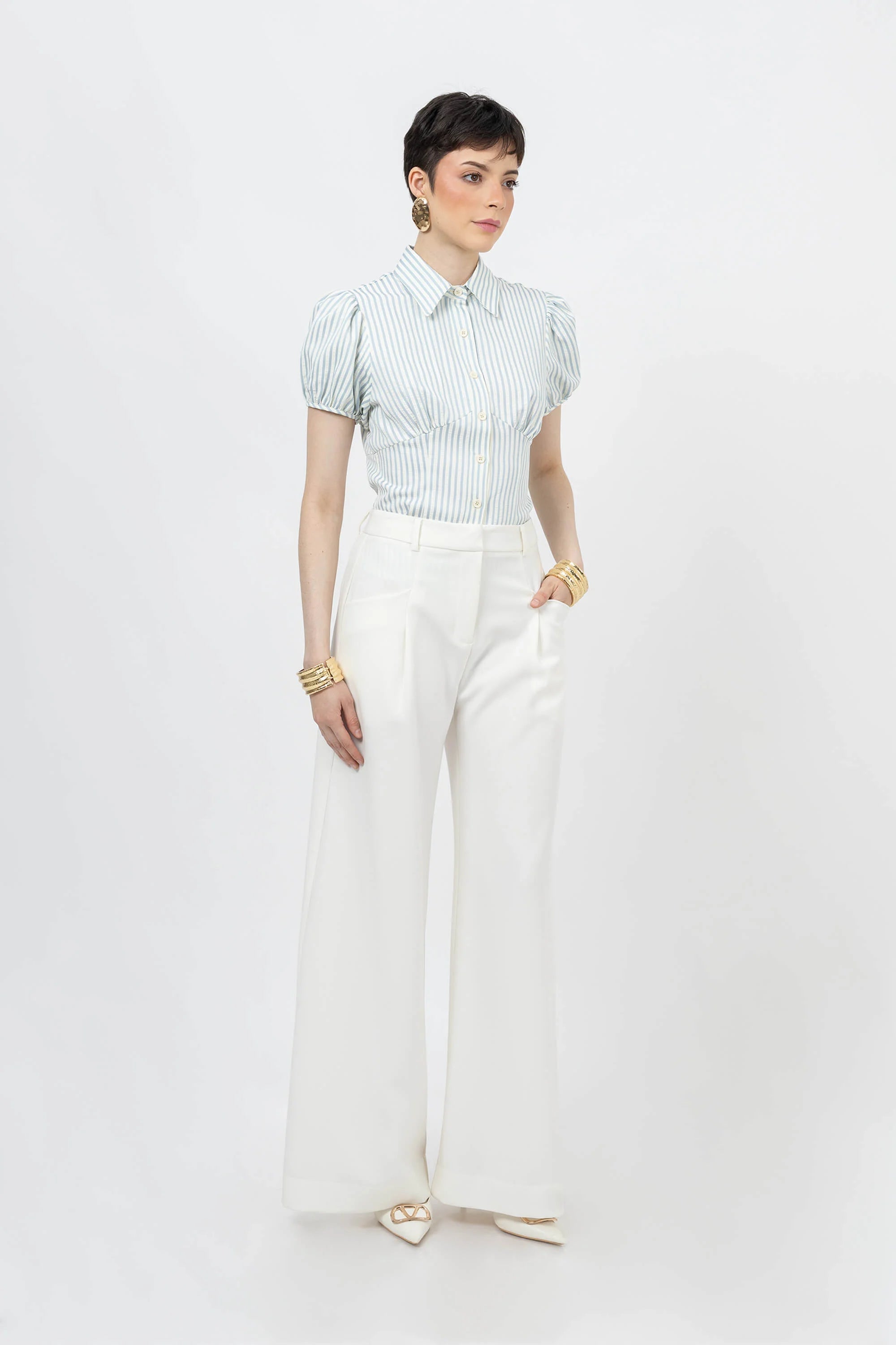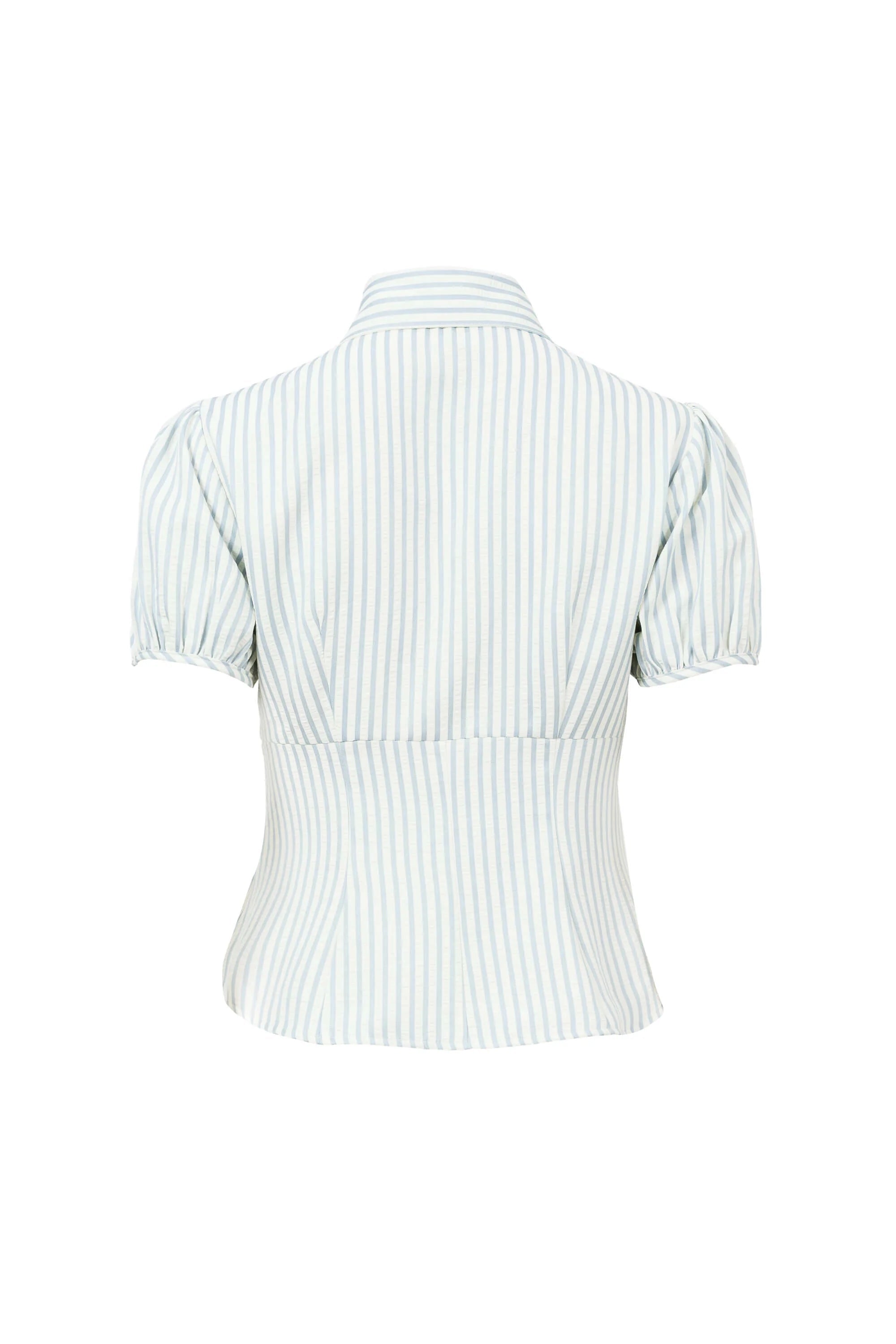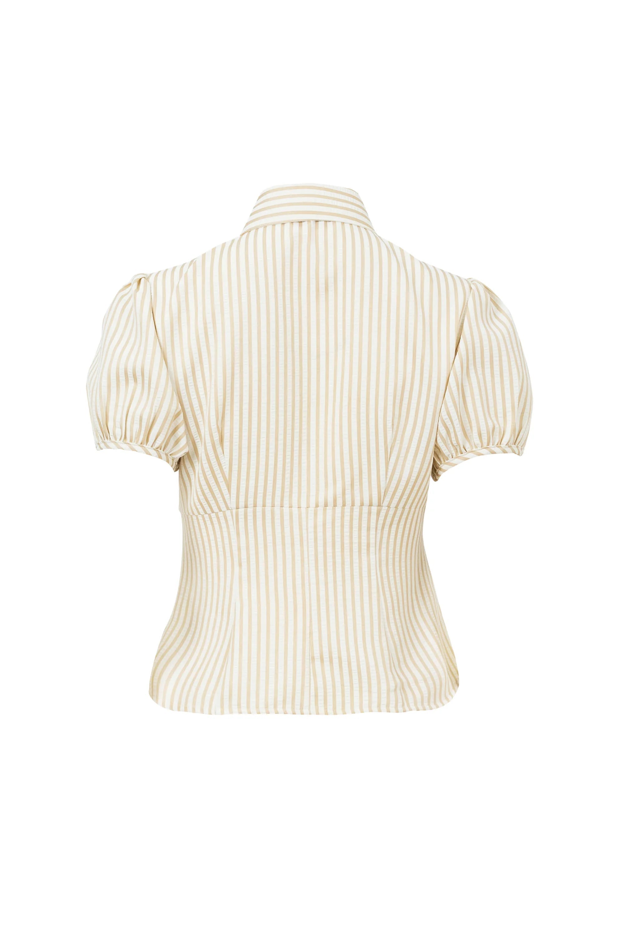 Blusa de manga corta con cuello clásico, botones frontales y mangas abullonadas con textura sutil.