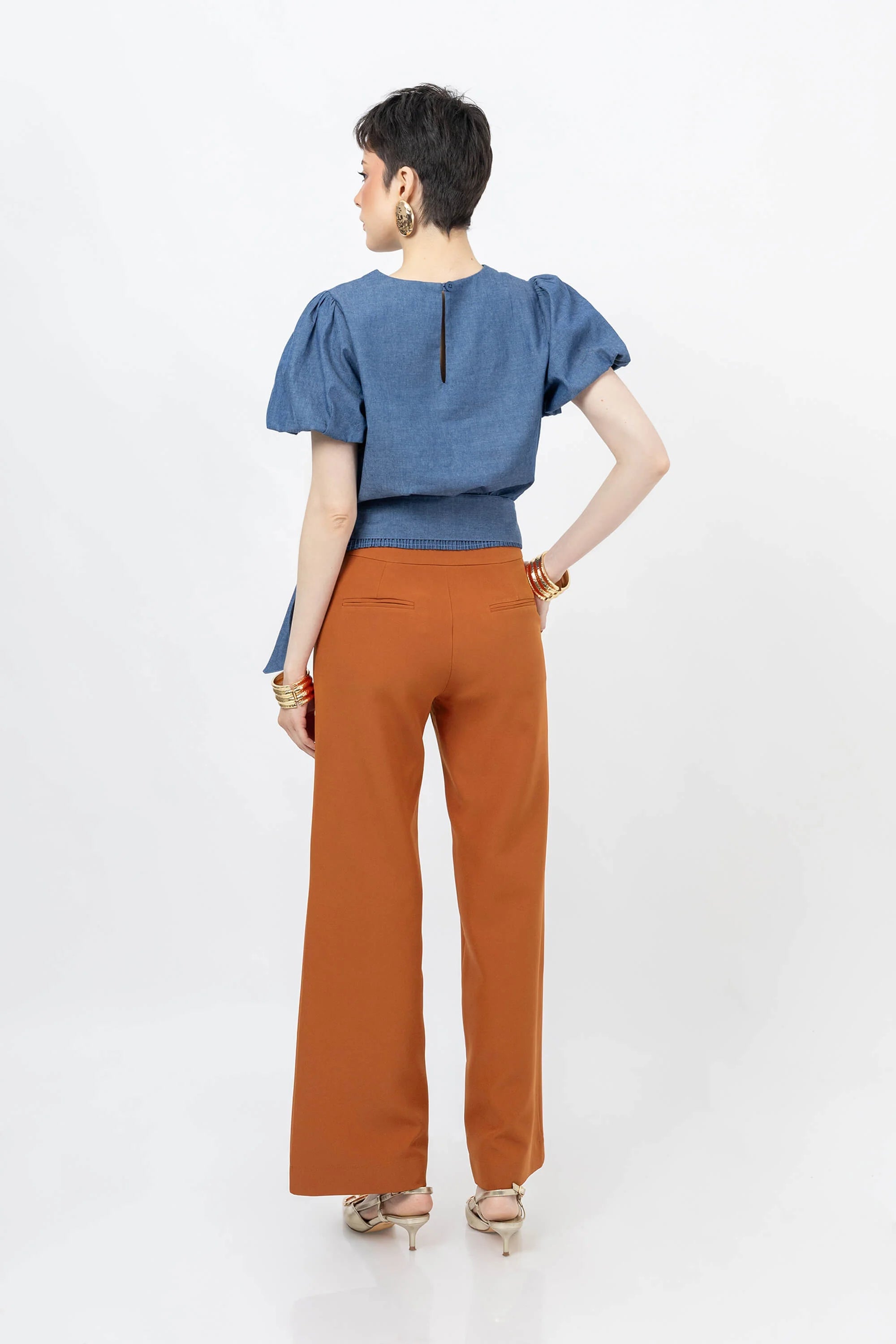 Blusa de manga corta con diseño estructurado y detalles decorativos que realzan la silueta. Presenta escote redondo con abertura vertical discreta, mangas abullonadas que aportan volumen en los hombros, y cinturón ancho del mismo tejido que se anuda en la cintura con un lazo largo y fluido. El corte entallado y el acabado pulido del material la convierten en una prenda ideal para looks elegantes, modernos y versátiles.