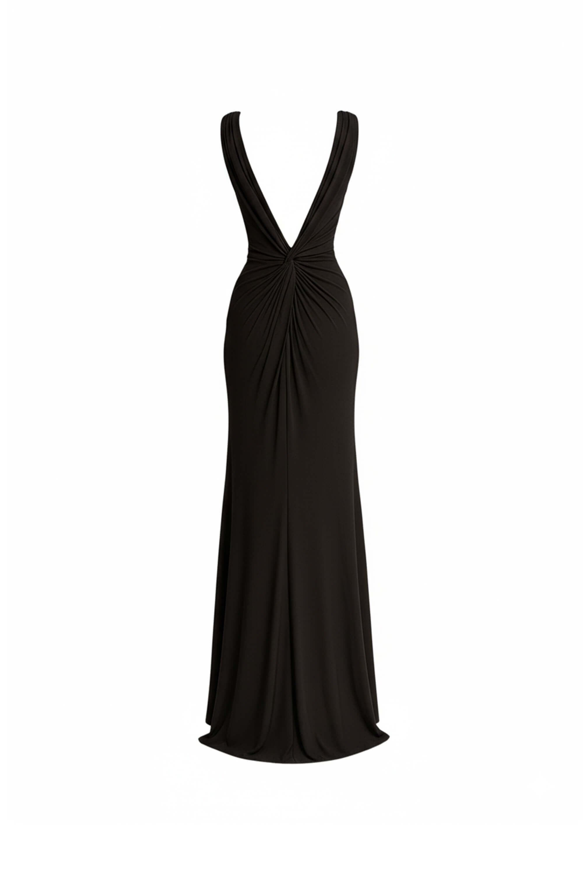 Este vestido destaca por su impecable silueta tipo columna con drapeado radial, diseñada para proporcionar una imagen alargada y una sofisticación sin esfuerzo. El punto focal de diseño es su sofisticado detalle de nudo central (twist) en la cintura, del cual nacen pliegues orgánicos que esculpen el torso y la cadera de forma magistral. Se caracteriza por un atrevido escote en V profundo tanto en el frente como en la espalda, proyectando una imagen de lujo contemporáneo y una feminidad empoderada que redefine el vestido de noche clásico.