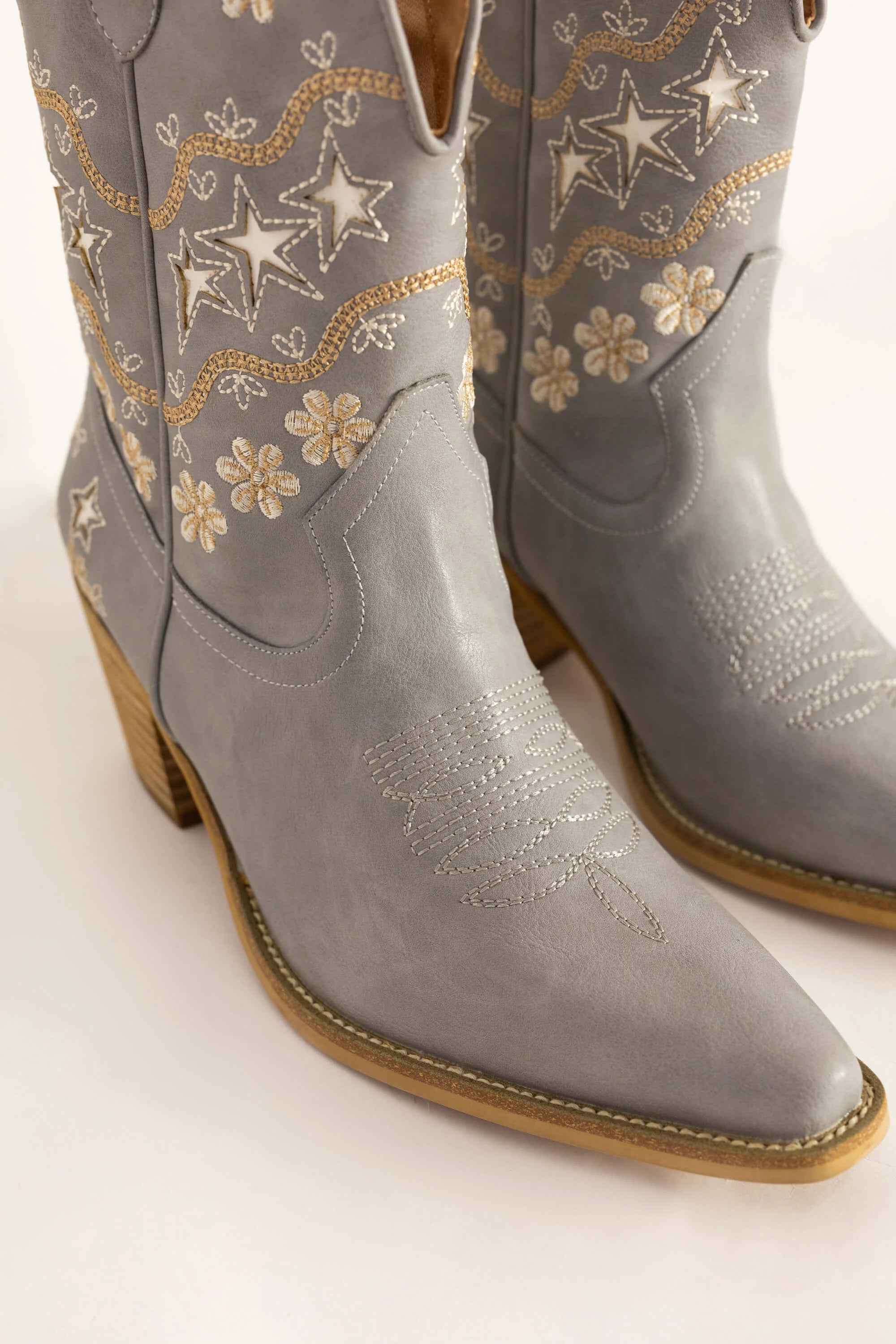 Bota alta con diseño bordado de hojas, punta fina y tacón medio