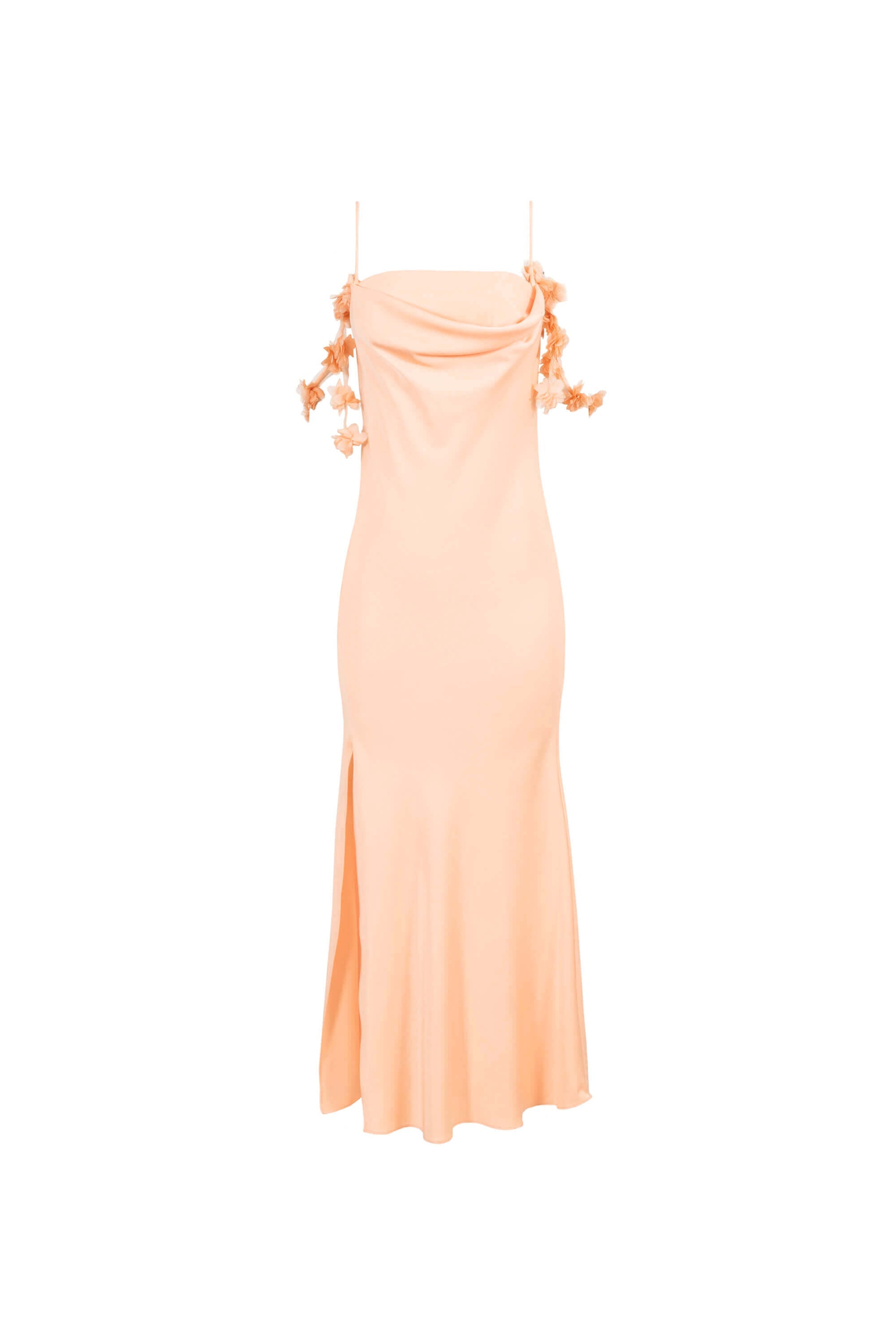 Este vestido largo destaca por su impecable escote drapeado tipo cowl neck, que aporta un volumen suave y una sofisticación atemporal al busto. El punto focal de lujo son sus tirantes delgados, adornados con una exquisita hilera de flores tridimensionales artesanales en el mismo tono, que añaden una textura romántica y un detalle de alta costura único. Presenta una silueta fluida que se desliza por el cuerpo, proyectando una elegancia minimalista y refinada.