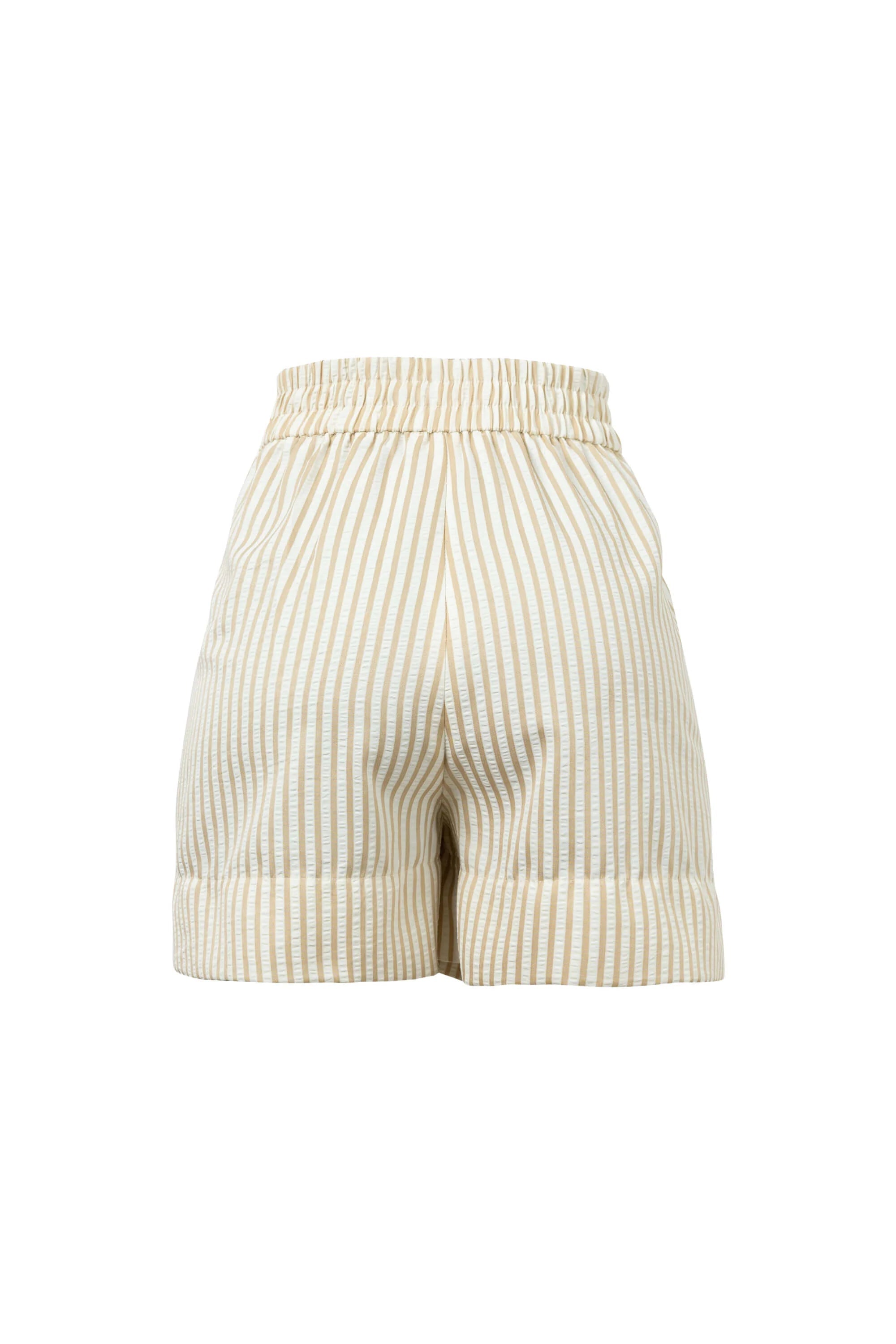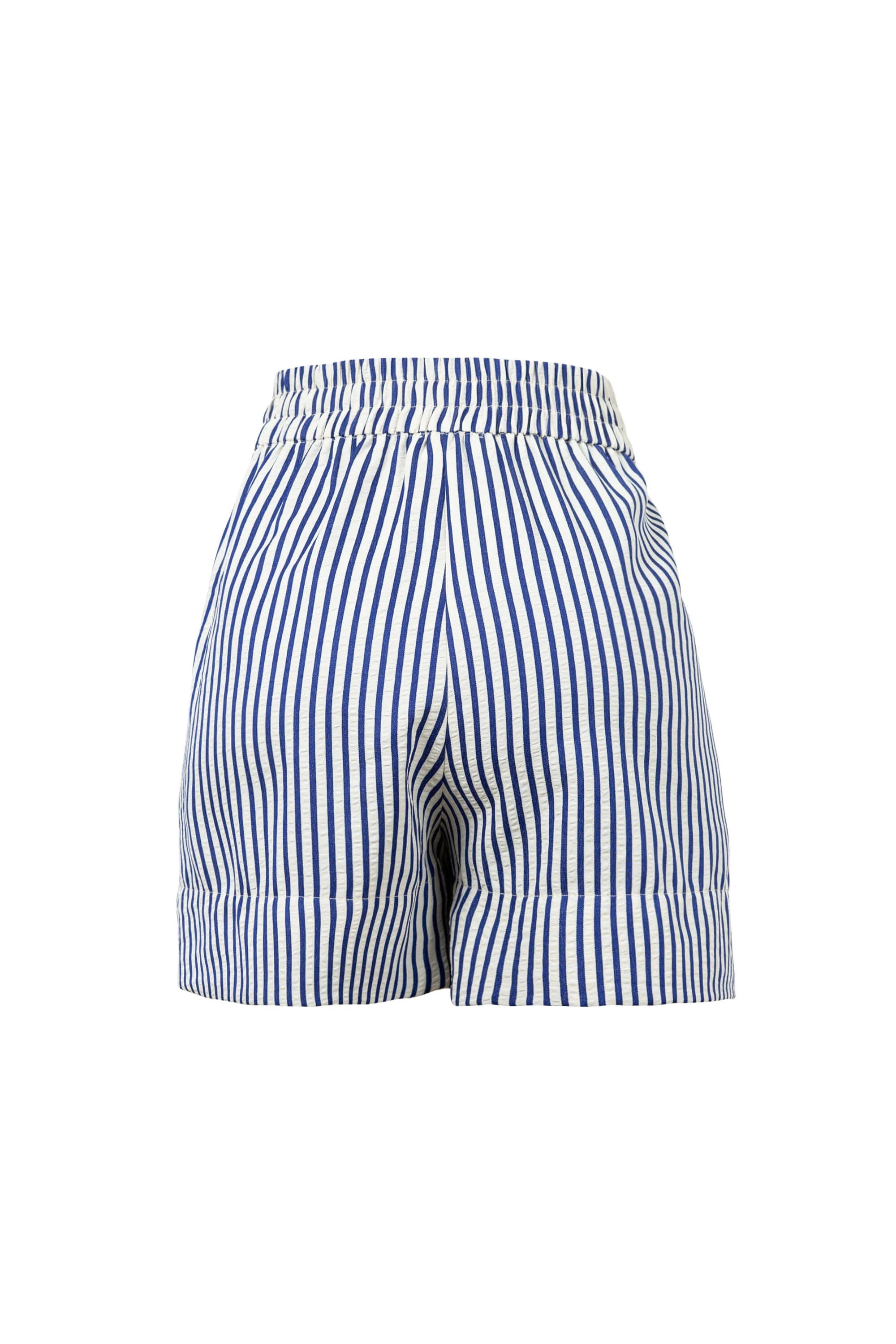 Short de tiro alto con silueta paperbag, diseñado para resaltar la cintura mediante un fruncido elástico en la parte superior. Presenta un patrón de rayas verticales que estiliza la figura y pinzas frontales que aportan un volumen equilibrado. El diseño se complementa con un dobladillo ancho con vuelta y un cinturón delgado de acabado sintético que añade un contraste de texturas elegante y funcional.