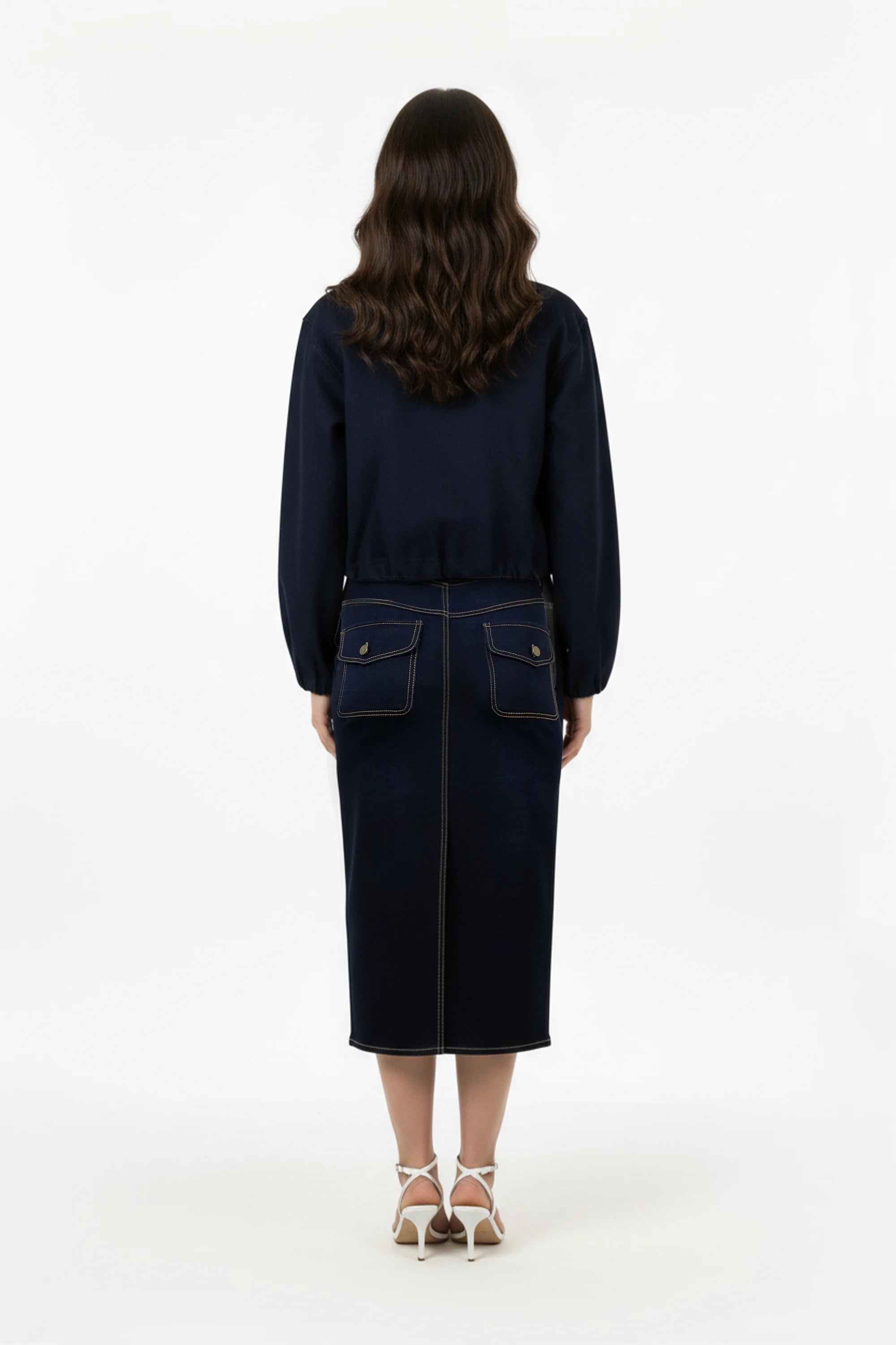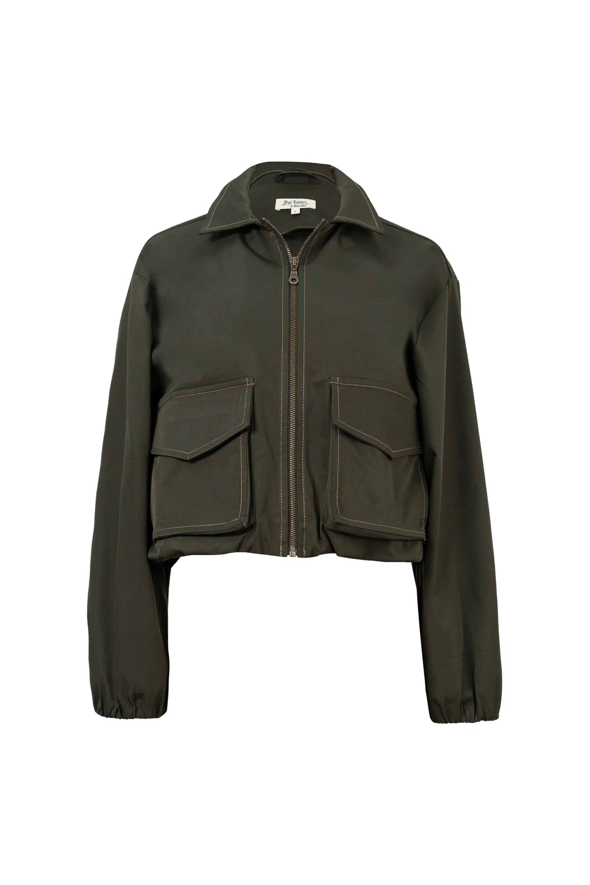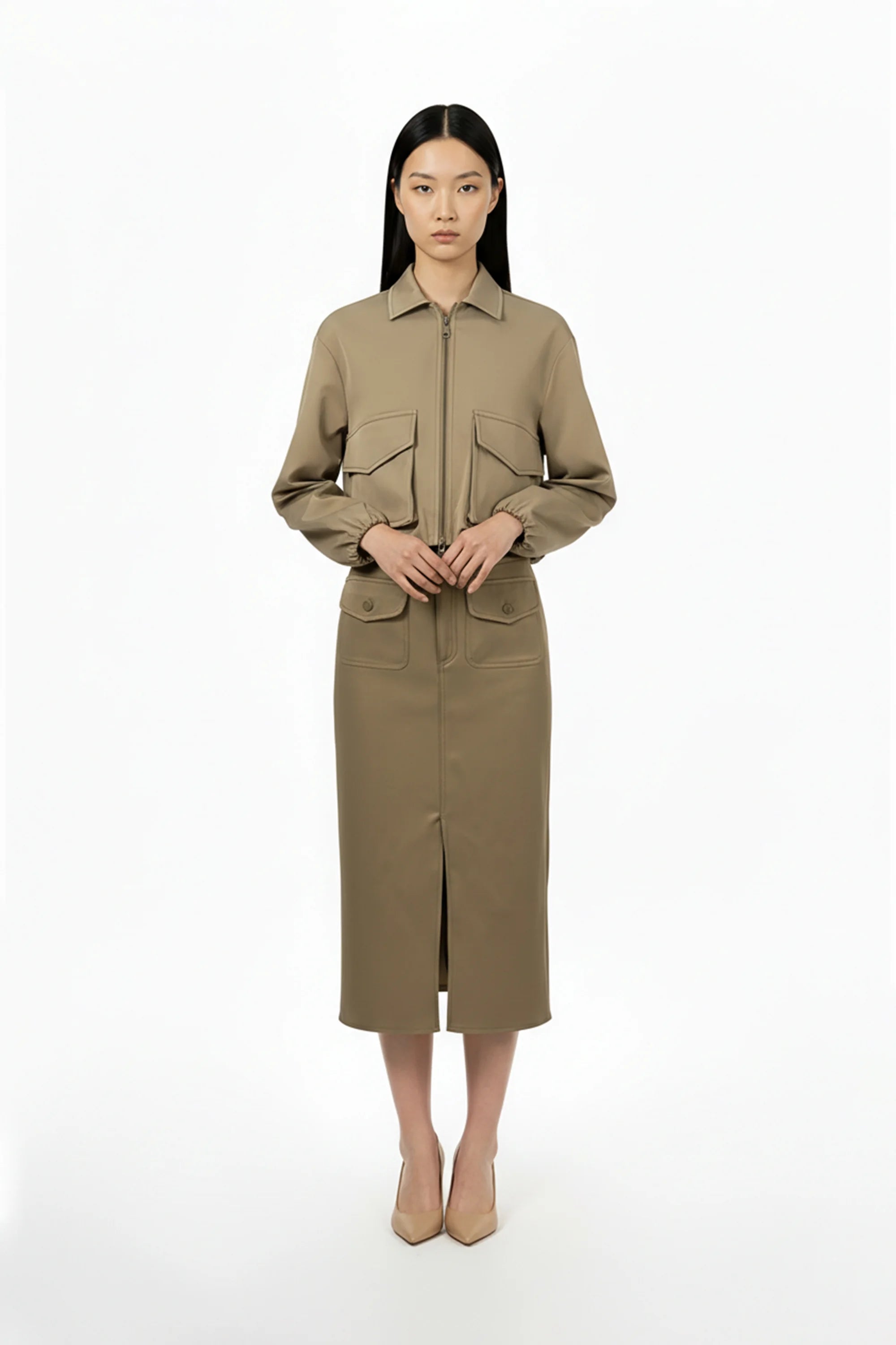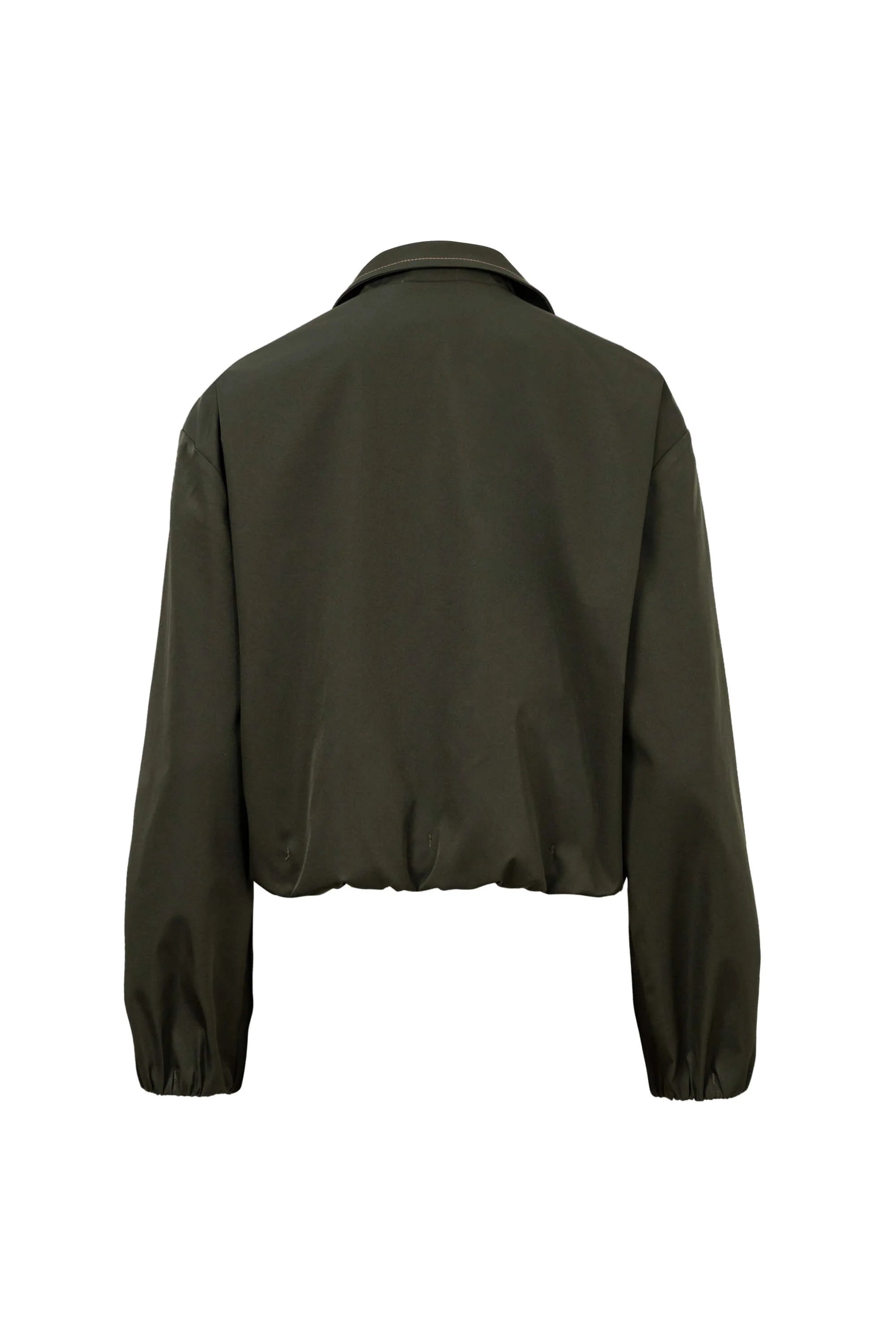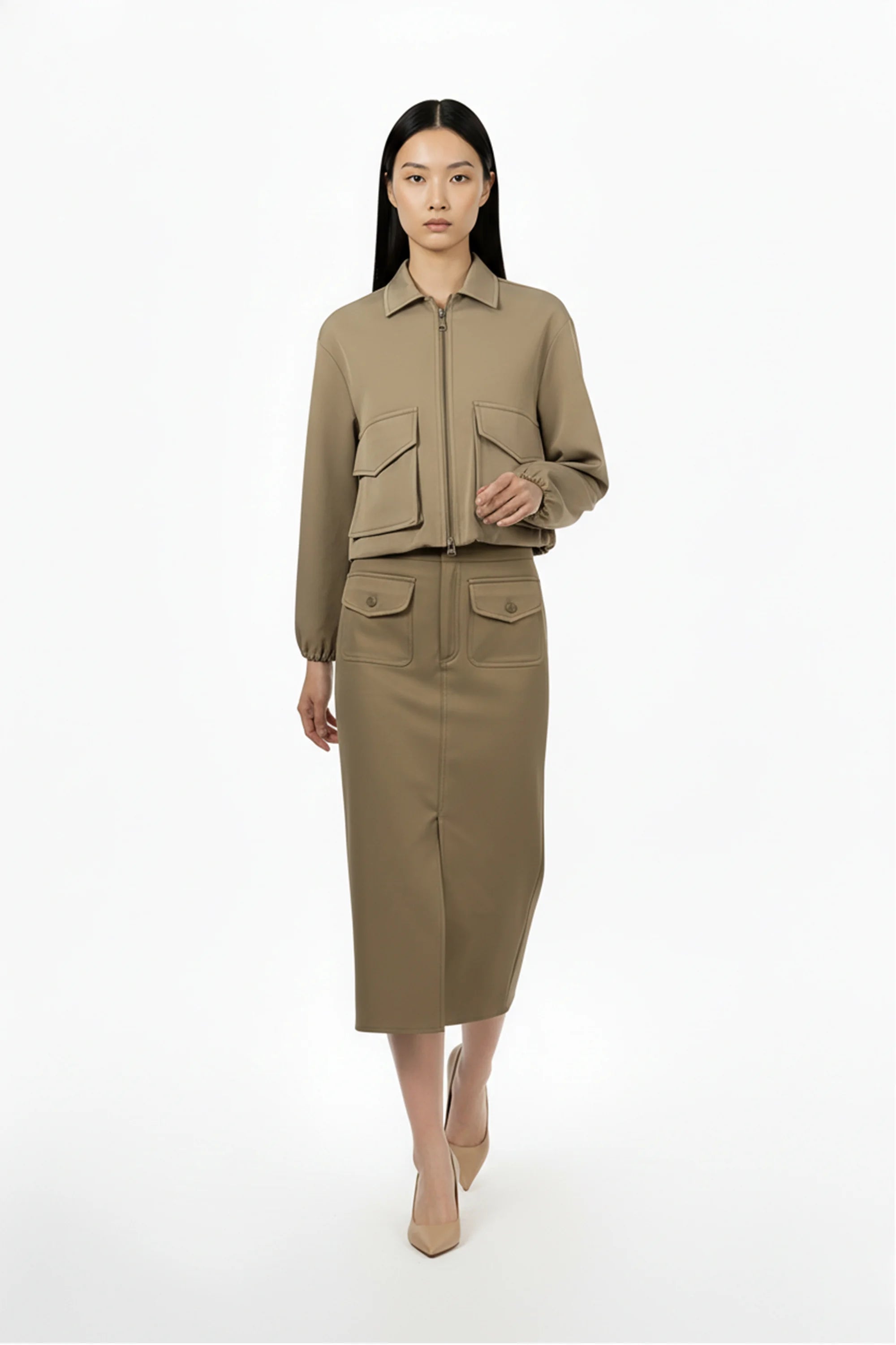 Esta chaqueta destaca por su moderna silueta de corte cropped y hombros caídos, que proyecta una imagen de elegancia relajada y vanguardista. El punto focal de diseño son sus dos amplios bolsillos de parche con solapa situados en el frontal, que aportan un carácter utilitario y una dimensión arquitectónica a la prenda. Se caracteriza por un cuello camisero clásico y una cremallera metálica central, junto con puños elásticos que crean un sutil volumen en las mangas.