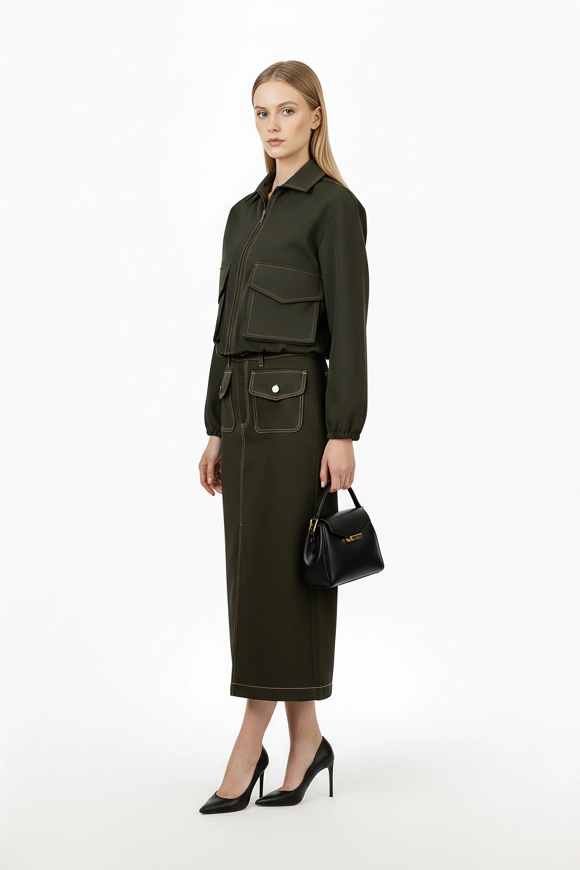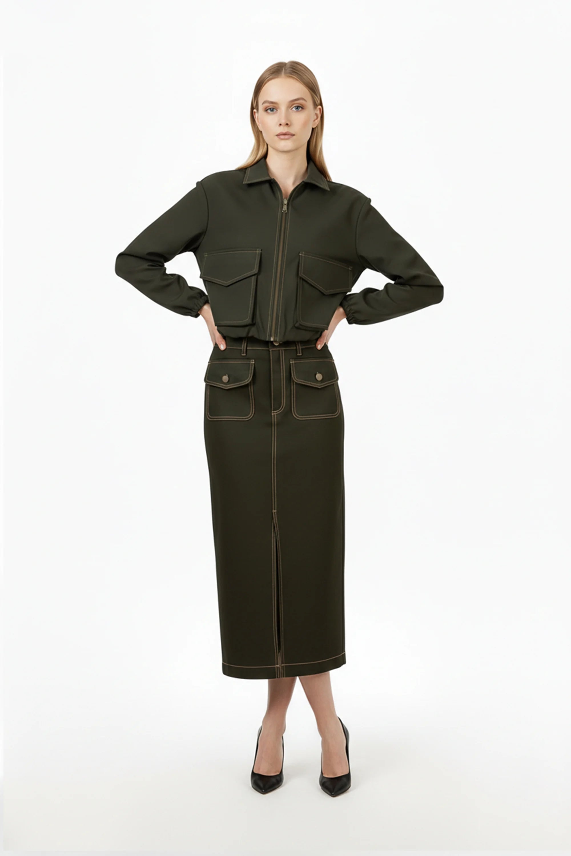 El modelo ofrece un ajuste de corte holgado y bajo elástico, diseñado para ceñirse ligeramente a la cintura y crear una silueta definida con un confort absoluto. Los acabados de alta gama, como el tirador de cremallera metálico y las costuras reforzadas en los bolsillos, definen esta prenda como un esencial de diseño de autor. Es la pieza ideal para la mujer que busca fusionar la practicidad de la moda cargo con una visión sofisticada y pulcra de la sastrería contemporánea.