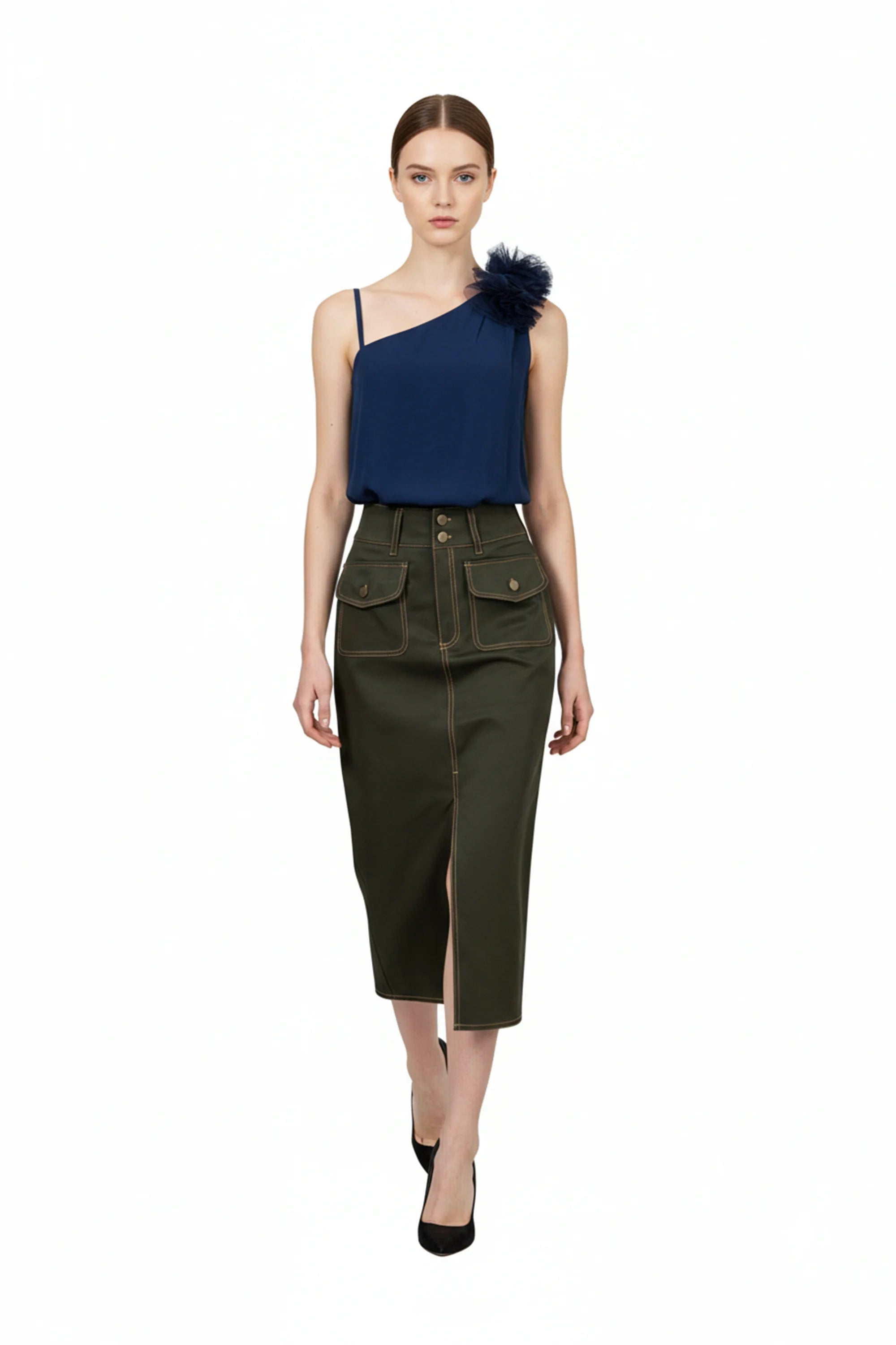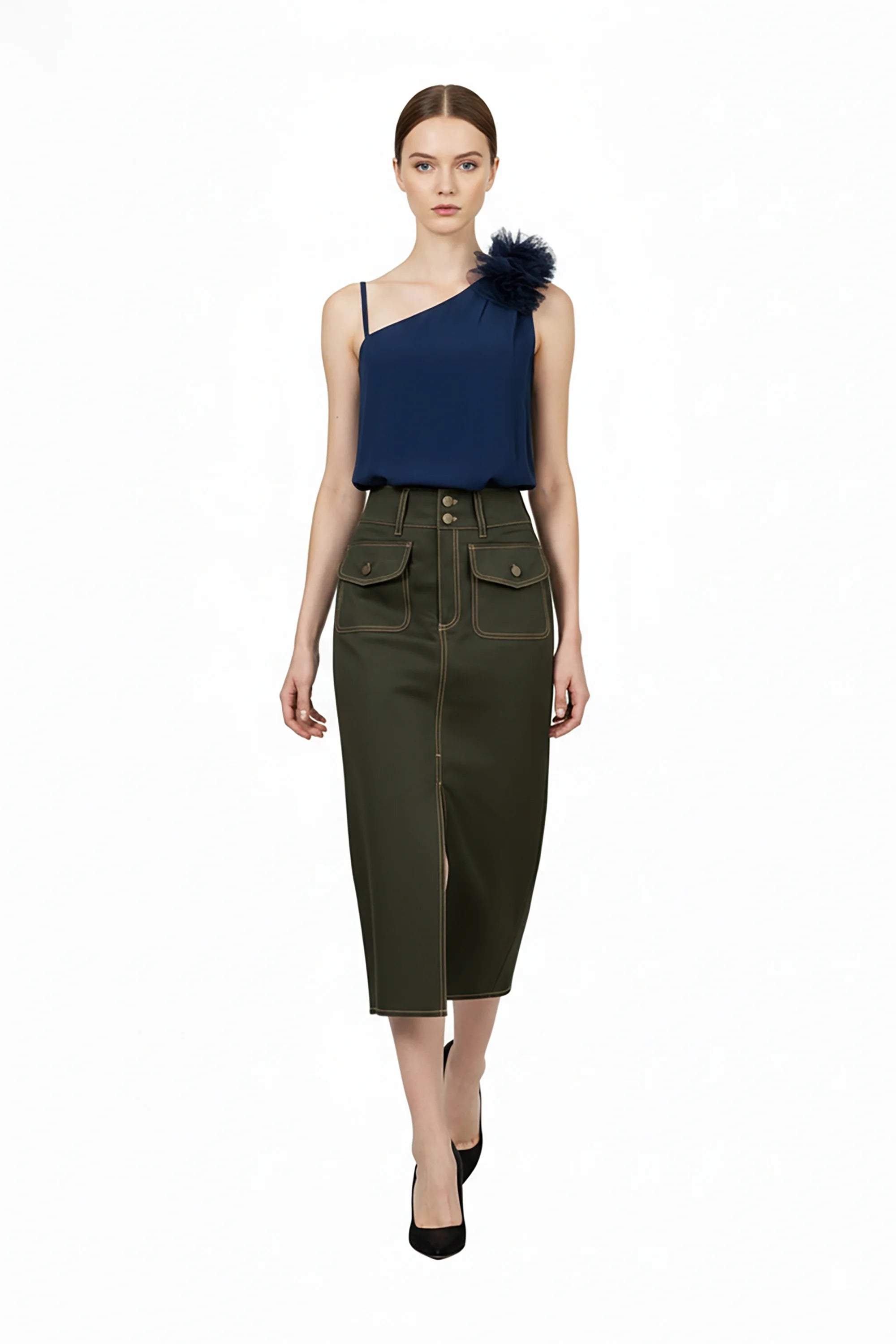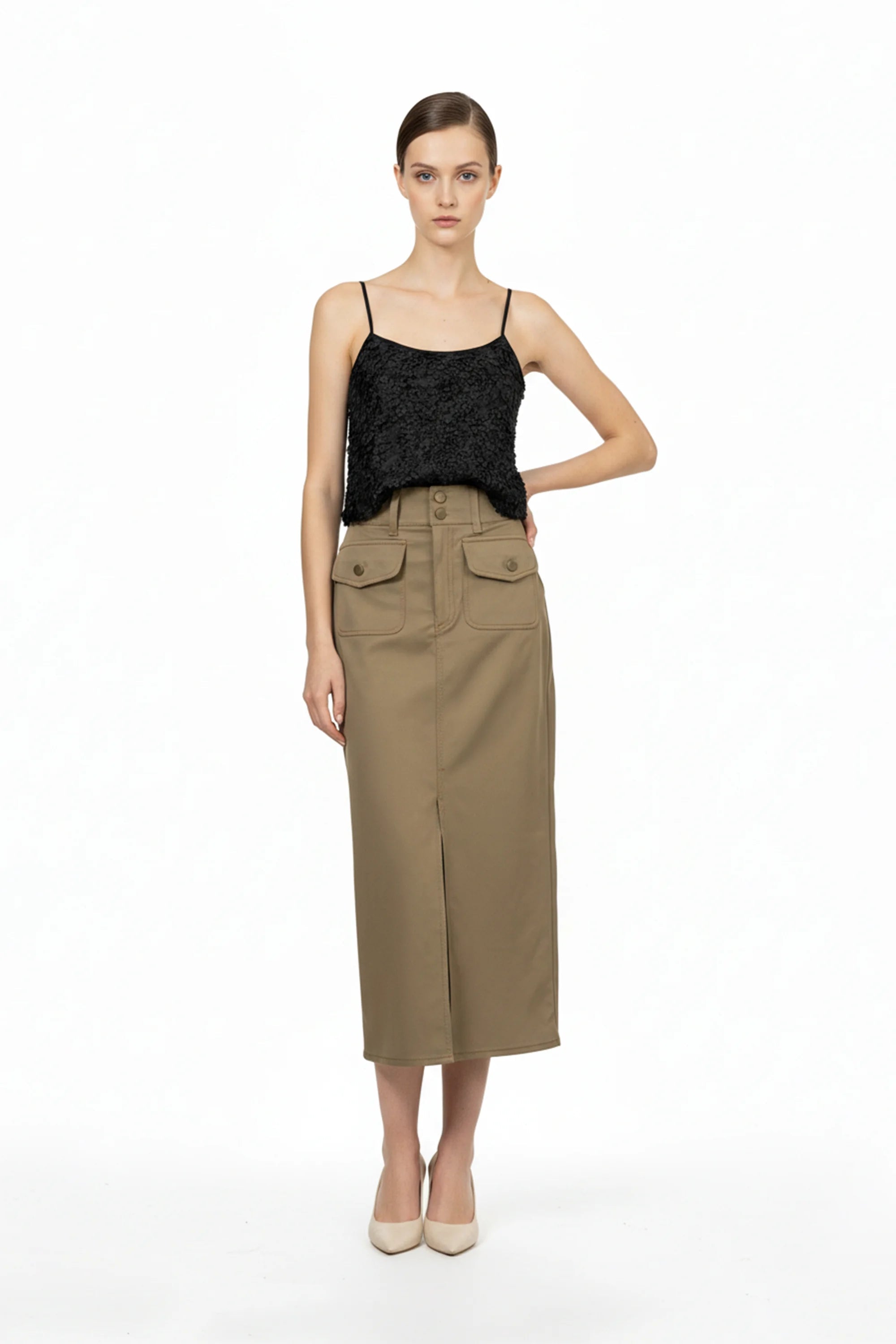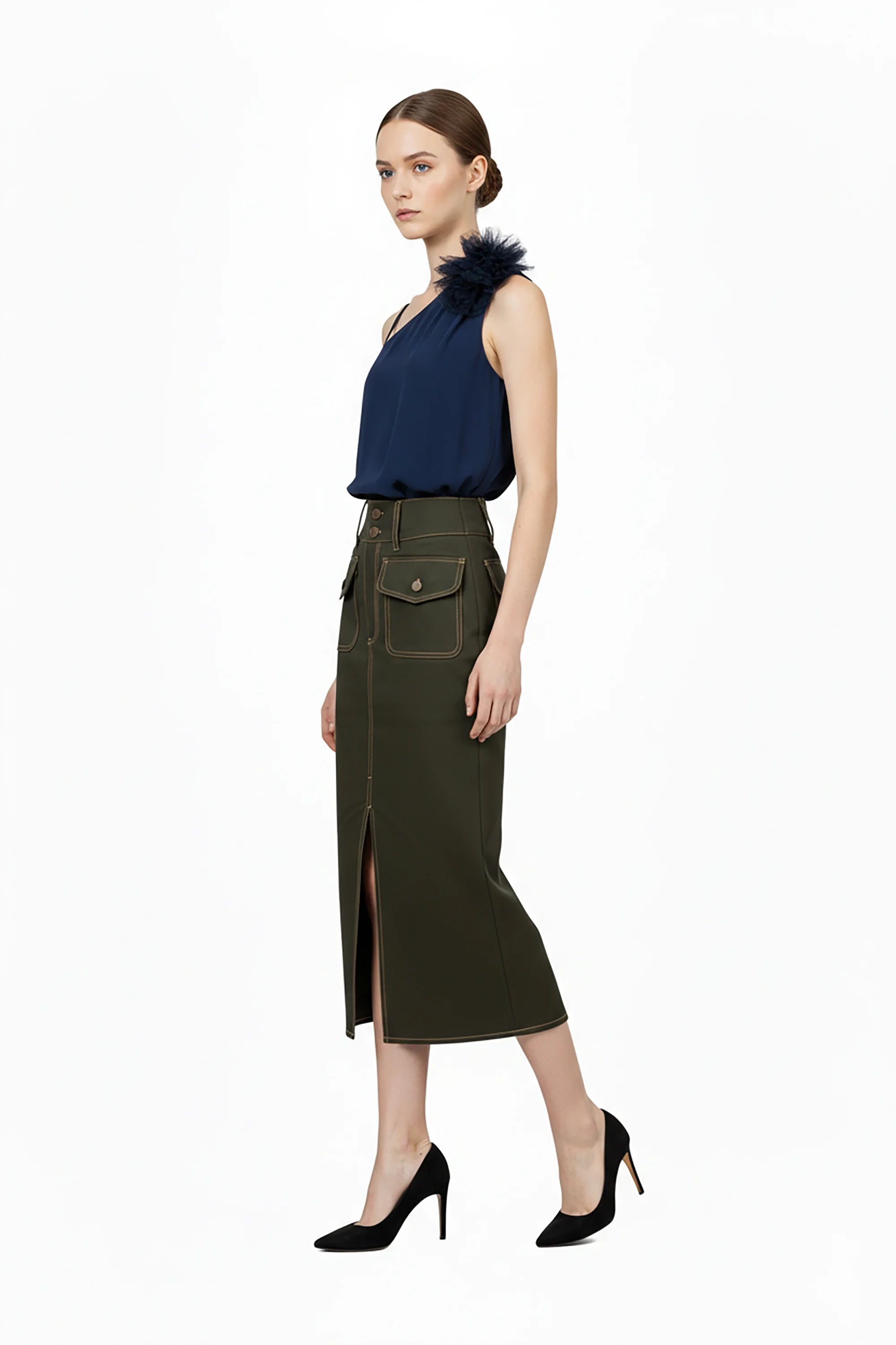Esta falda destaca por su impecable silueta de corte midi y talle alto, diseñada para alargar la figura con una elegancia arquitectónica. El punto focal de diseño son sus cuatro bolsillos cargo con solapa y botón, situados estratégicamente en la parte frontal y posterior para aportar un carácter utilitario sofisticado. Se caracteriza por una abertura frontal central, que añade dinamismo al caminar y un toque de sensualidad refinada a la estructura sólida de la prenda.