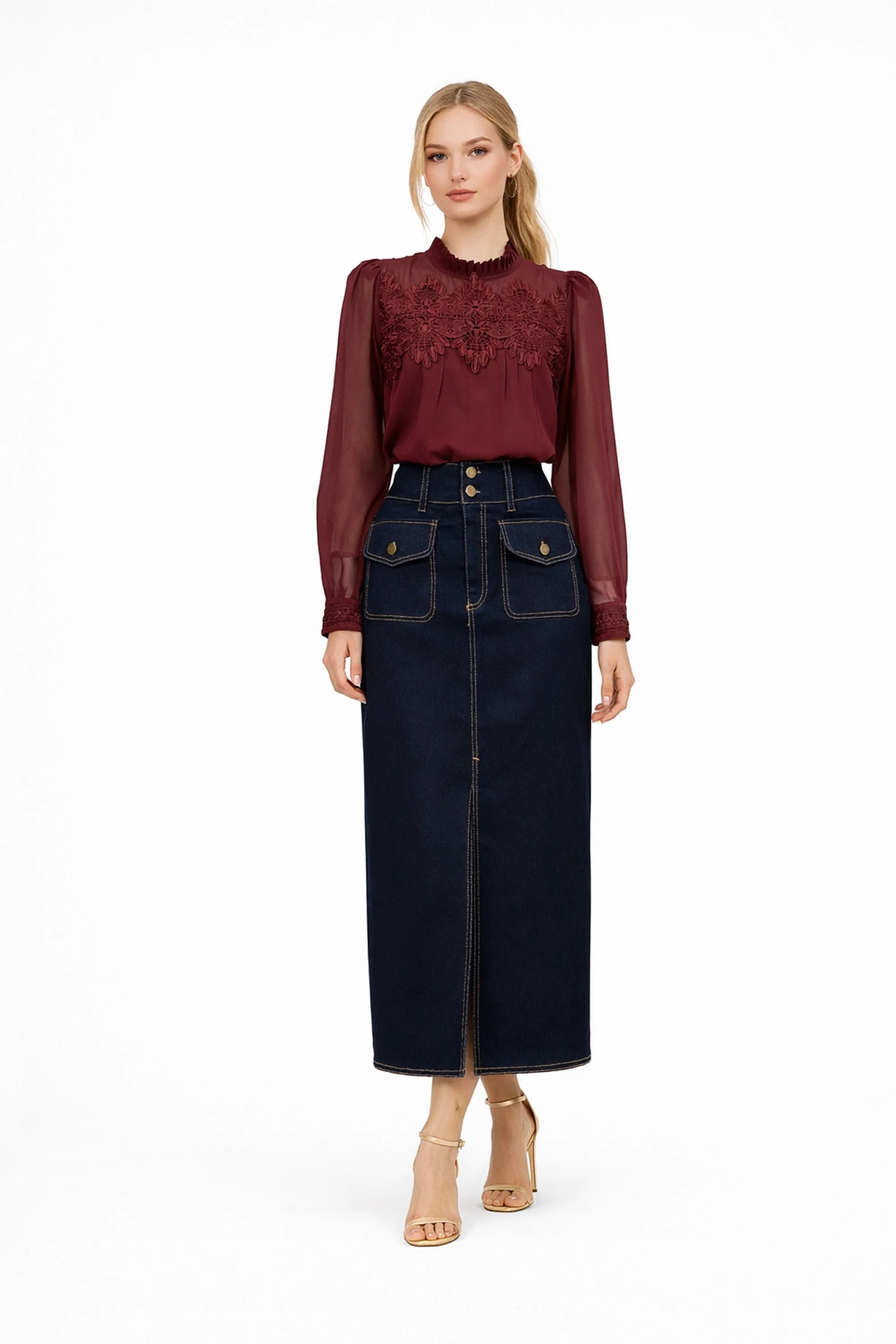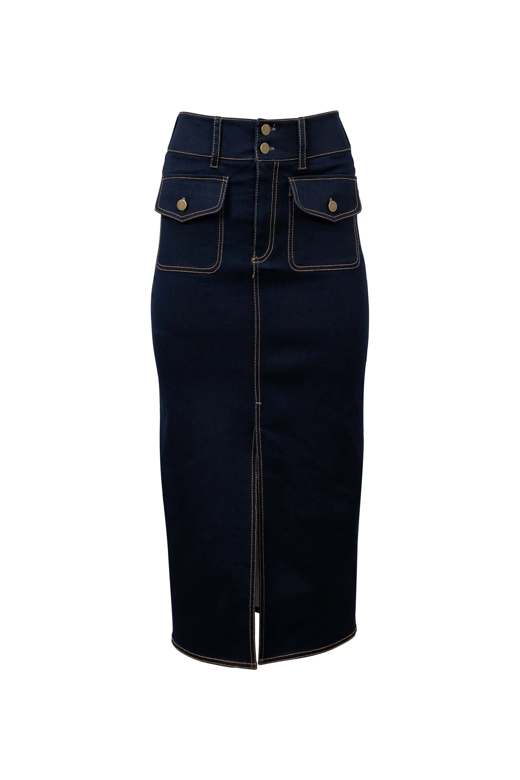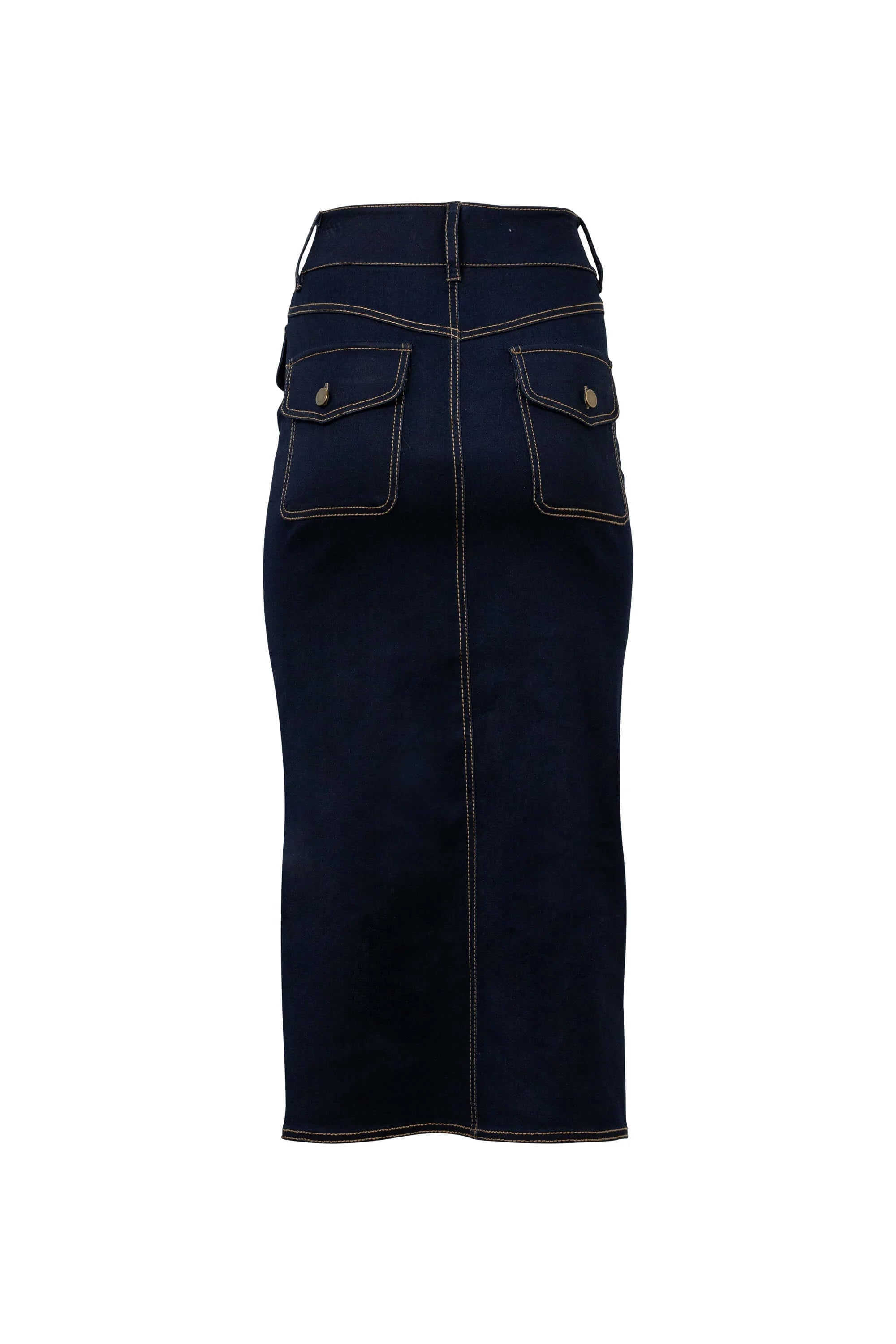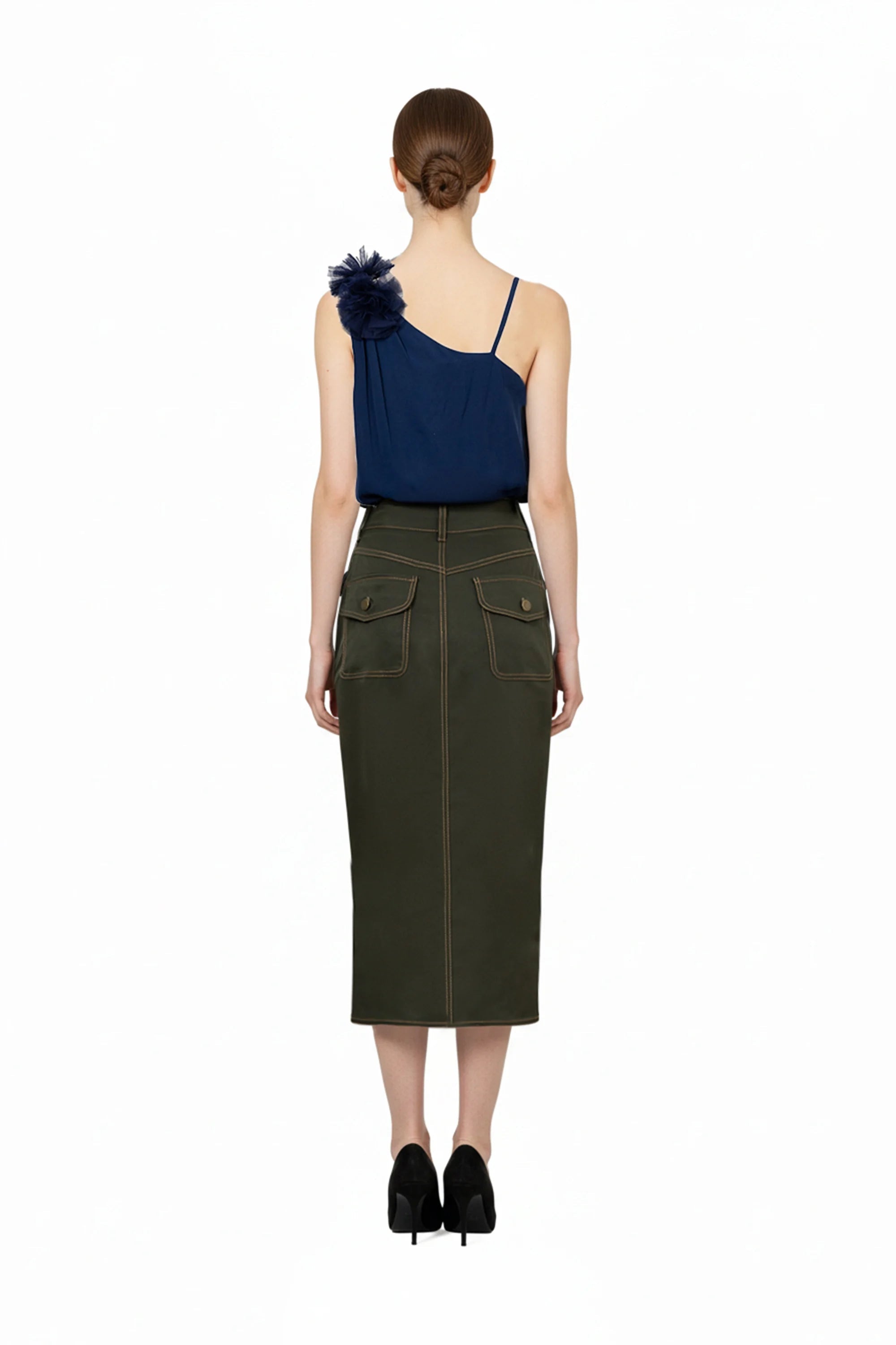 Esta falda destaca por su impecable silueta de corte midi y talle alto, diseñada para alargar la figura con una elegancia arquitectónica. El punto focal de diseño son sus cuatro bolsillos cargo con solapa y botón, situados estratégicamente en la parte frontal y posterior para aportar un carácter utilitario sofisticado. Se caracteriza por una abertura frontal central, que añade dinamismo al caminar y un toque de sensualidad refinada a la estructura sólida de la prenda.