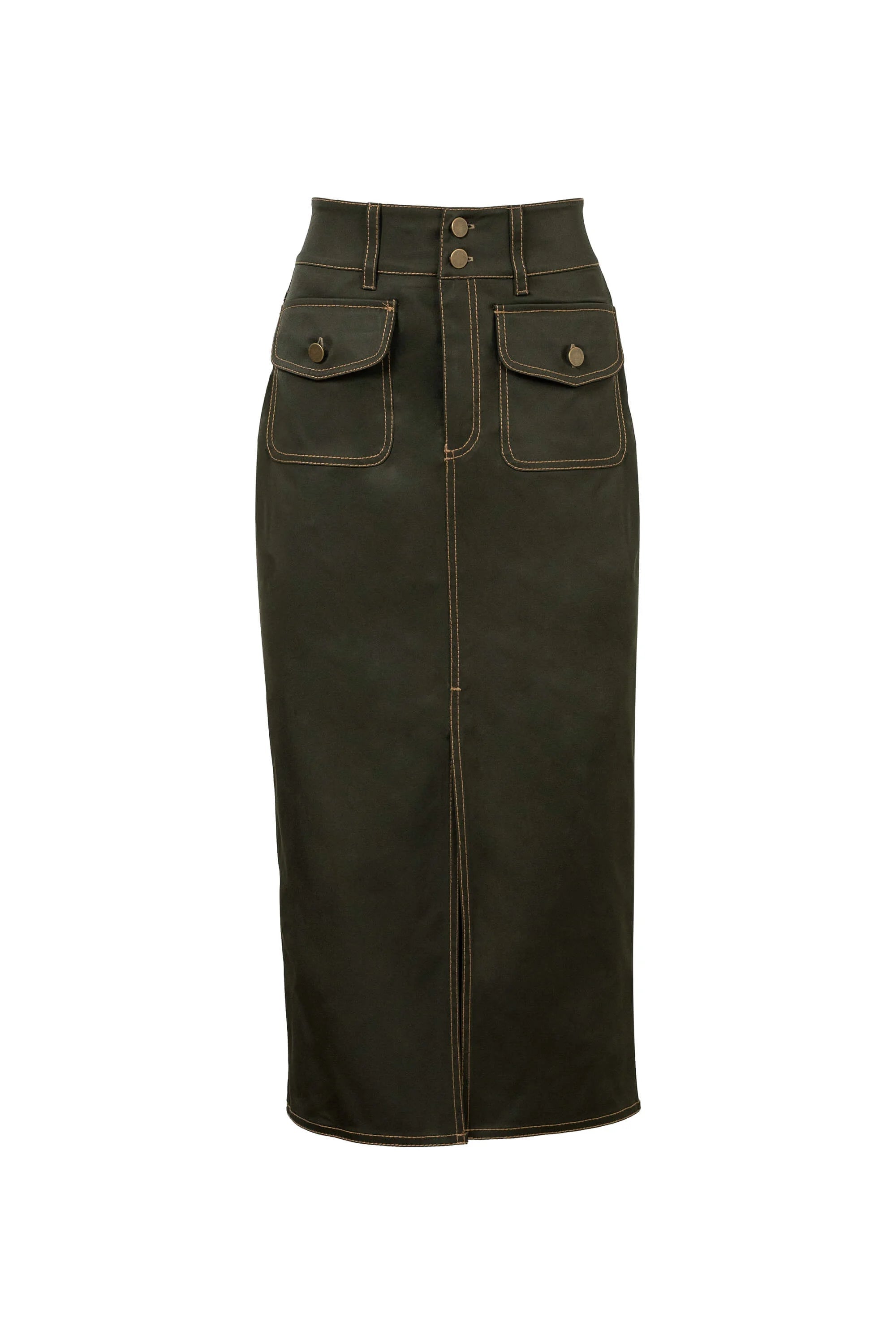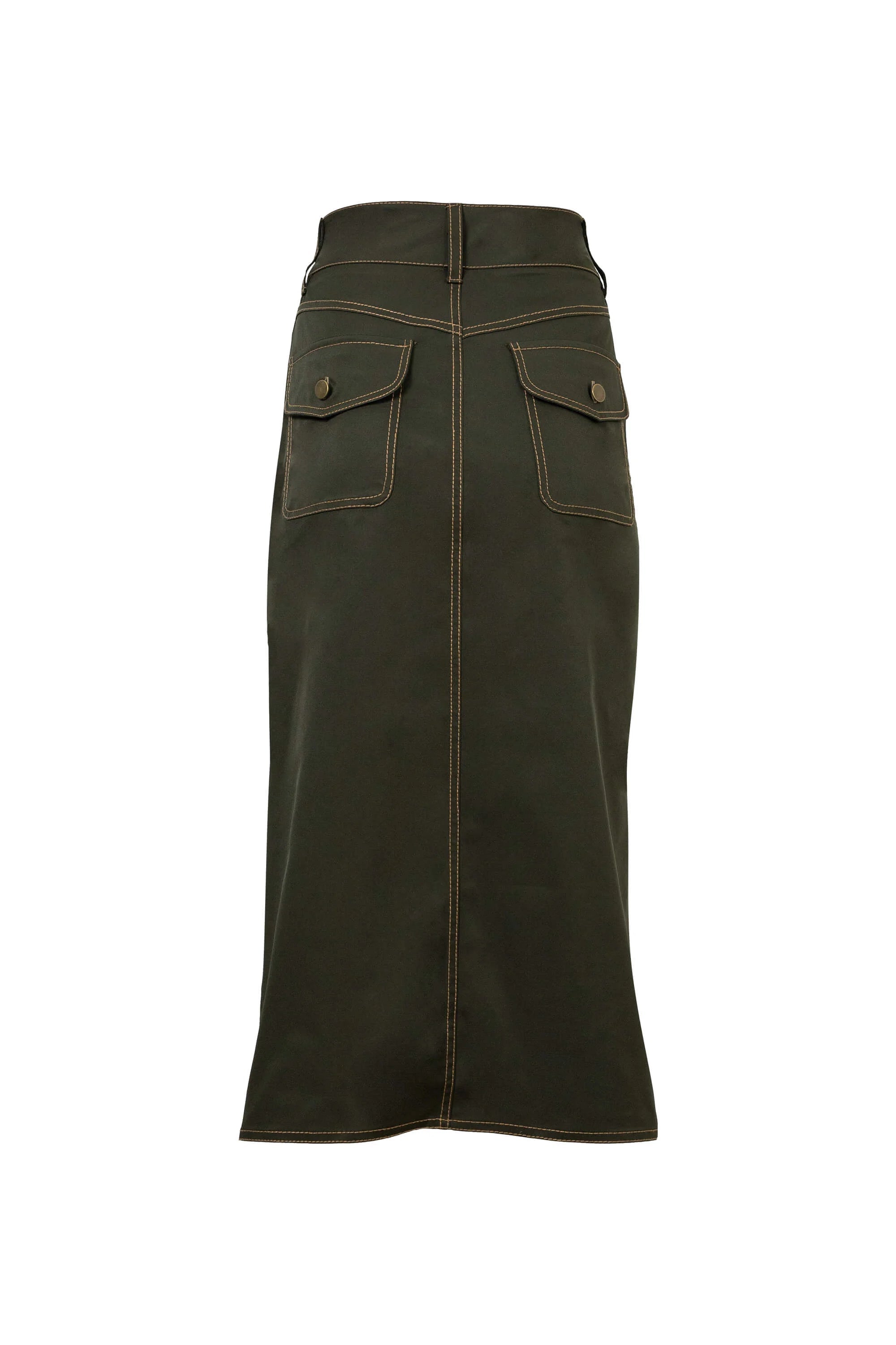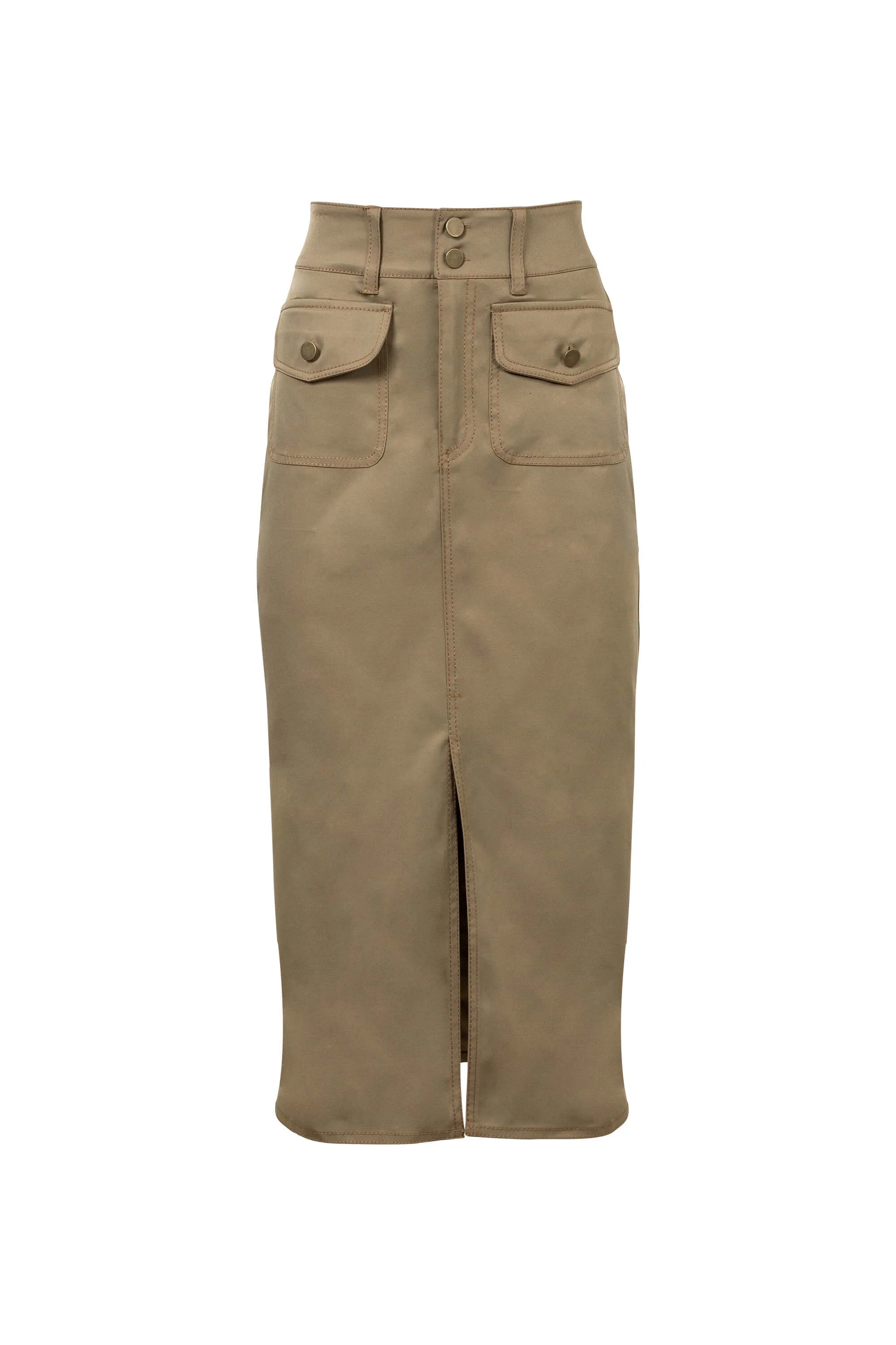 El modelo ofrece un ajuste entallado de precisión sastre, que se ciñe a la cintura mediante una pretina ancha con trabillas para cinturón y un cierre de doble botón funcional. La parte posterior presenta un acabado profesional con un canesú en forma de "V", que realza la silueta de forma natural. Los acabados de alta gama y el diseño utilitario definen esta falda como un esencial de diseño de autor, ideal para la mujer que busca fusionar la practicidad de la moda cargo con una visión moderna y pulcra de la elegancia diaria.