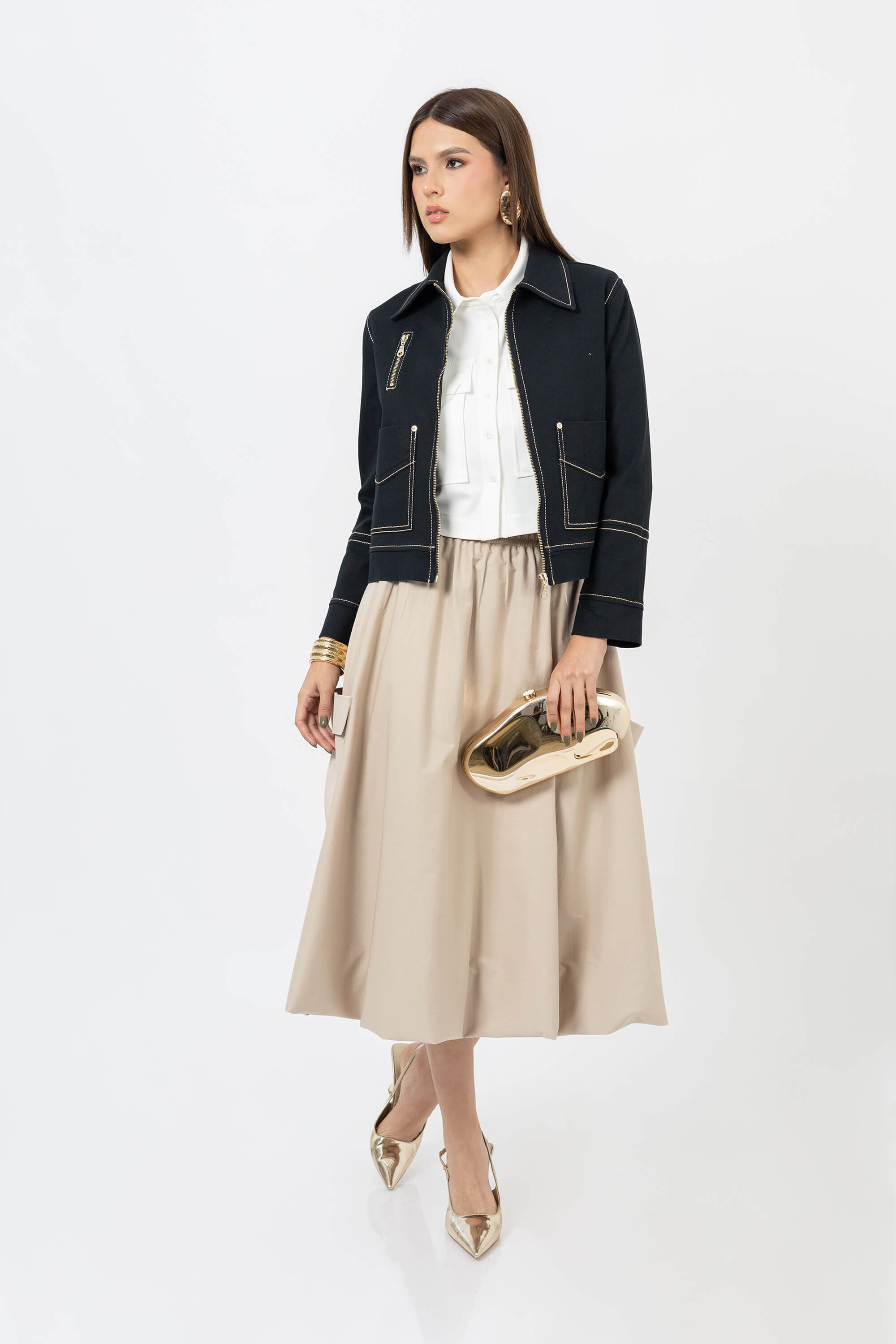 La chamarra con bolsas al frente y doble cierre  es una pieza atemporal que redefine la sofisticación casual. Su silueta estructurada destaca por el detalle funcional de las bolsas frontales y el doble cierre metálico, que aportan modernidad y estilo práctico.