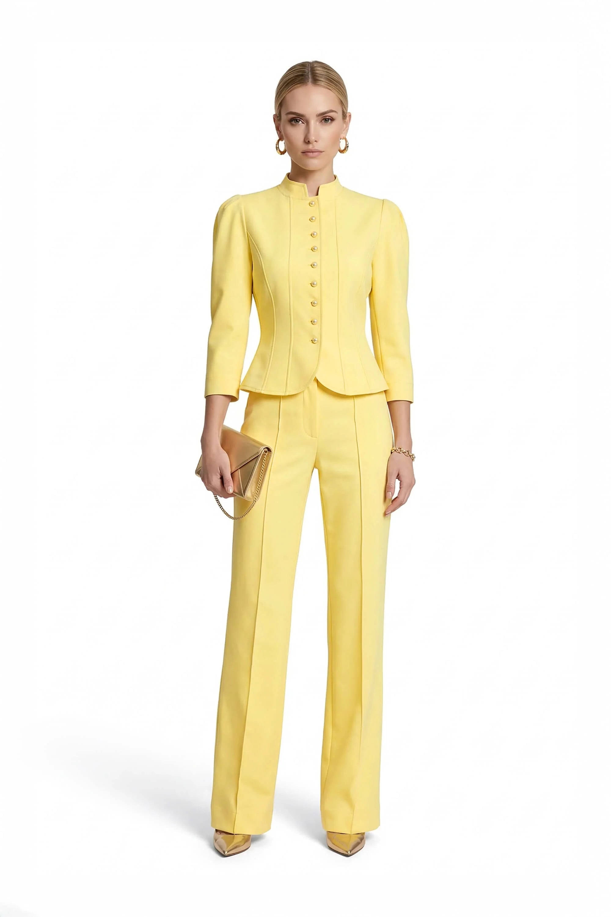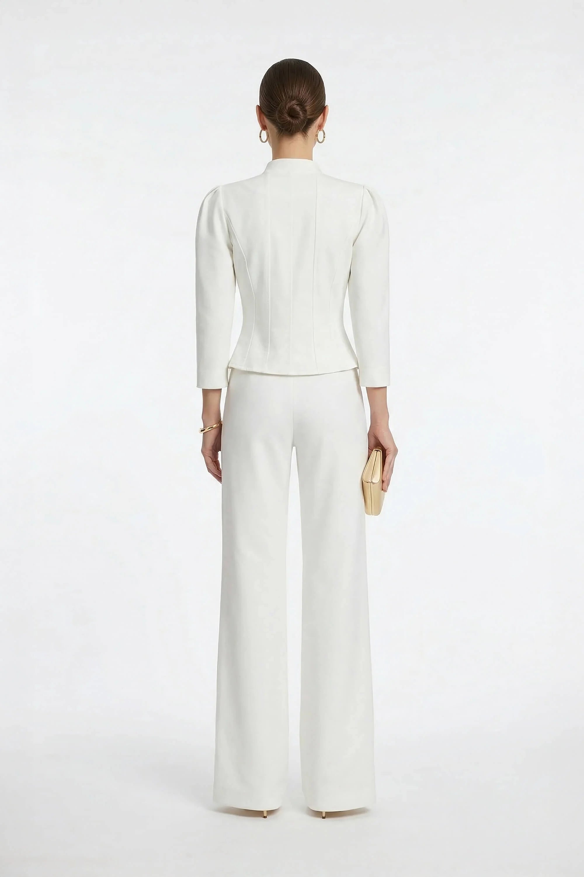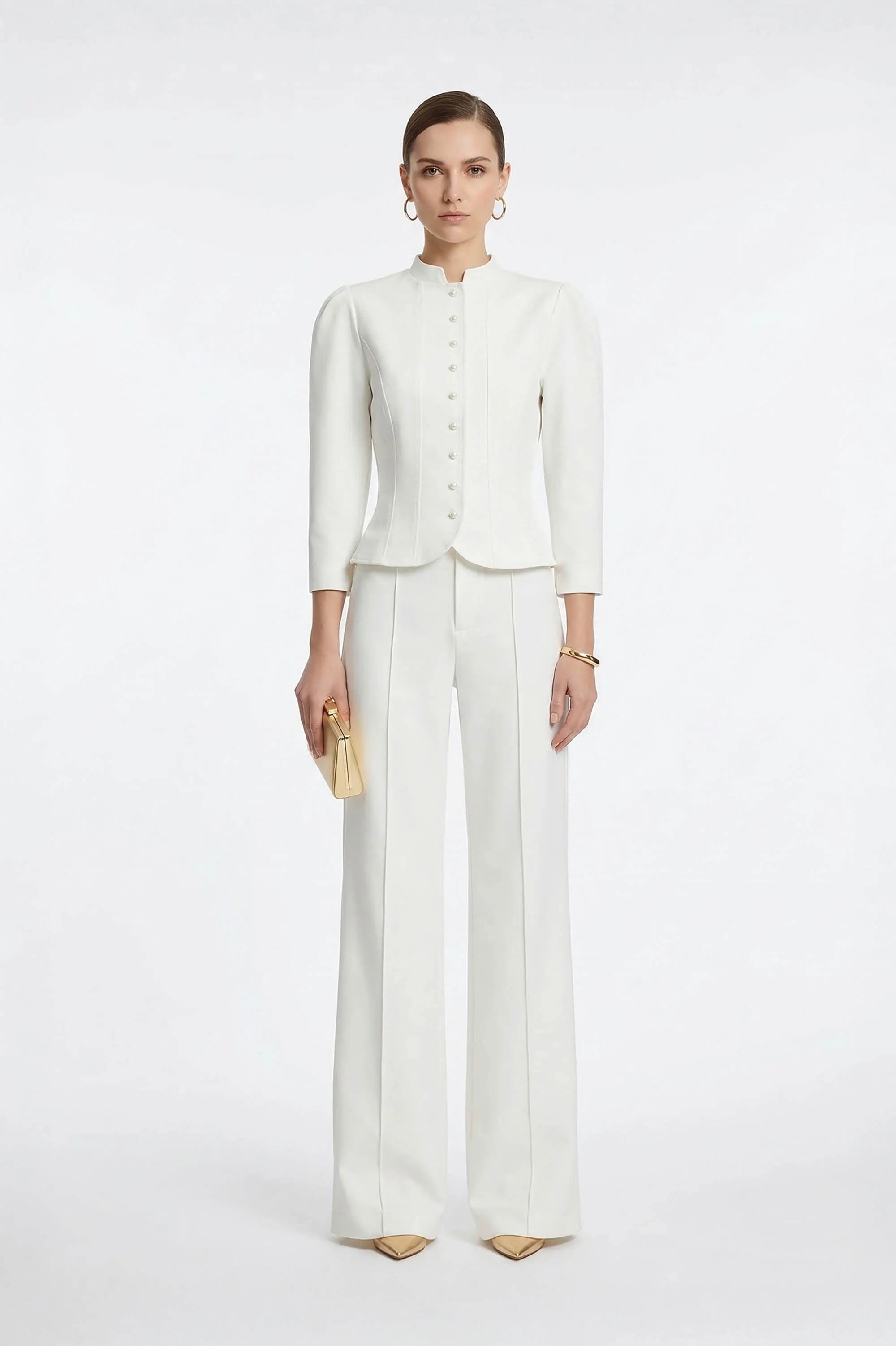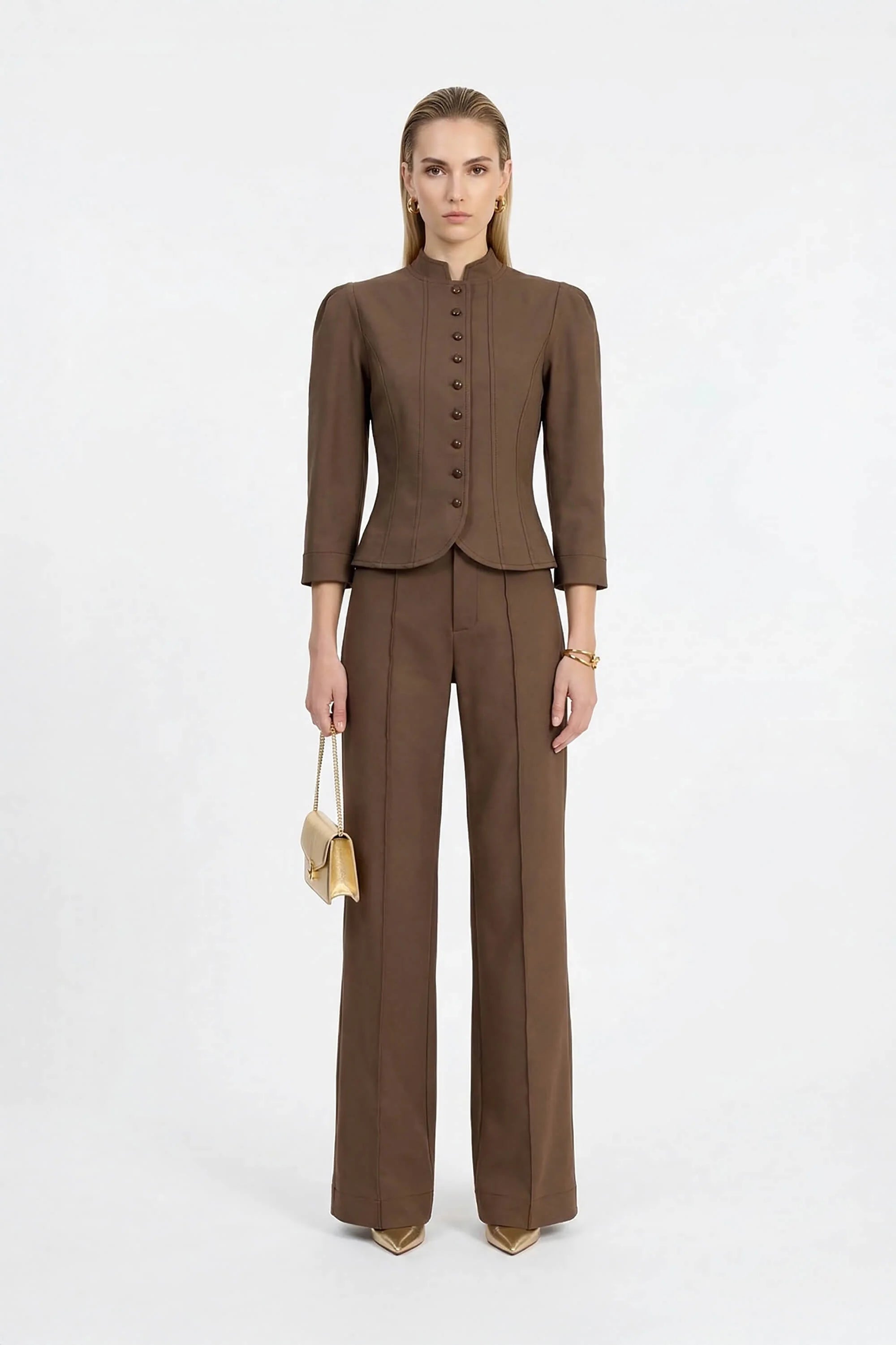Los pliegues sutiles en los hombros aportan volumen y carácter a las mangas, convirtiéndola en una prenda única que combina lo clásico con un toque contemporáneo. El cuello alto tipo mao añade distinción, mientras que la hilera de botones frontales refuerza su estética limpia y minimalista.
