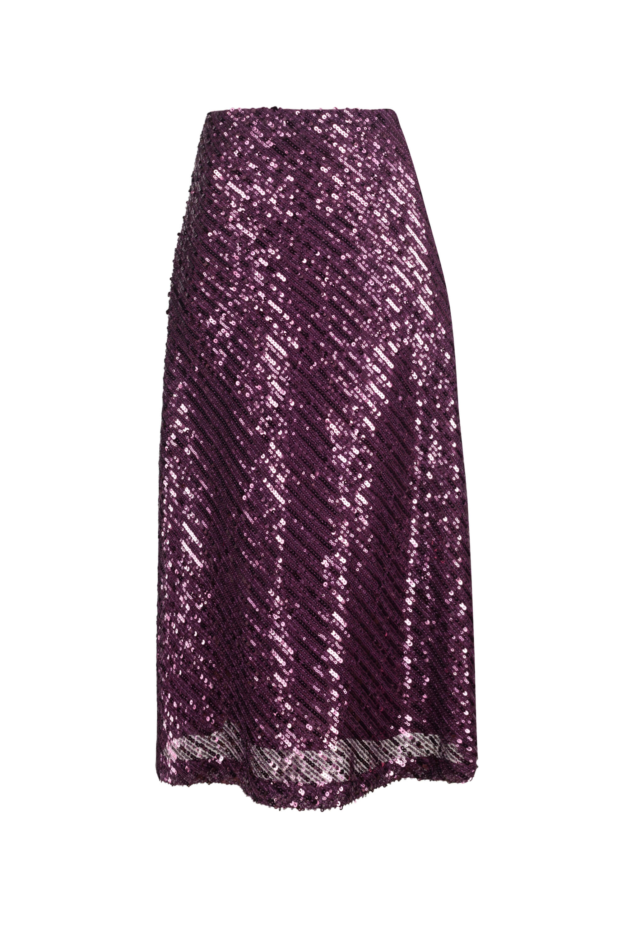 Esta falda de corte midi destaca por su silueta de línea A y una cobertura total de lentejuelas dispuestas en un dinámico patrón diagonal. El diseño está pensado para capturar y reflejar la luz con cada paso, ofreciendo una estética de lujo y celebración. Su estructura limpia y minimalista permite que el brillo sea el protagonista absoluto, convirtiéndola en la pieza central para eventos de gala o festividades nocturnas.