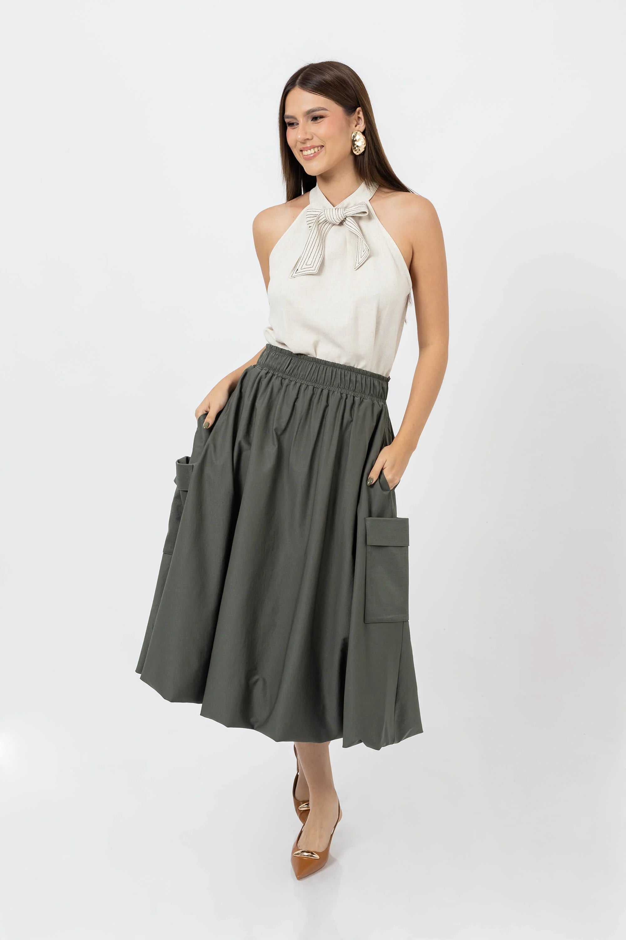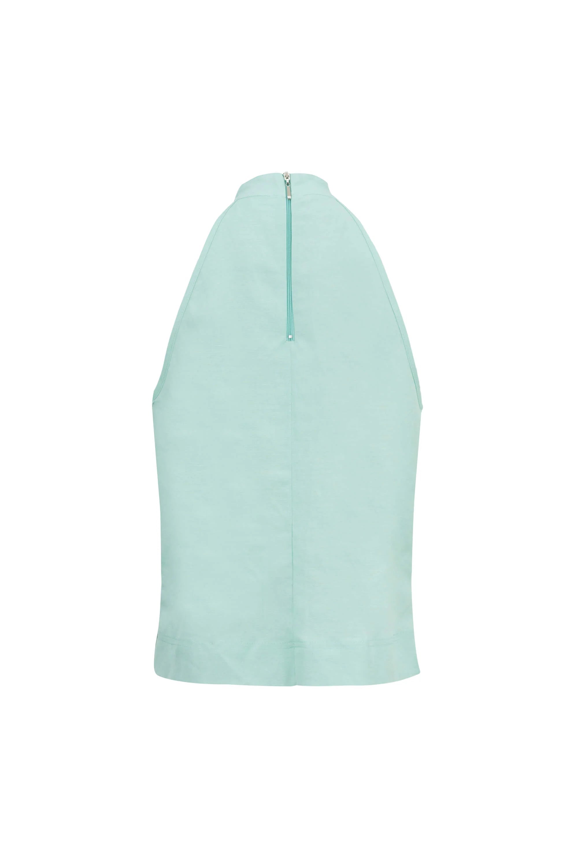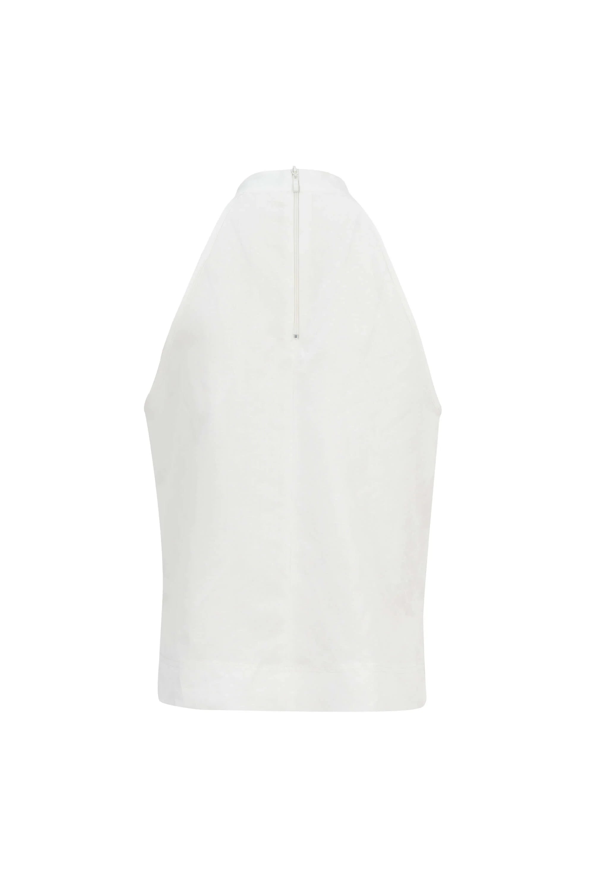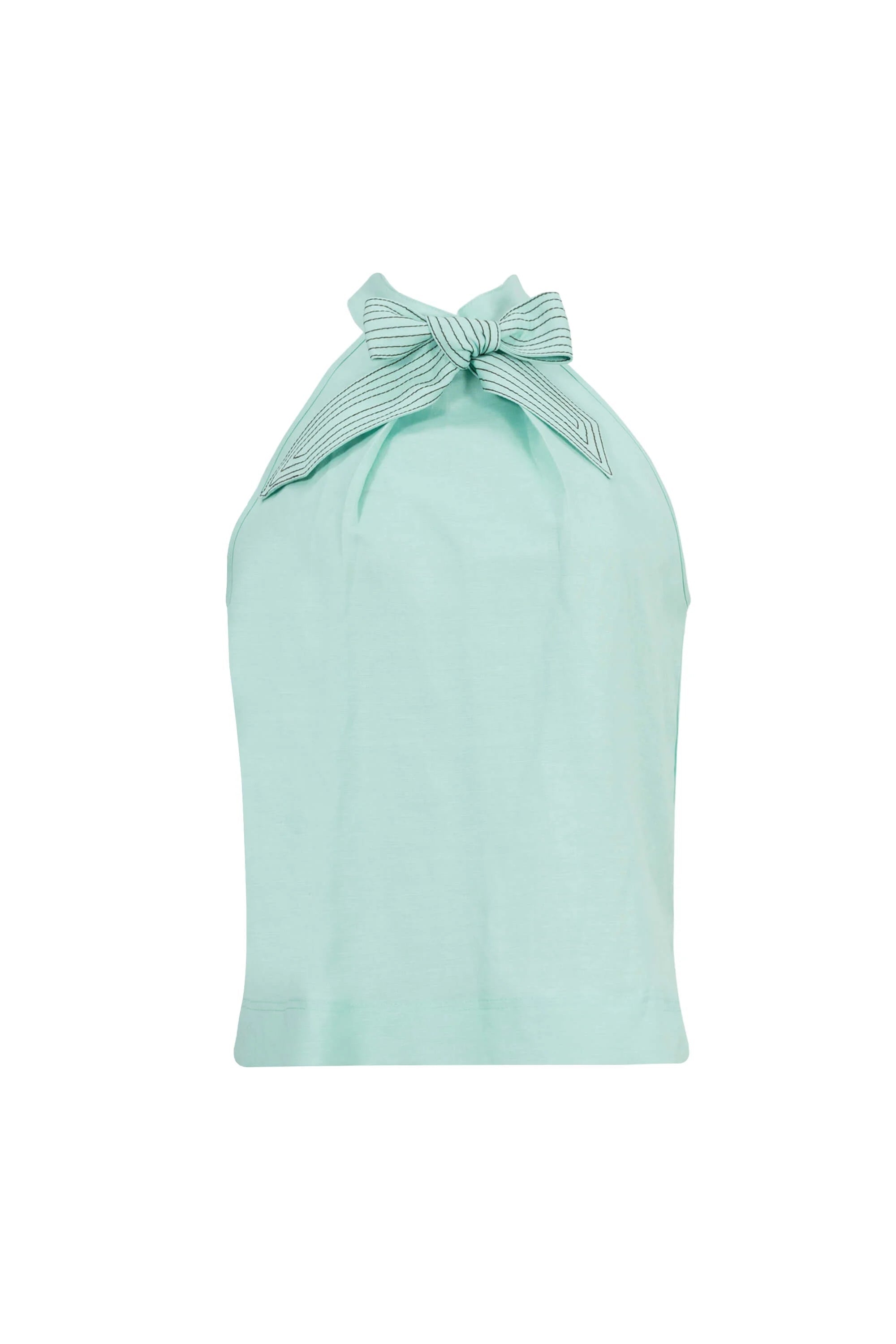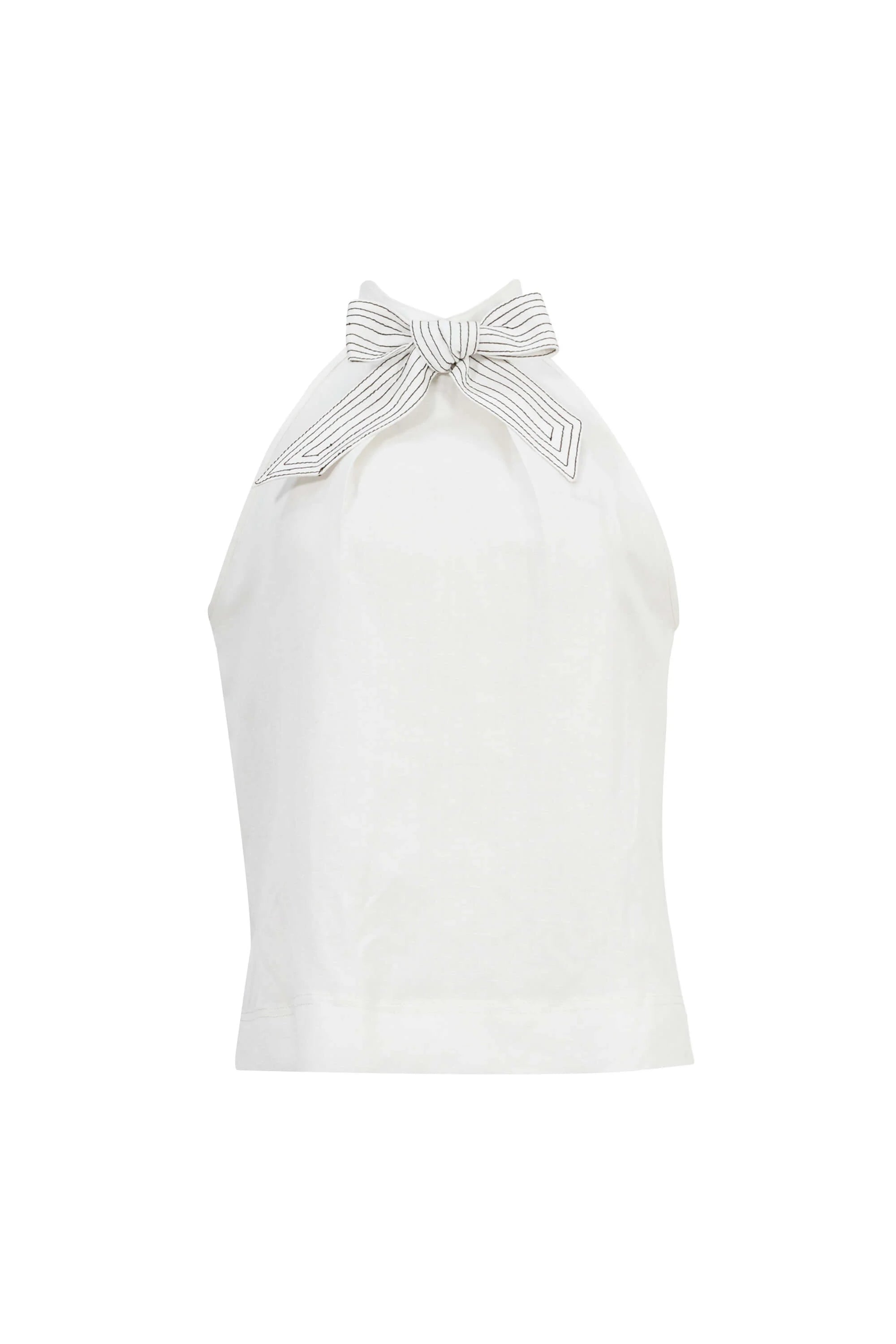 Este top destaca por su sofisticado cuello halter, que deja los hombros al descubierto proyectando una silueta limpia y moderna. El punto focal de alta costura es el lazo frontal estructurado en el cuello, confeccionado con un delicado patrón de rayas finas que aporta un contraste gráfico y un aire marinero refinado a la prenda. El diseño presenta un ligero tableado bajo el lazo que permite una caída fluida y cómoda sobre el torso.