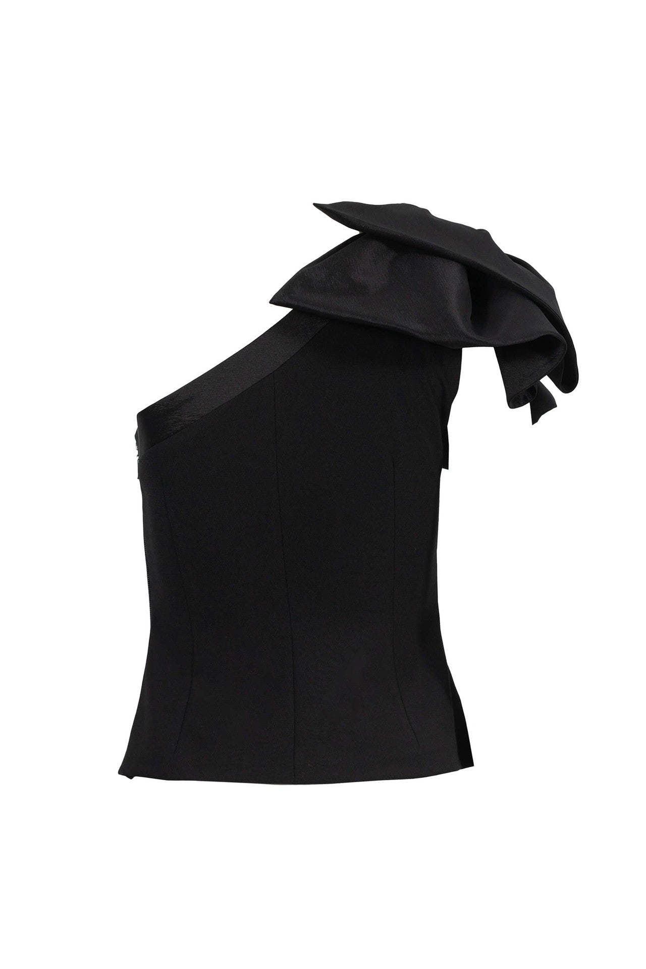 Este top destaca por su impecable silueta de un solo hombro (one-shoulder), diseñada para resaltar la línea del cuello y los hombros con una elegancia arquitectónica. El punto focal de diseño es su majestuoso volante en cascada sobre el hombro, elaborado en un satín de brillo superior que aporta un volumen dramático y un aire de alta costura. Se caracteriza por un cuerpo estructurado con plisados horizontales en la parte inferior, que proyectan una imagen de sofisticación moderna y precisión sastre.