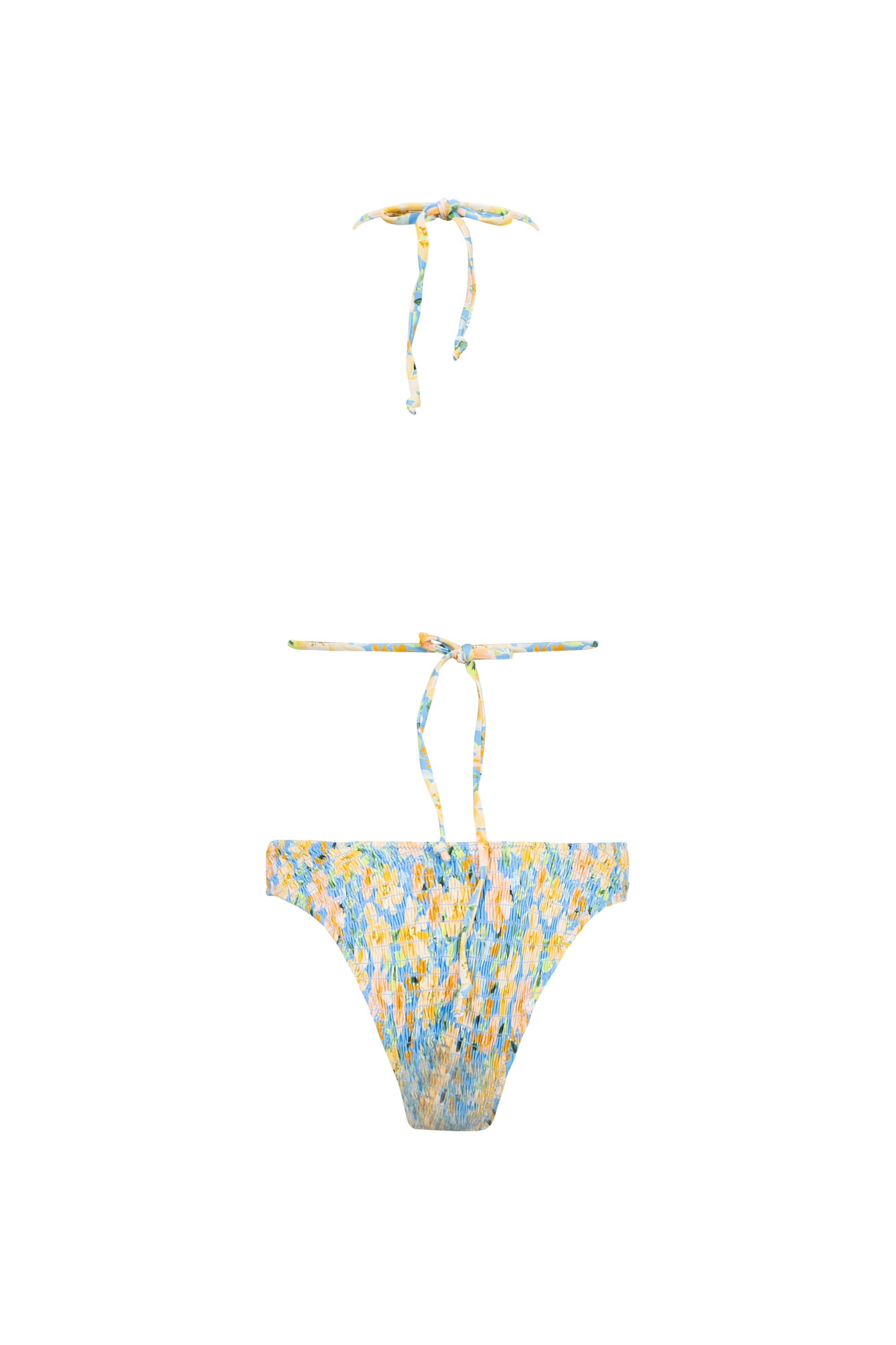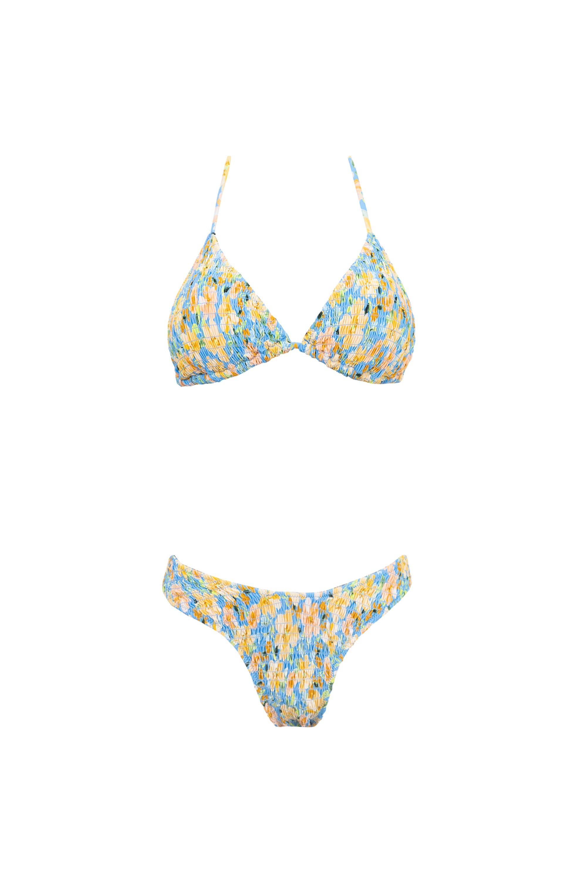 Este conjunto de bikini destaca por su impecable silueta de triángulo clásico con textura nido de abeja (smocking), diseñada para proporcionar una imagen estilizada y un ajuste excepcionalmente cómodo. El punto focal de diseño es su sofisticado estampado floral abstracto, que emula la delicadeza de una pintura a la acuarela sobre un fondo azul cielo. El top se caracteriza por sus copas de cobertura ajustable, mientras que la braga presenta un corte de pierna alto de inspiración vintage, proyectando una imagen de lujo contemporáneo y una feminidad poética de alta gama.