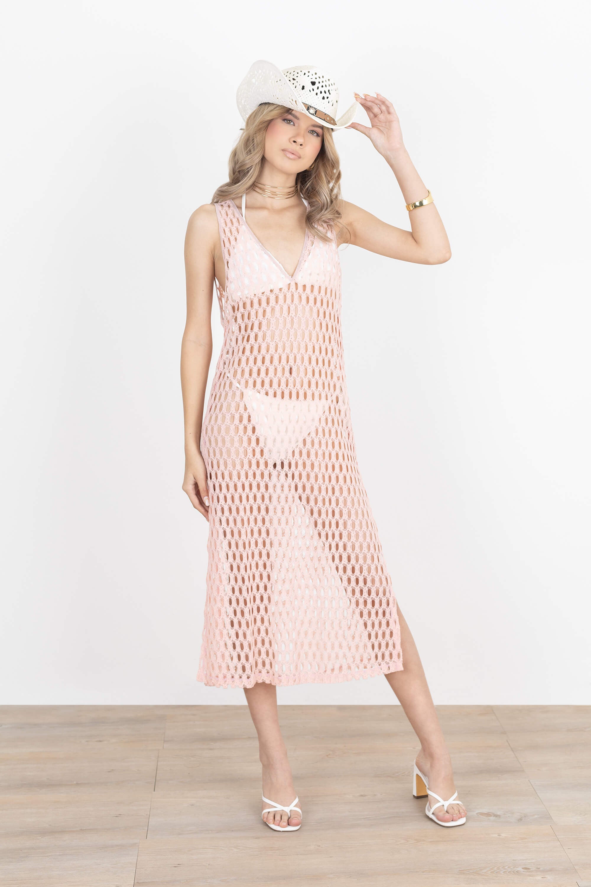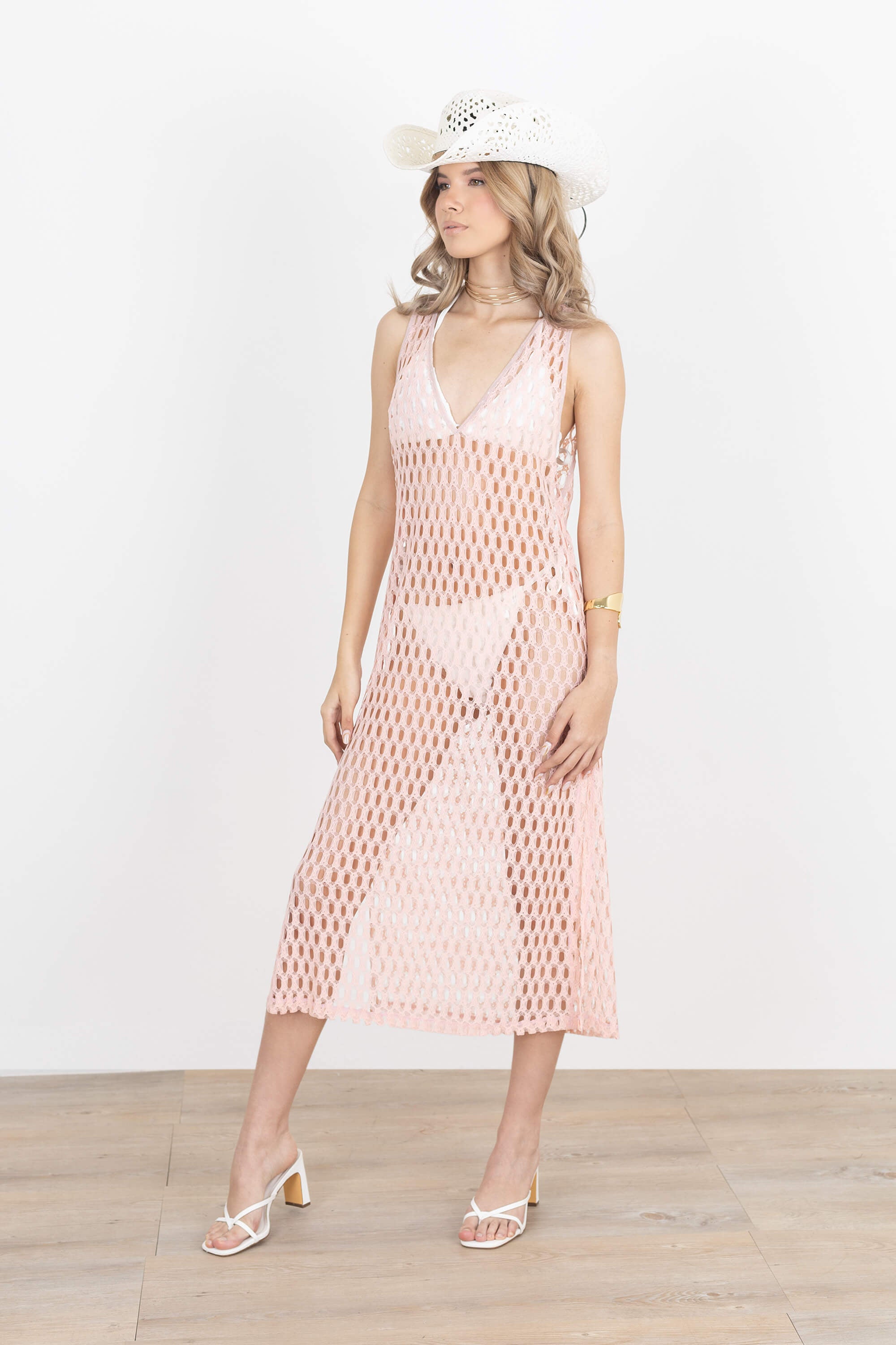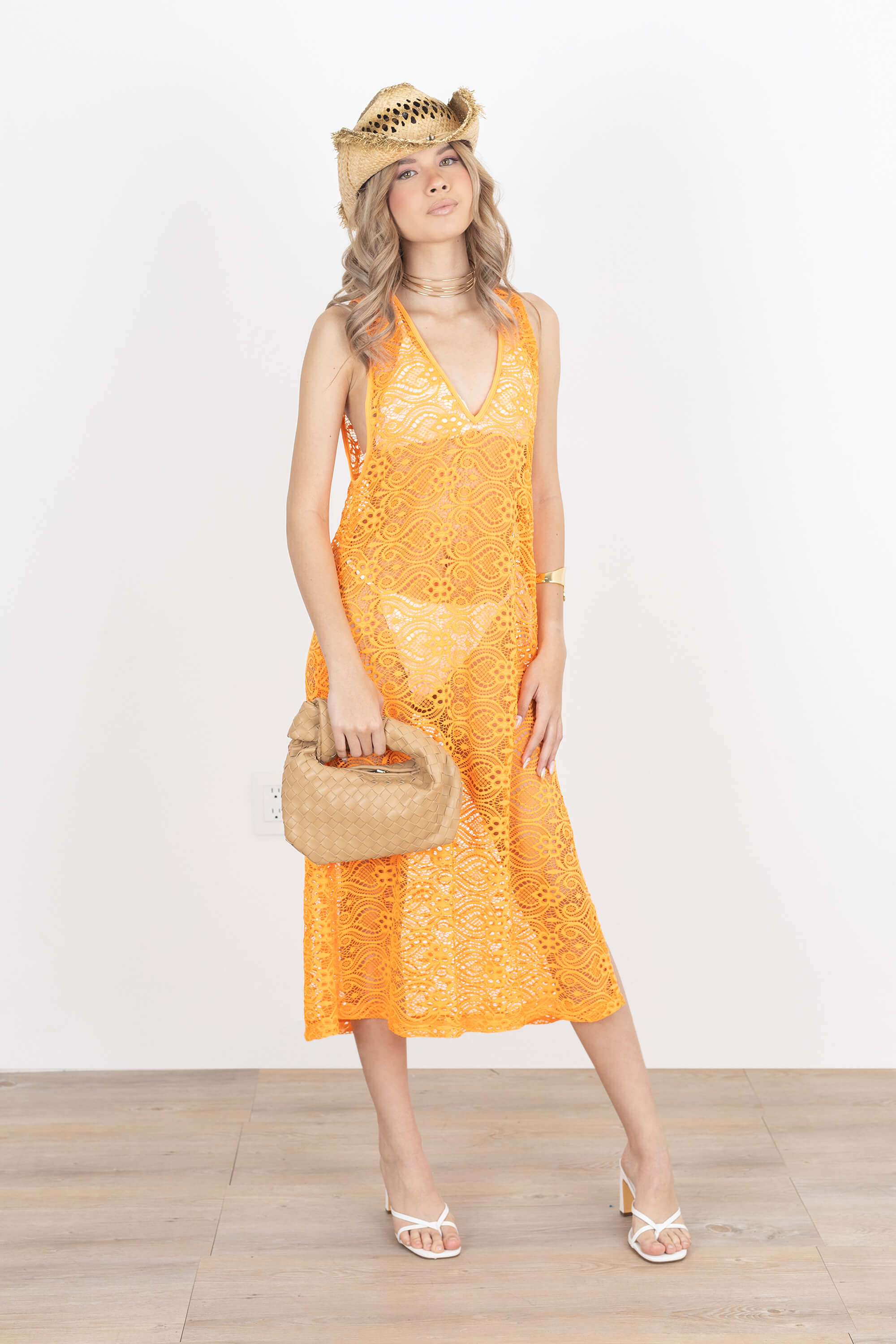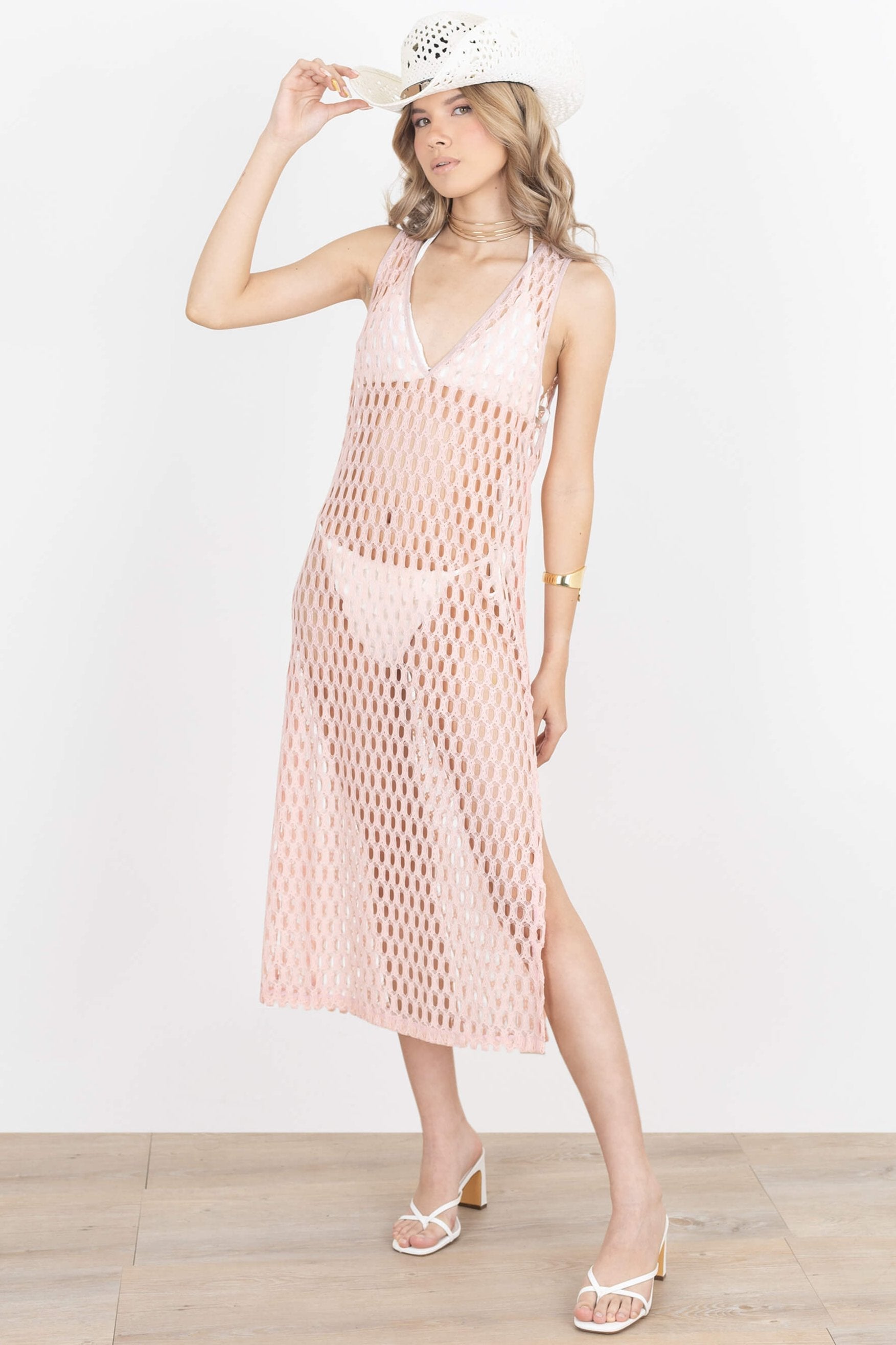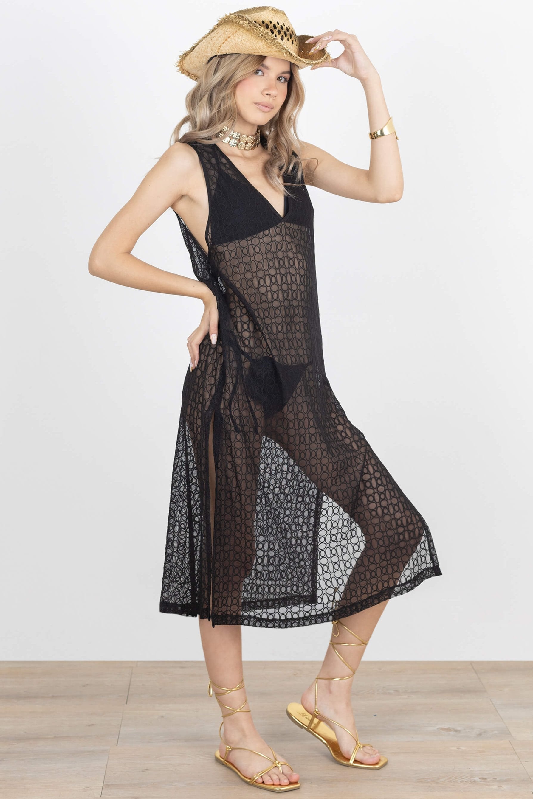 Esta salida de baño destaca por su sofisticada confección en encaje de red translúcido, que presenta un intrincado patrón que crea un efecto visual rítmico sobre la piel. El diseño cuenta con un escote en V y una silueta sin mangas que proyecta una imagen de frescura y libertad. Se caracteriza por su longitud midi y unas aberturas laterales pronunciadas, diseñadas para añadir un toque de sensualidad y facilitar un movimiento fluido al caminar.