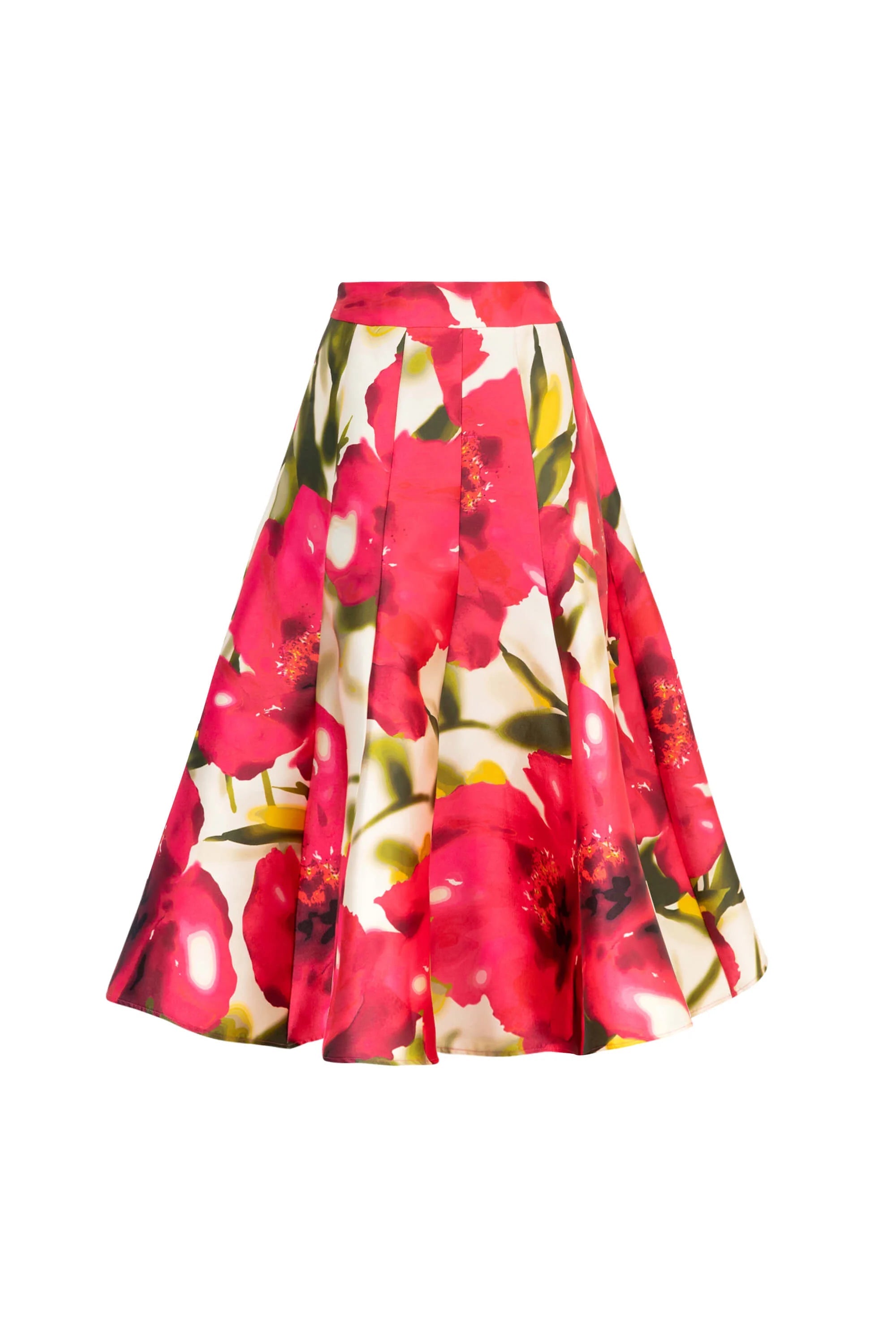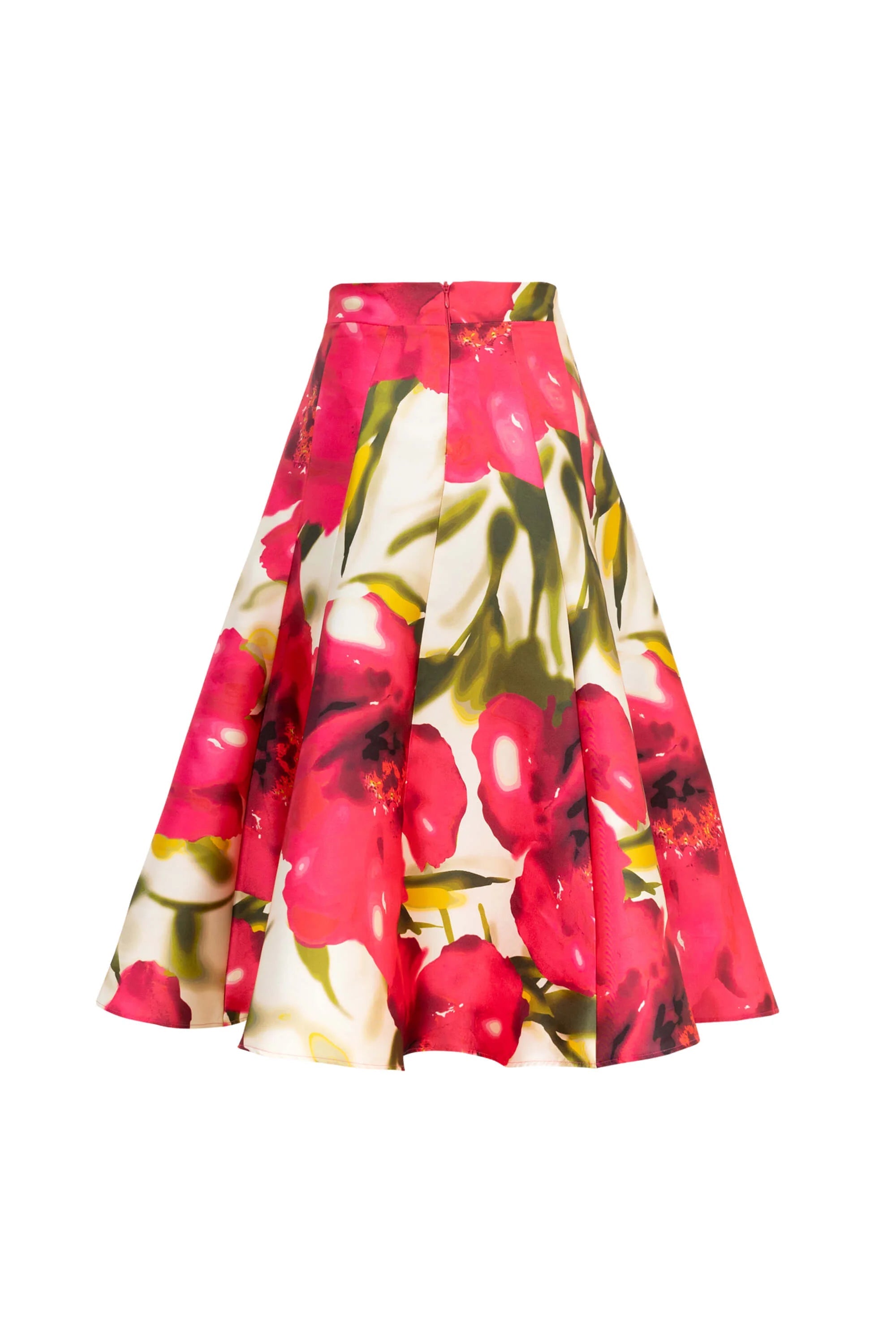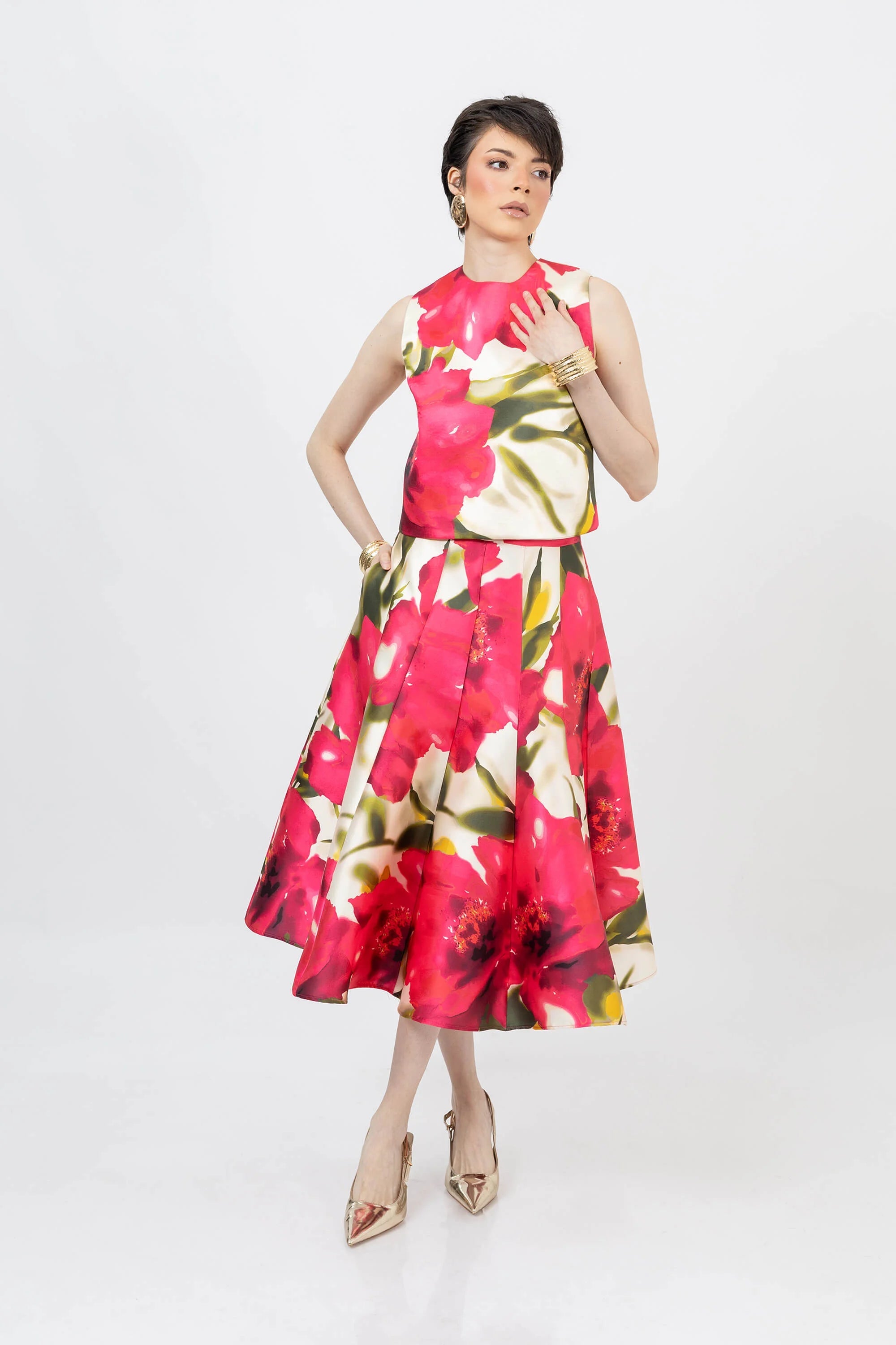 La Falda maxi con pliegues semi amplia de Reina Díaz celebra la elegancia femenina con un toque artístico. Su diseño estructurado realza la cintura y aporta volumen con movimiento natural gracias a sus pliegues suaves. Confeccionada en un tejido con estampado floral de gran formato, esta pieza es ideal para quienes buscan destacar con sofisticación y color en eventos, cenas o celebraciones especiales.