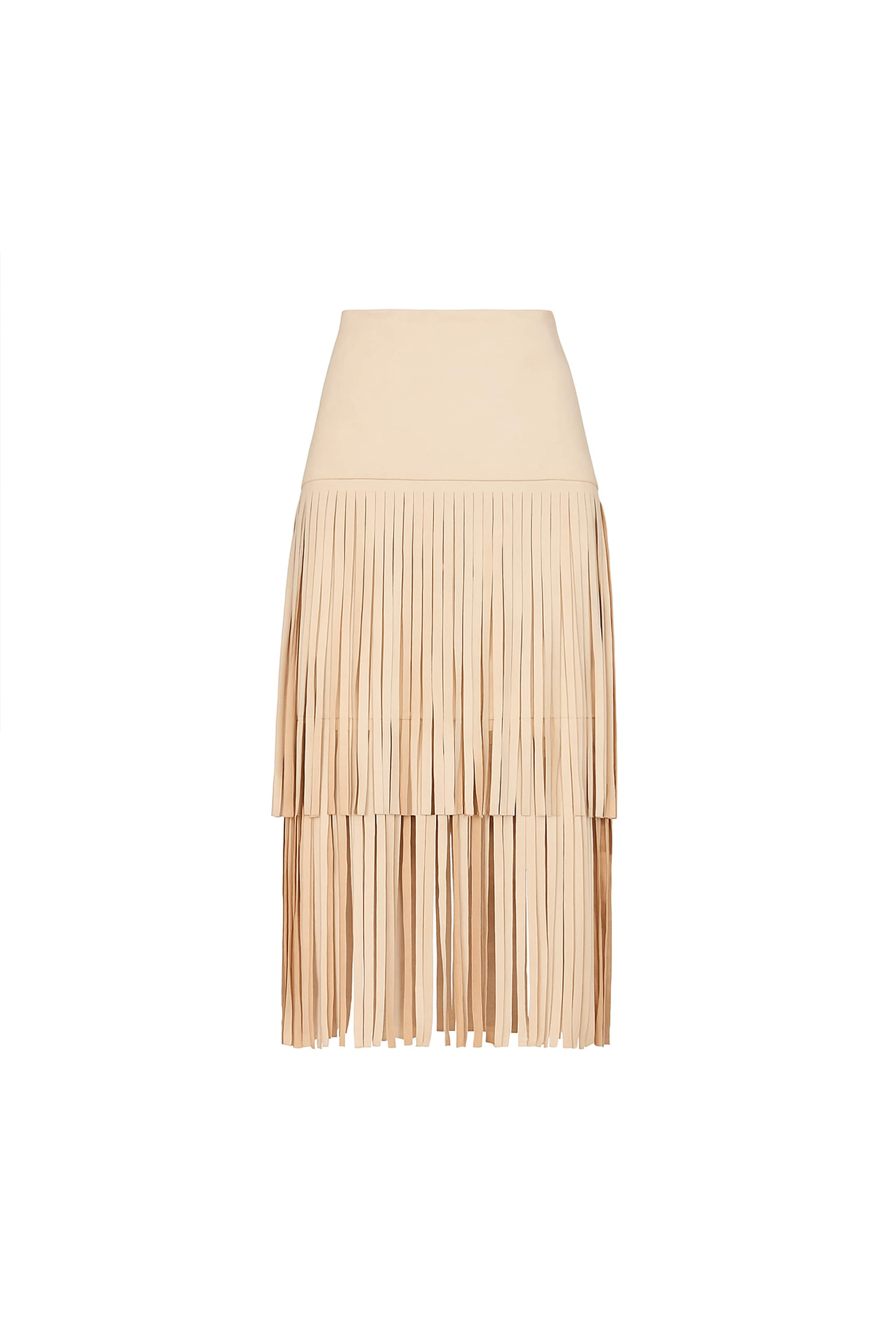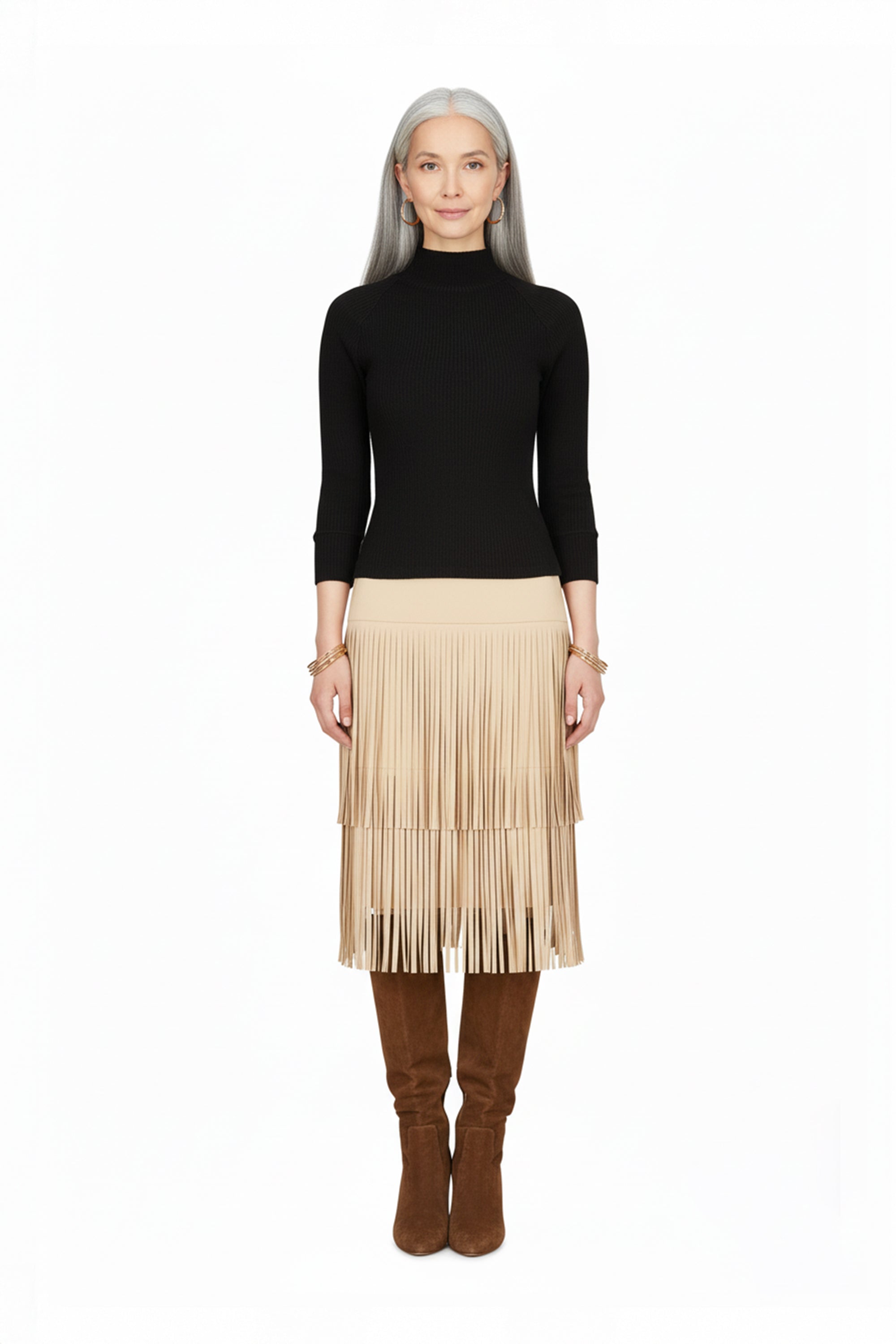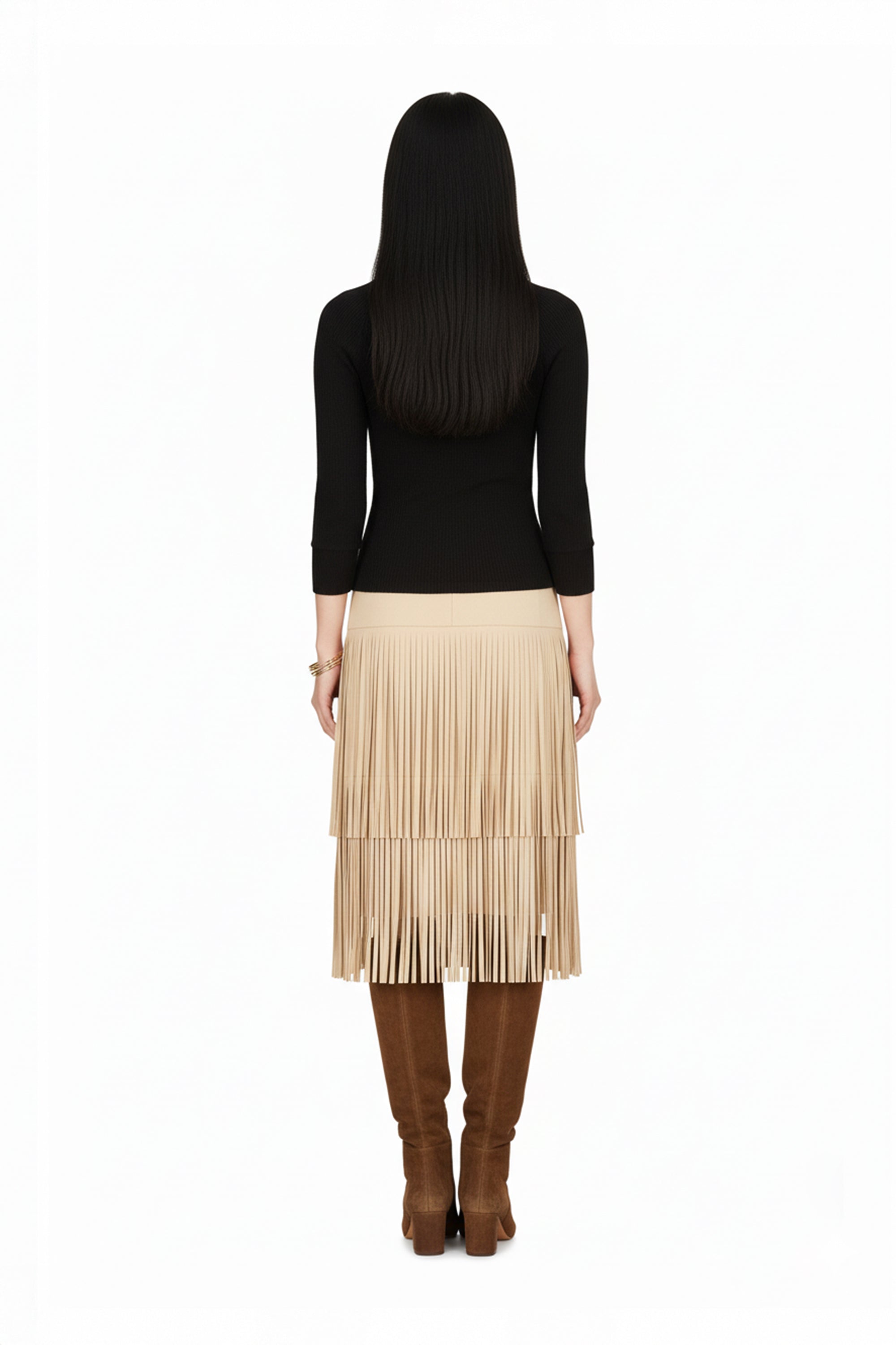 La falda con flecos largos aporta una elegancia natural y versátil. Su tono permite crear combinaciones sofisticadas y minimalistas, mientras los flecos aportan fluidez y movimiento. Ideal para looks diurnos o eventos casuales con un toque moderno y femenino.