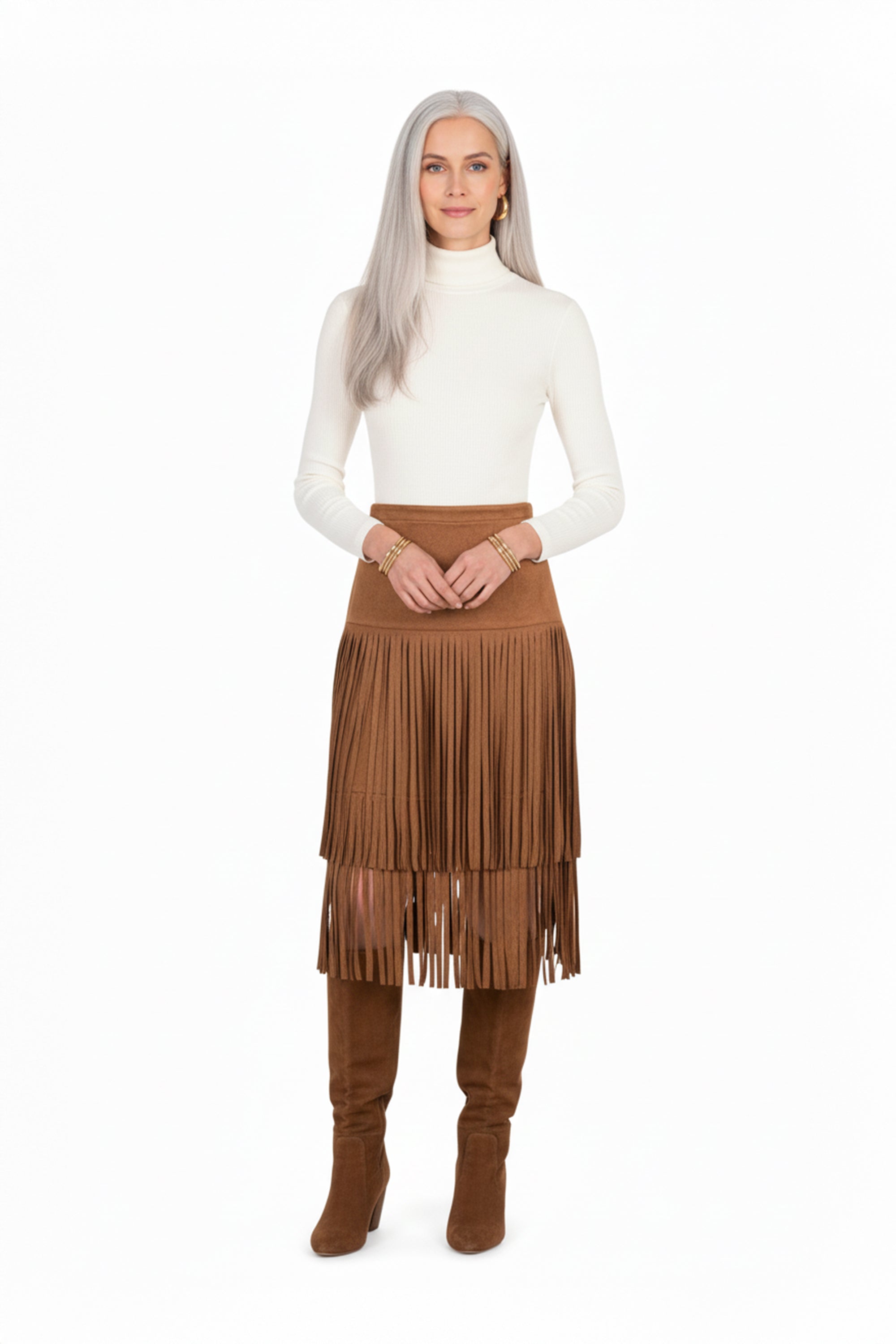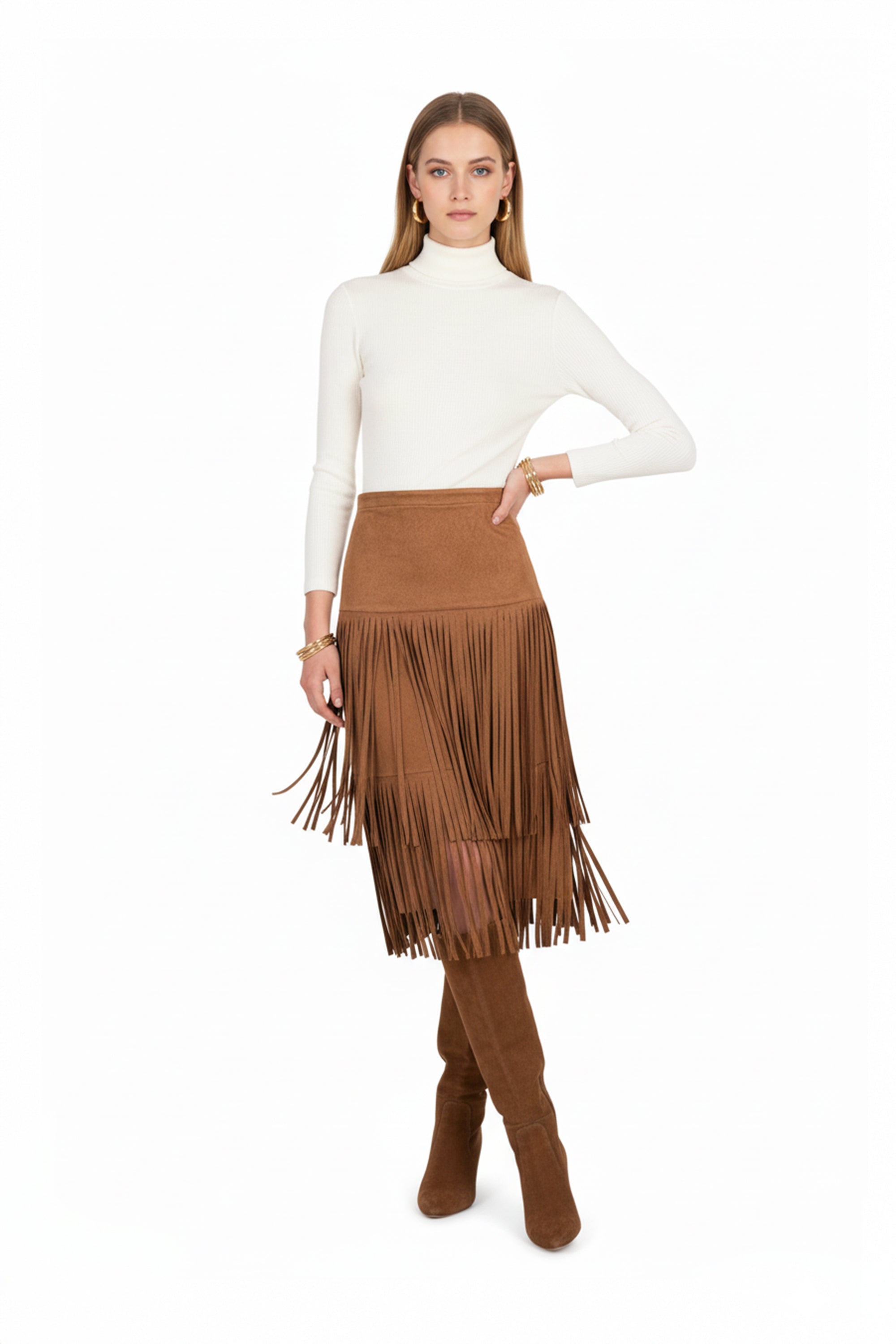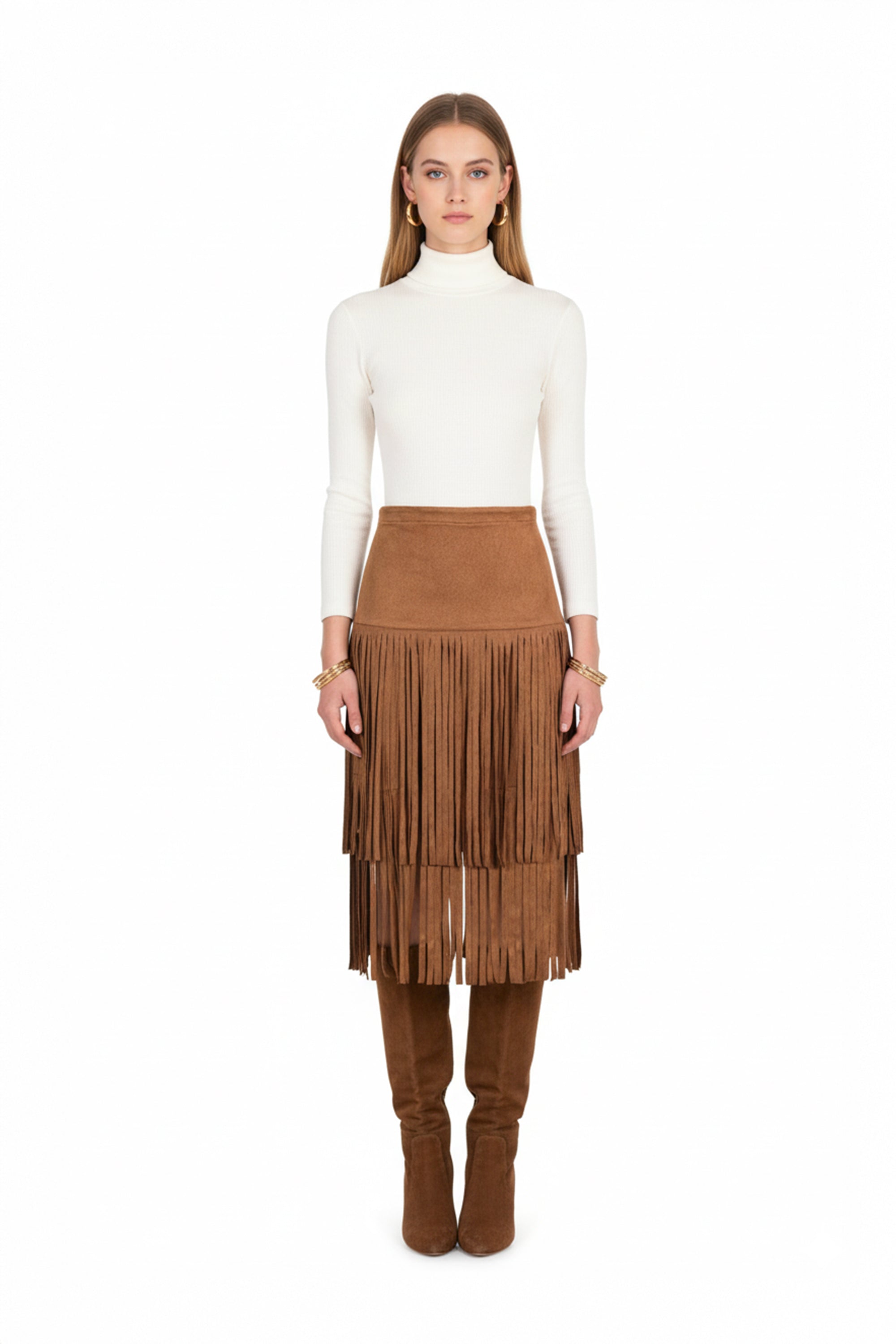 La falda con flecos largos aporta una elegancia natural y versátil. Su tono permite crear combinaciones sofisticadas y minimalistas, mientras los flecos aportan fluidez y movimiento. Ideal para looks diurnos o eventos casuales con un toque moderno y femenino.