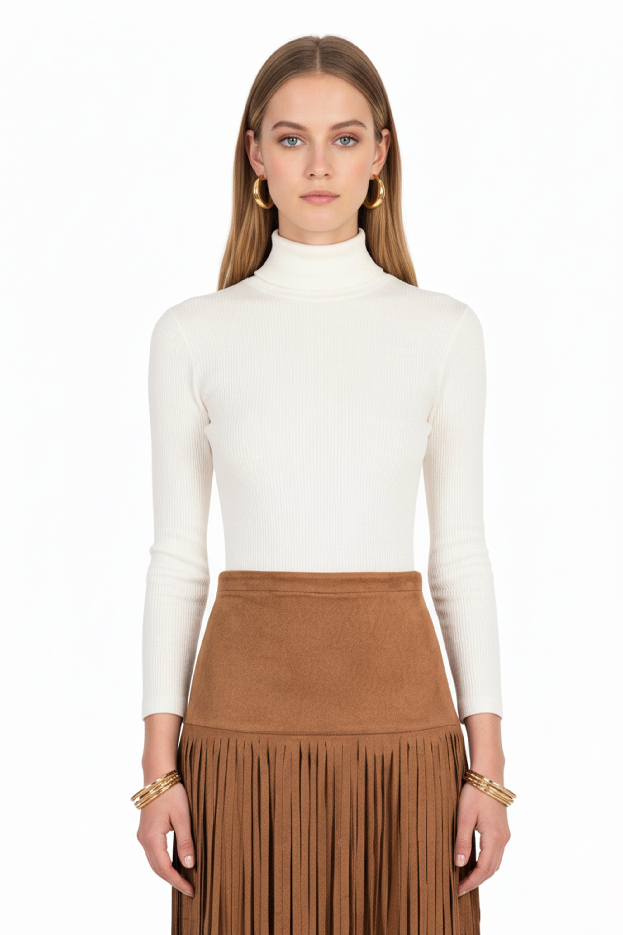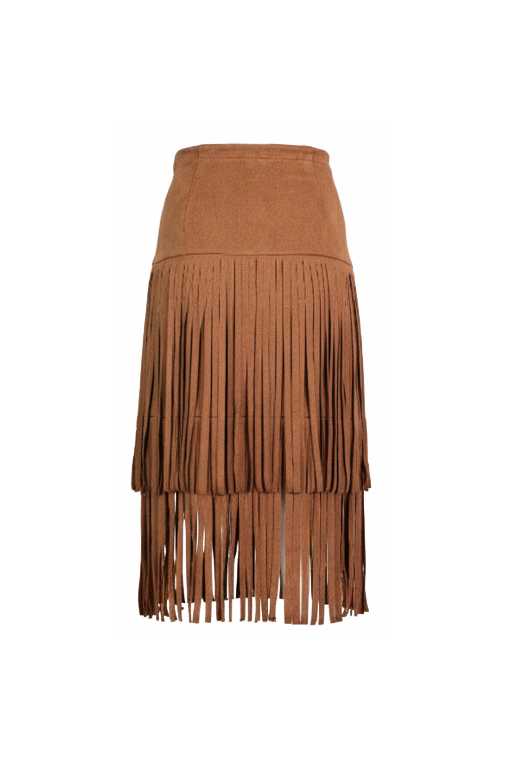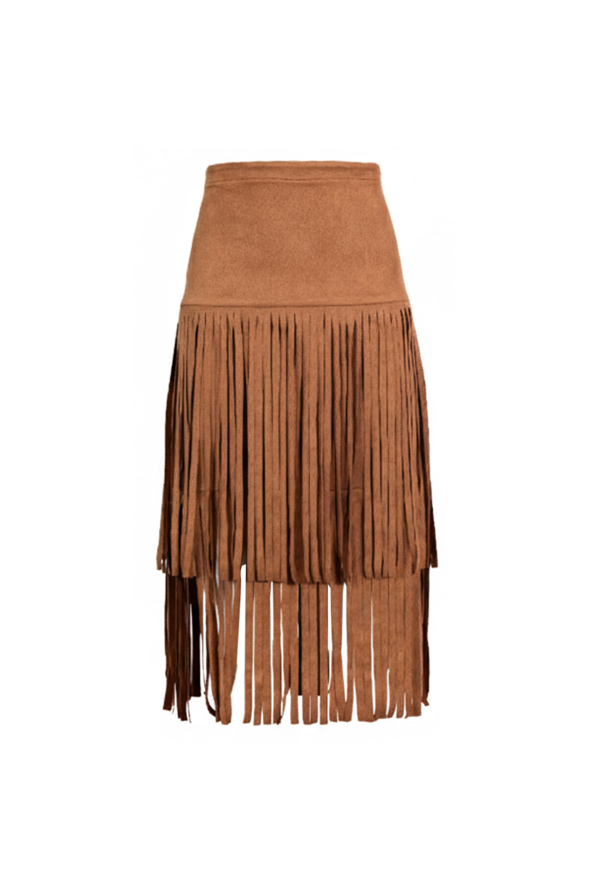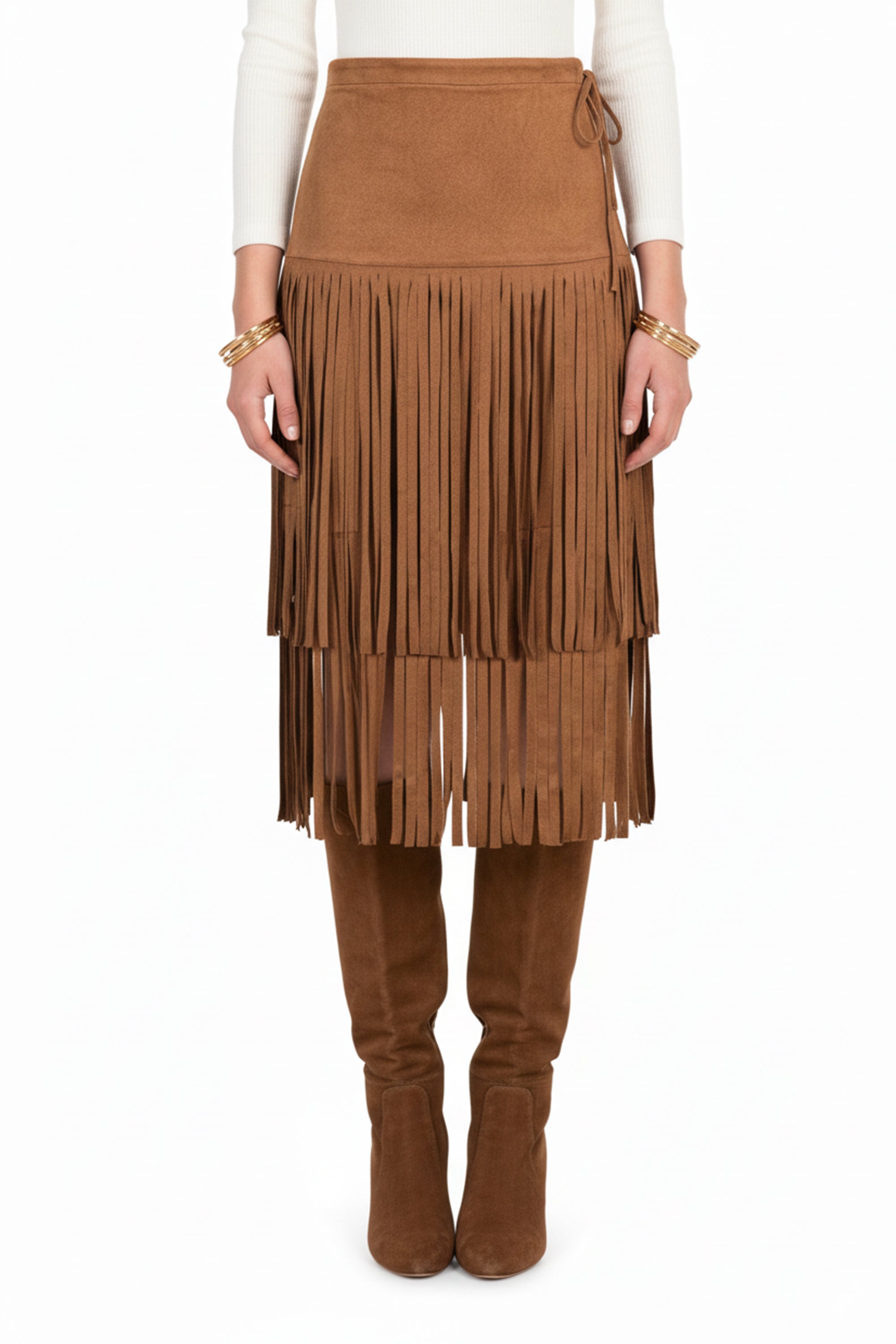 La falda con flecos largos aporta una elegancia natural y versátil. Su tono permite crear combinaciones sofisticadas y minimalistas, mientras los flecos aportan fluidez y movimiento. Ideal para looks diurnos o eventos casuales con un toque moderno y femenino.