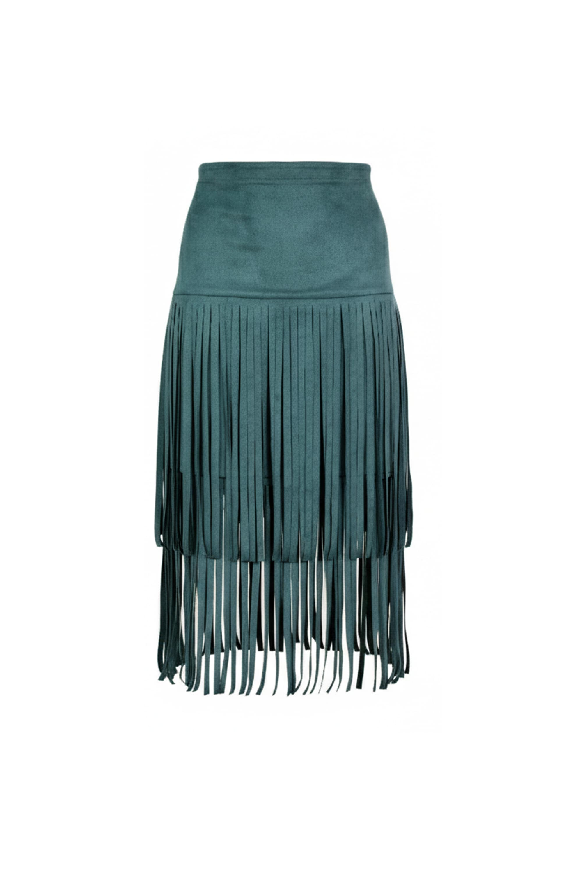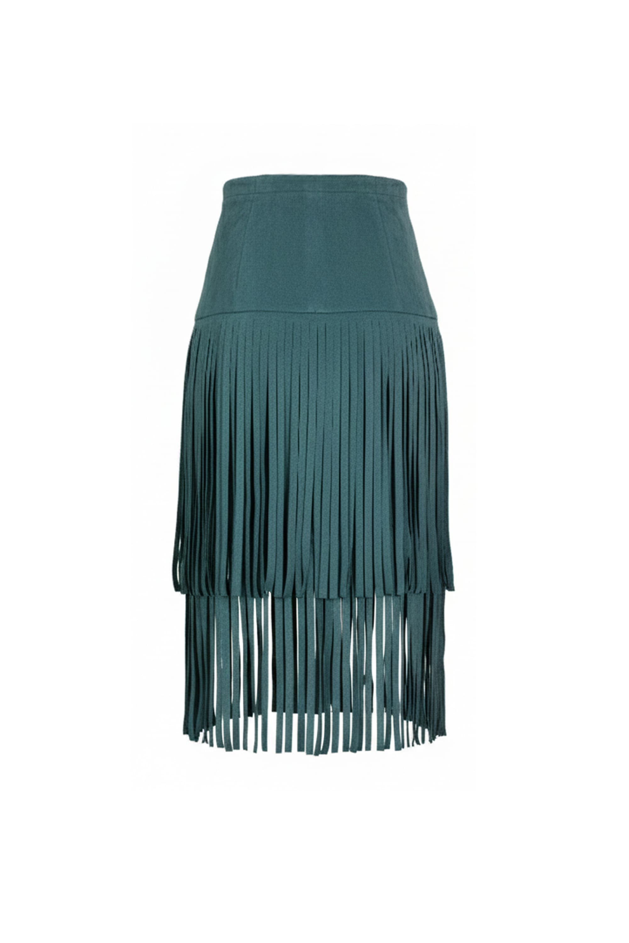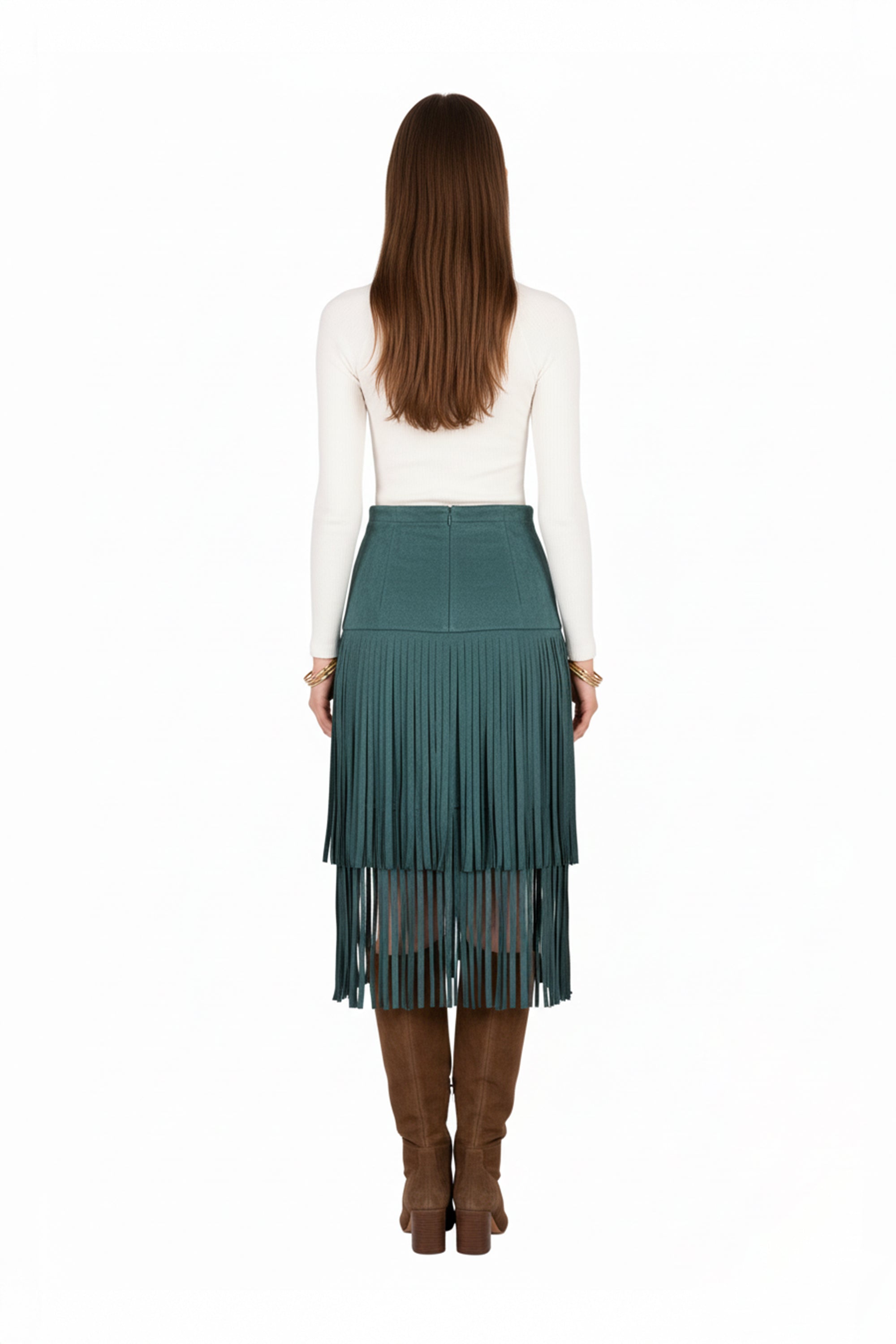La falda con flecos largos aporta una elegancia natural y versátil. Su tono permite crear combinaciones sofisticadas y minimalistas, mientras los flecos aportan fluidez y movimiento. Ideal para looks diurnos o eventos casuales con un toque moderno y femenino.