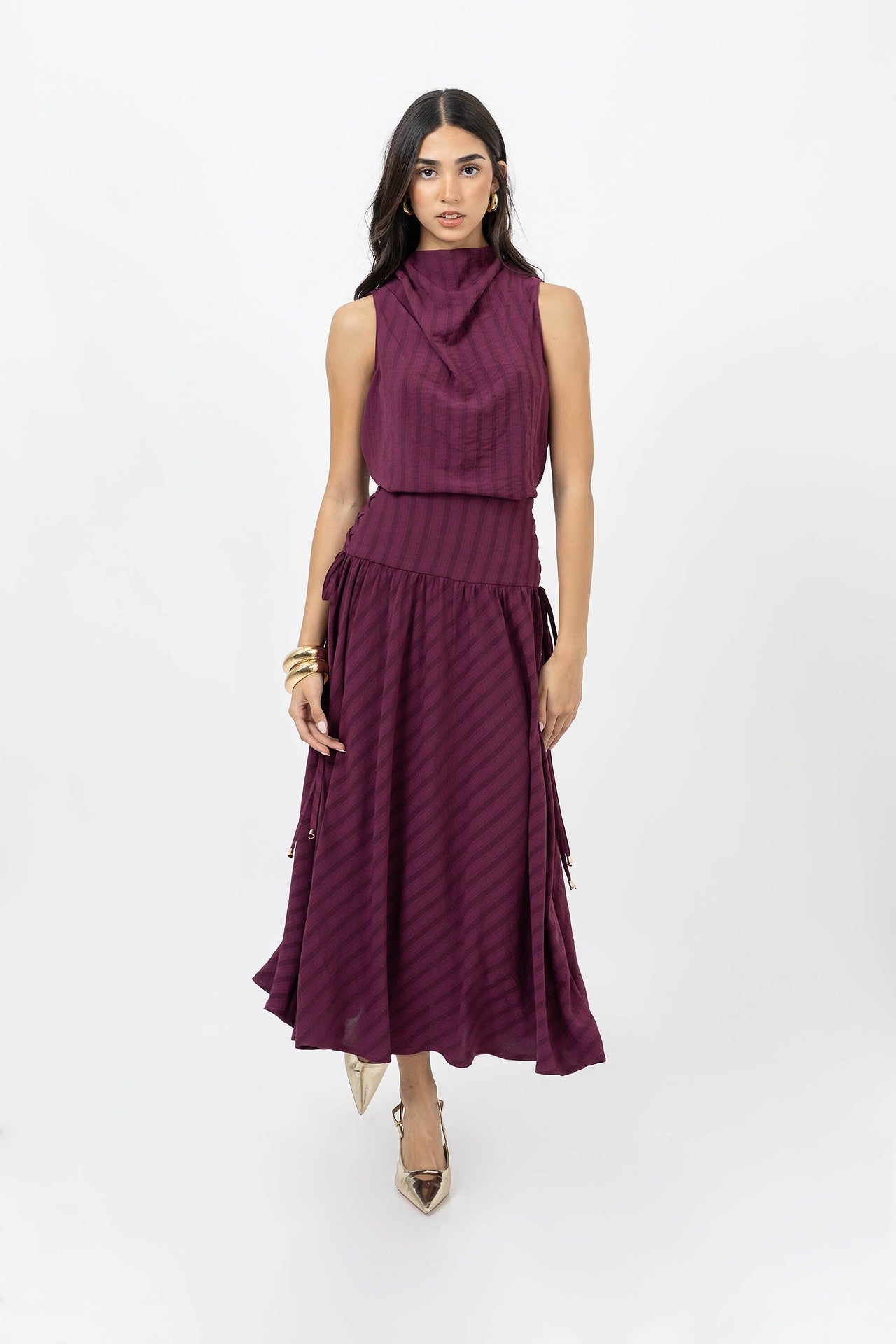 Este top destaca por su espectacular cuello tipo cowl (capucha) de gran volumen, que crea un drapeado artístico y fluido que enmarca el rostro con sofisticación. El diseño sin mangas realza la verticalidad de la pieza, mientras que su silueta de corte recto ofrece una estética minimalista que pone todo el foco visual en la arquitectura del escote. Presenta un sutil patrón, aportando una dimensión visual rítmica que estiliza la figura.