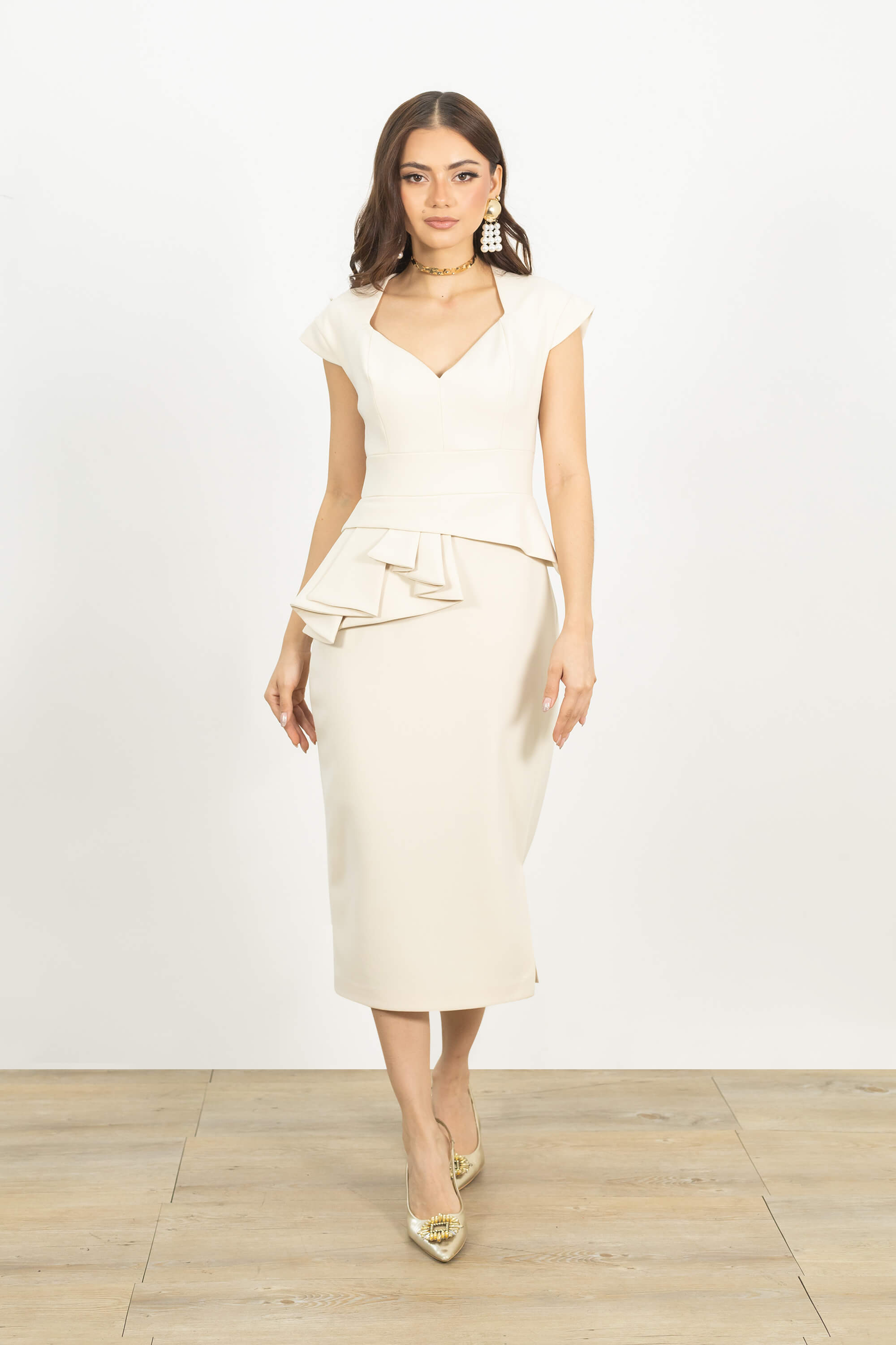 Este vestido de corte vaina (sheath) destaca por su refinado escote corazón enmarcado por una estructura de hombros definidos y mangas japonesas muy cortas, que aportan una línea moderna y escultural al torso. El punto focal del diseño es un sofisticado volante tipo peplum asimétrico situado en la cadera derecha, que añade un volumen dramático y rompe la linealidad de la prenda con una elegancia arquitectónica.