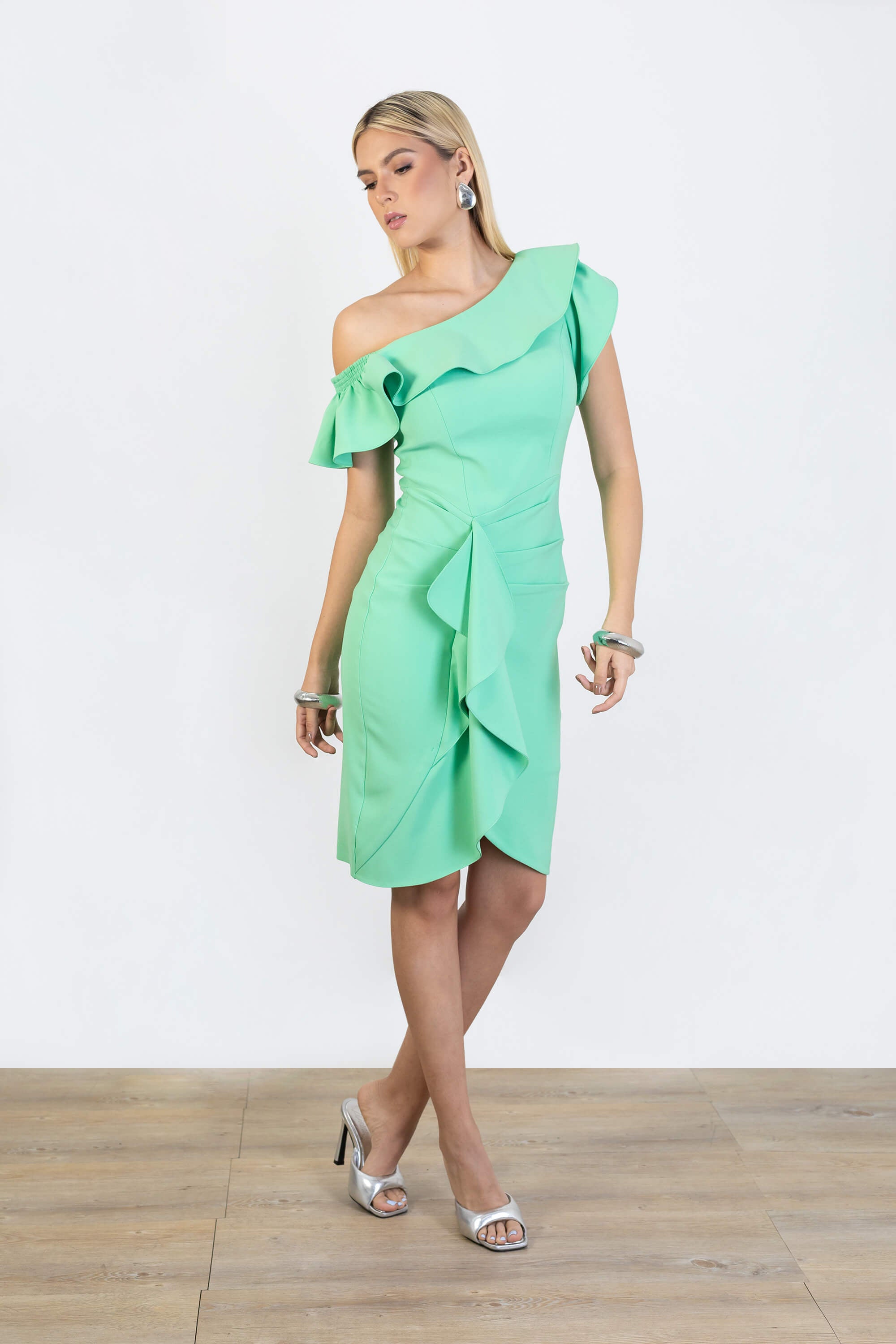 Este vestido destaca por su sofisticado escote asimétrico de un solo hombro, enmarcado por un dramático volante en cascada que aporta un volumen escultórico y un aire de alta costura contemporánea. El diseño se caracteriza por una construcción entallada que incluye un detalle de volante vertical en el lateral de la falda, creando un efecto visual de movimiento rítmico y sofisticación arquitectónica.