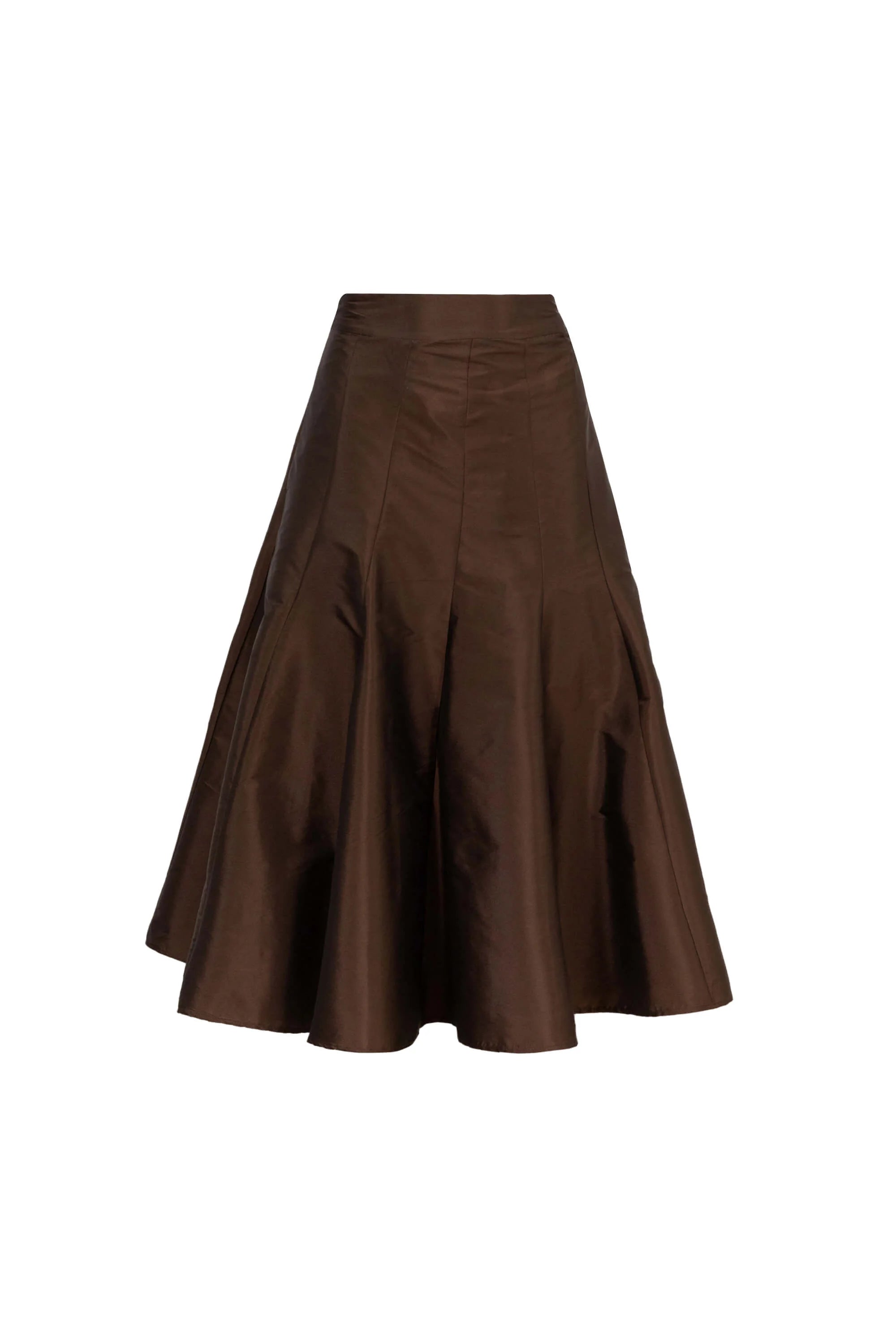 Confeccionada en 100% Poliamida de alta gama, esta prenda presenta un acabado tipo tafetán con un brillo tornasolado que captura la luz en cada ángulo. La construcción técnica destaca por la precisión de sus costuras de unión en los paneles, las cuales refuerzan la estructura acampanada sin añadir peso innecesario. El tejido posee una rigidez elegante que mantiene la forma de la falda durante todo su uso, garantizando una presencia impecable.