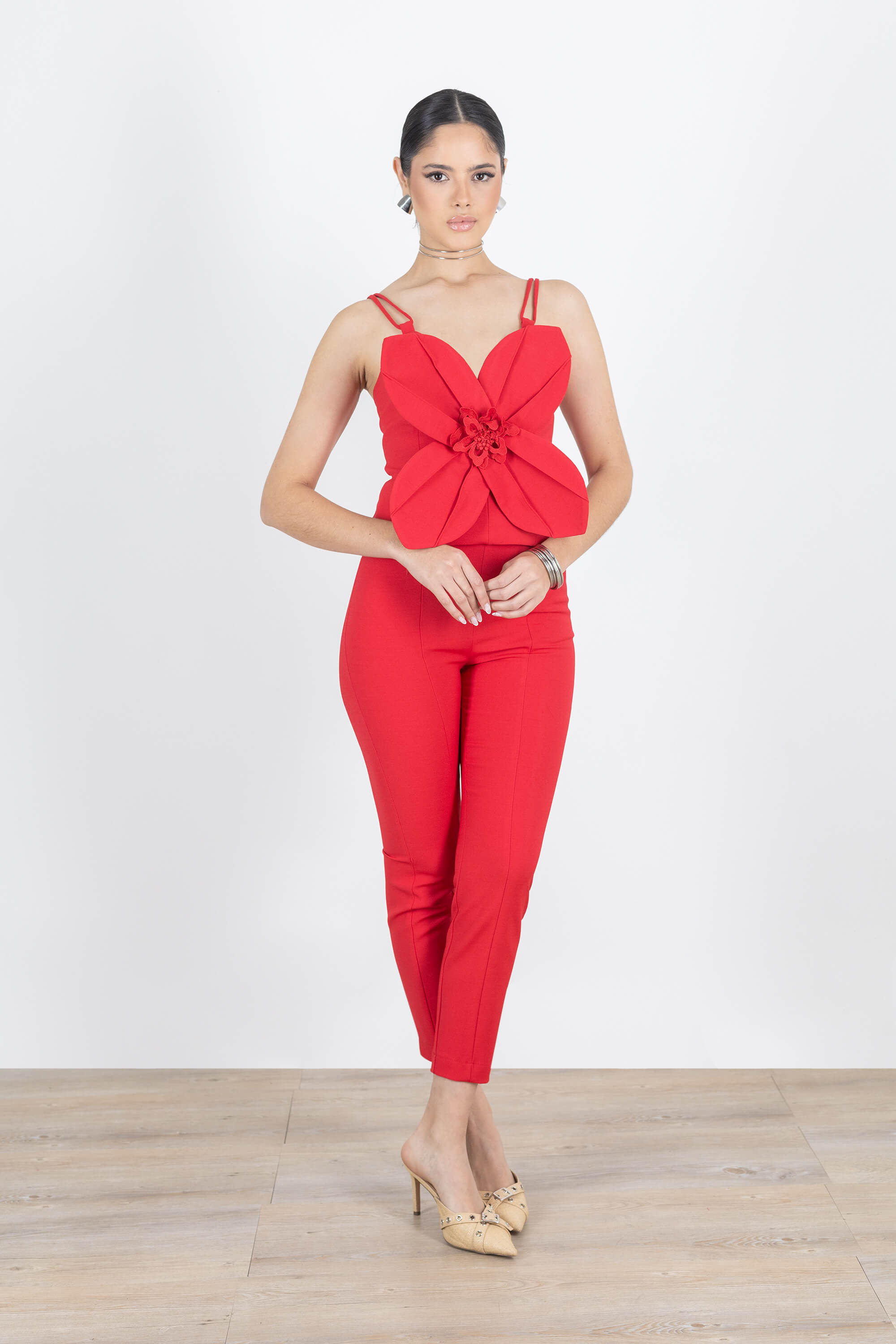 La pieza está elaborada en una mezcla técnica premium de 78% Poliéster, 18% Rayón y 4% Spandex. Esta composición ha sido seleccionada por su excepcional capacidad para sostener la compleja estructura rígida del diseño sin sacrificar la suavidad al tacto. El rayón garantiza un acabado sedoso y fresco, el poliéster asegura una alta durabilidad y la pureza del color, mientras que el toque de spandex proporciona la elasticidad necesaria para asegurar un ajuste firme y cómodo que moldea la silueta con precisión.