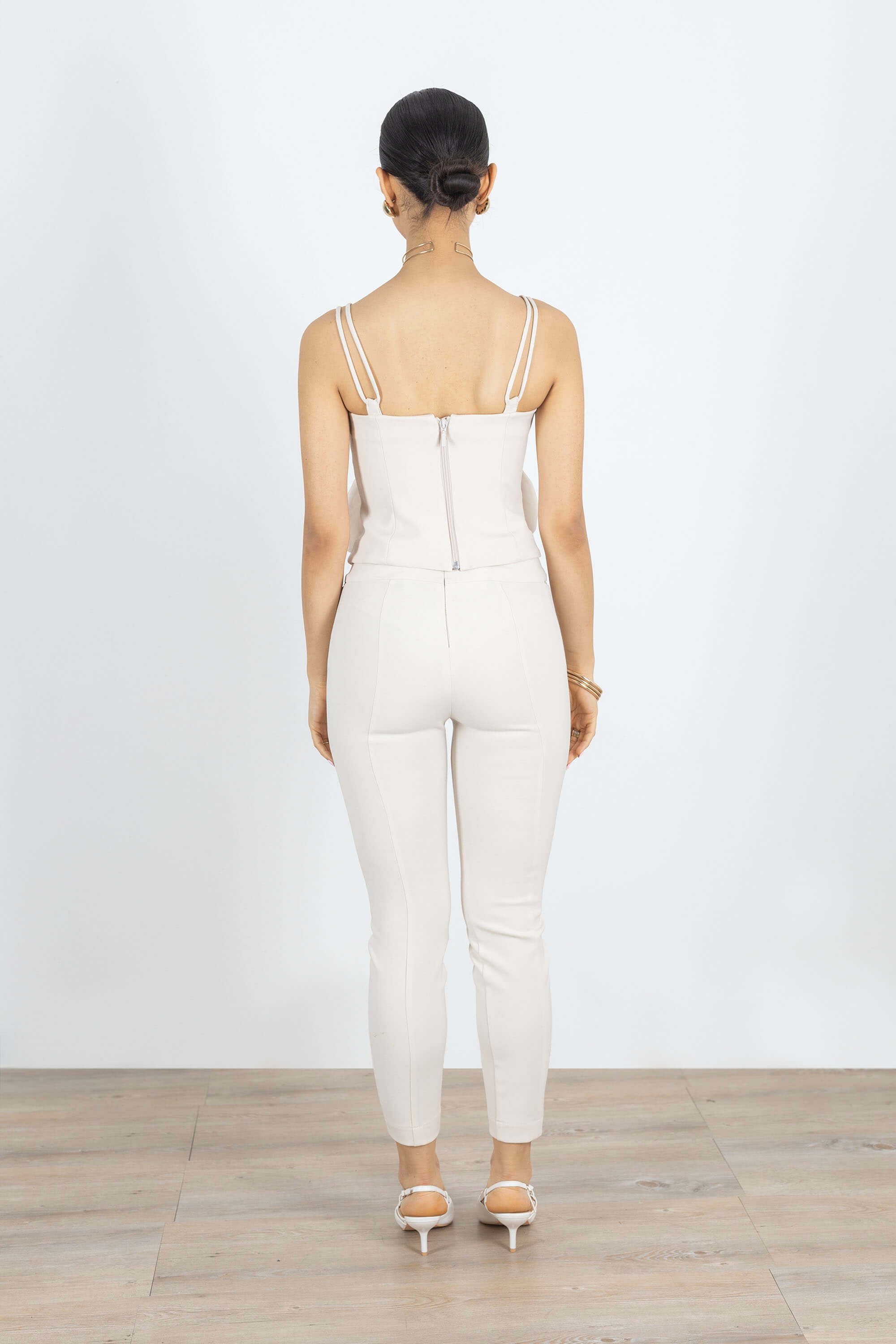 El modelo ofrece un ajuste de precisión slim fit, incorporando tirantes finos regulables que permiten personalizar la sujeción con una comodidad absoluta. La parte posterior presenta un acabado impecable con una cremallera central tonal, que mantiene la línea limpia de la prenda y asegura un cierre discreto y firme. Los acabados de alta gama y la audacia de su silueta definen este top como un esencial de diseño de autor, ideal para la mujer que busca piezas de inversión que fusionen la fantasía romántica con una visión moderna de la elegancia.
