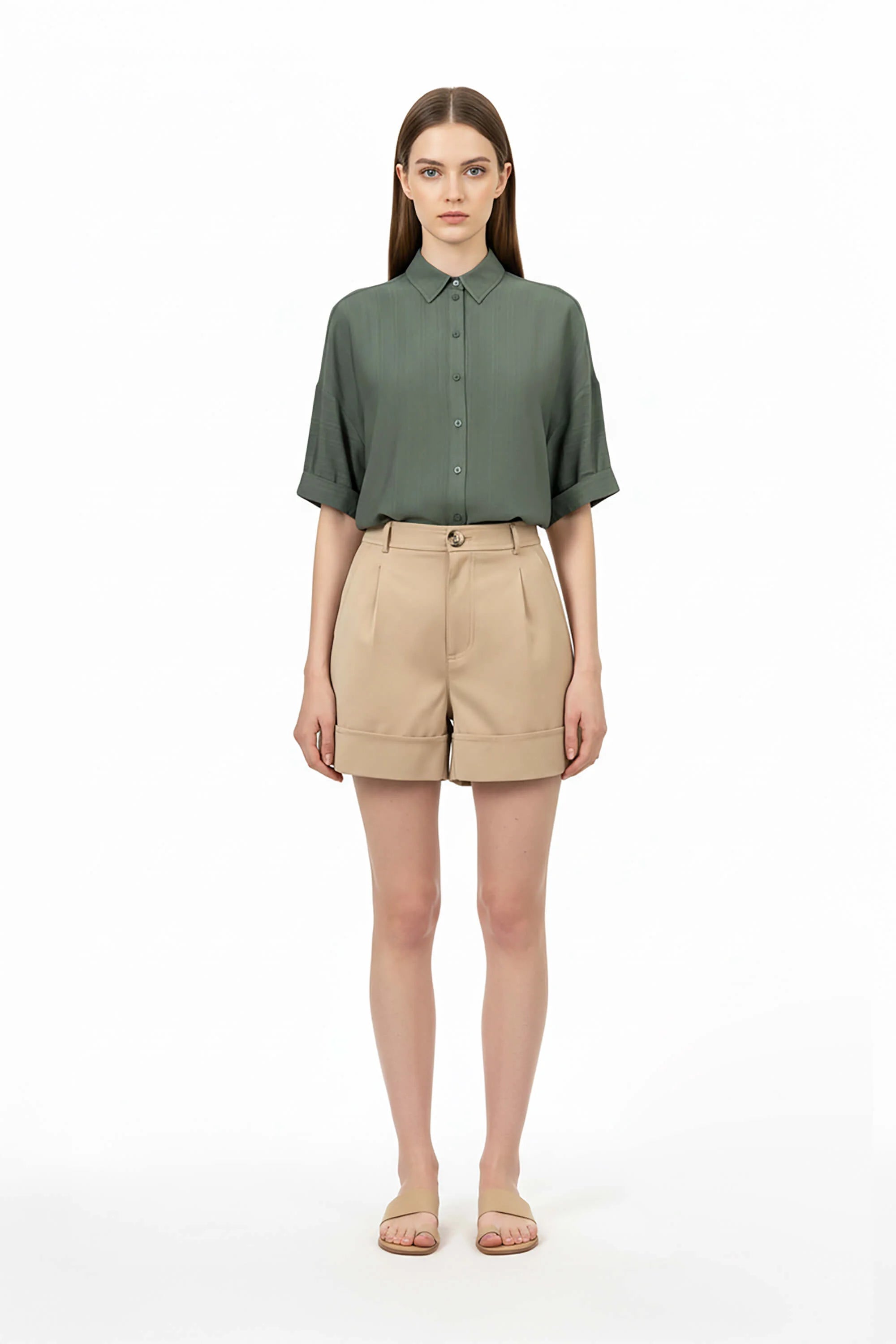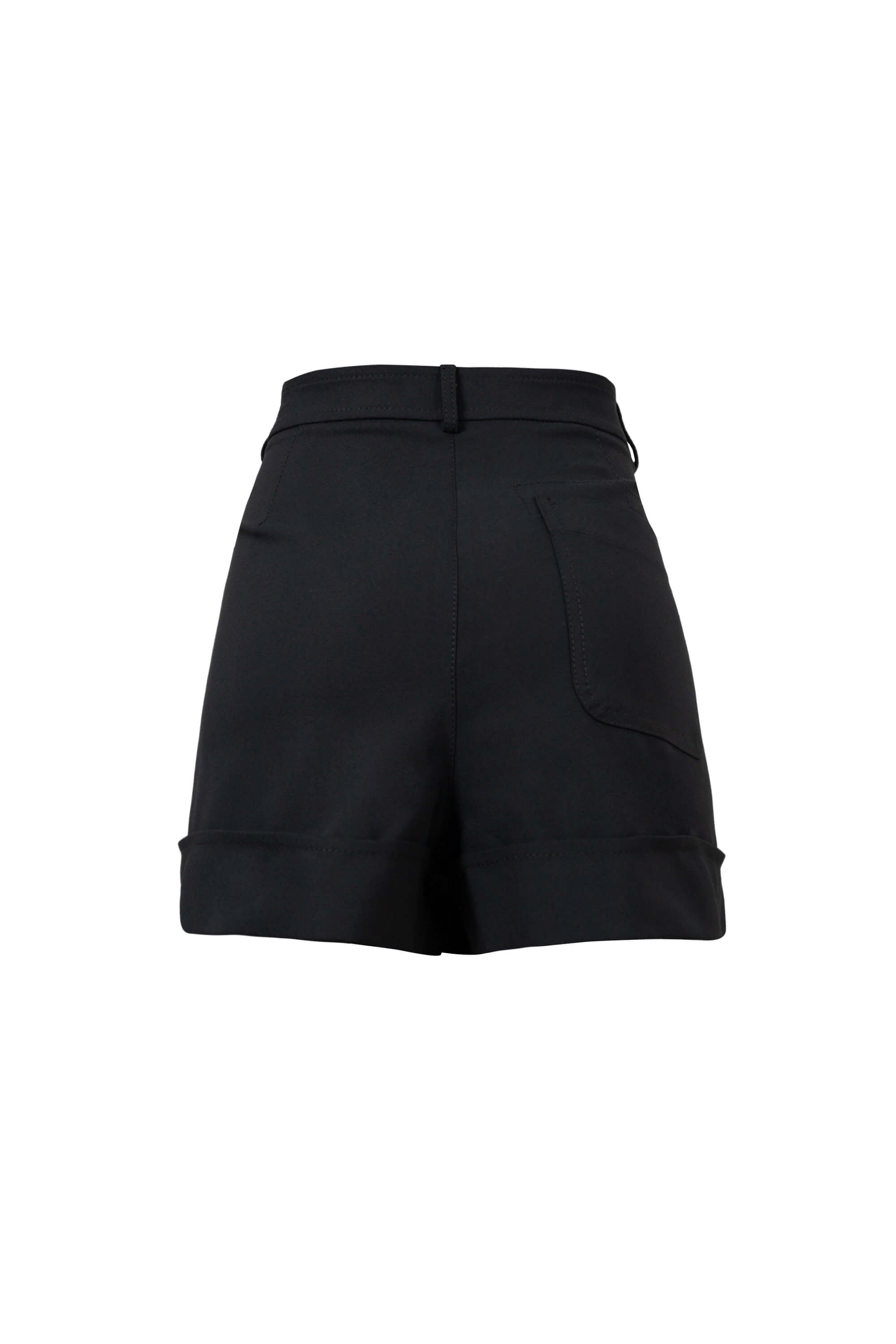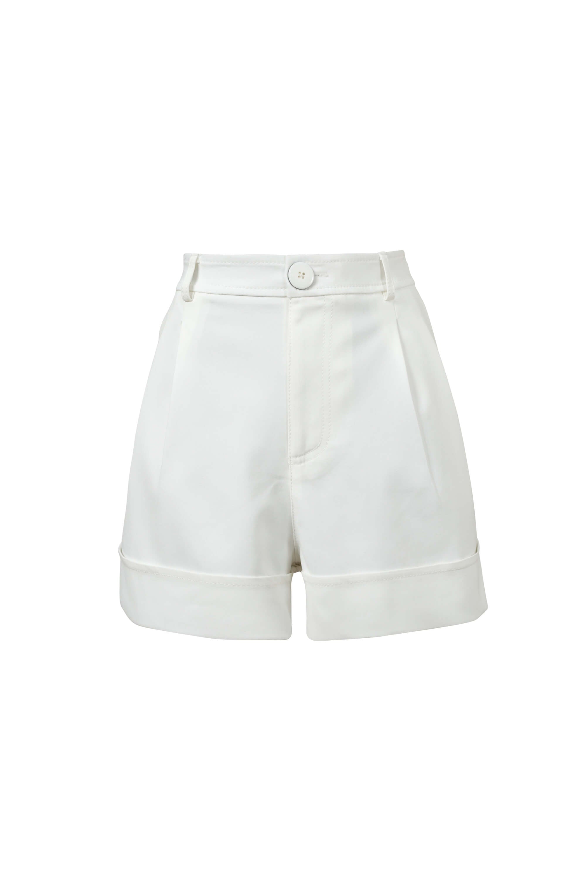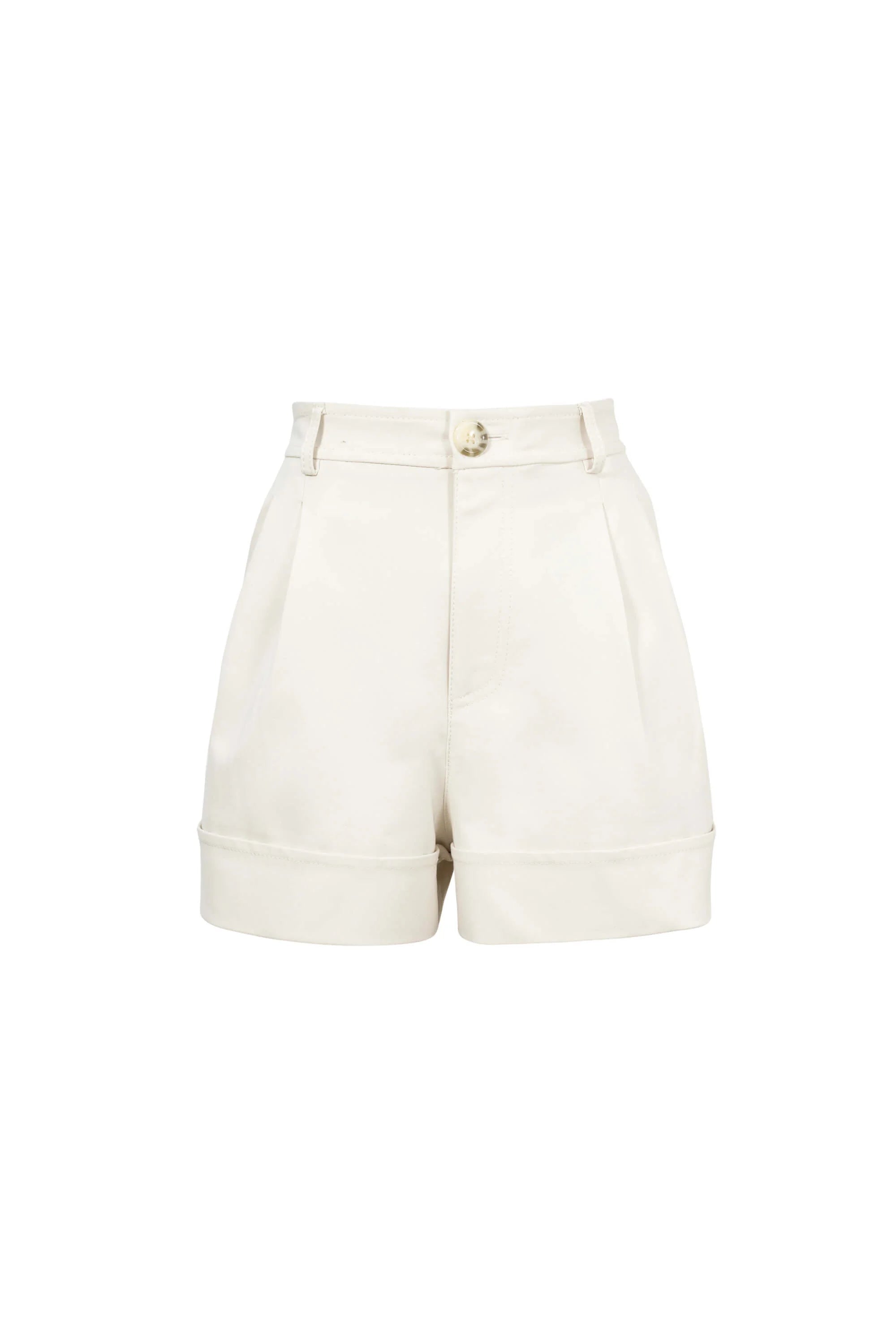 Este short destaca por su impecable silueta de corte sastre y talle alto, diseñada para definir la cintura y ofrecer una presencia de elegancia relajada pero sumamente estructurada. El punto focal de diseño es su bajo con vuelta (cuff) ancha y marcada, que aporta una terminación de alta gama y una verticalidad sutil a las piernas. Se caracteriza por un frontal depurado con pinzas suaves que proyectan una imagen de lujo contemporáneo y precisión en el patronaje.
