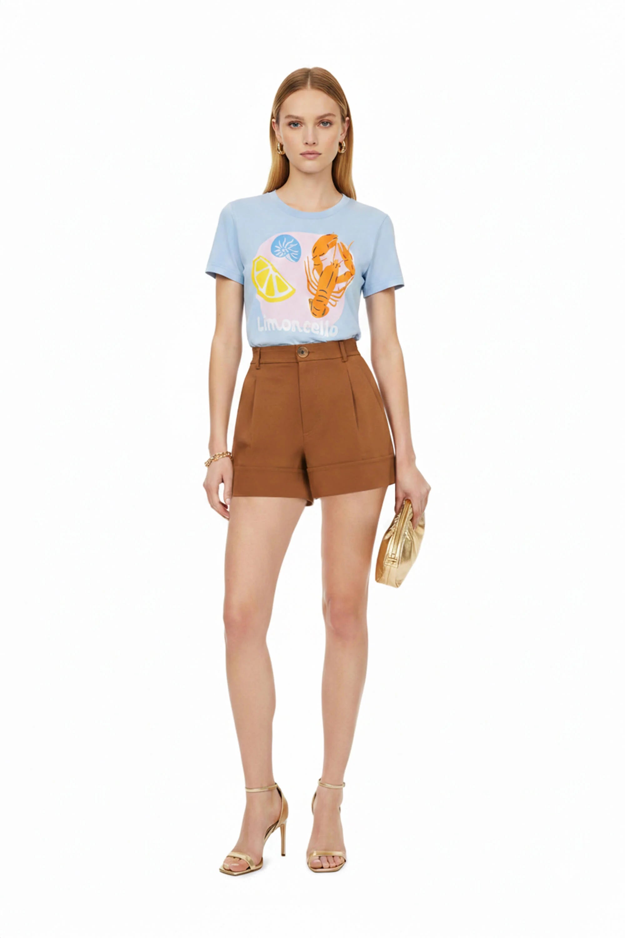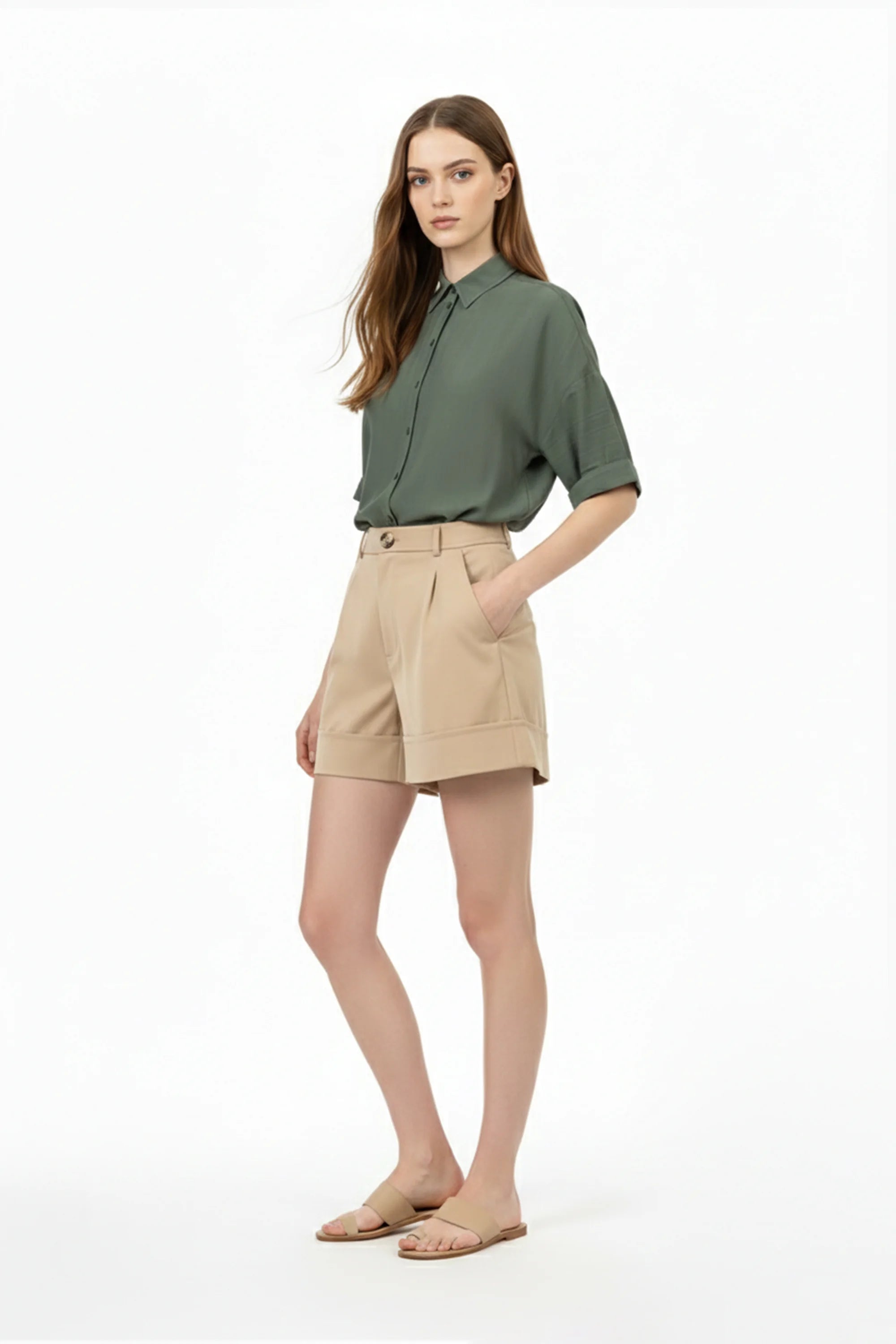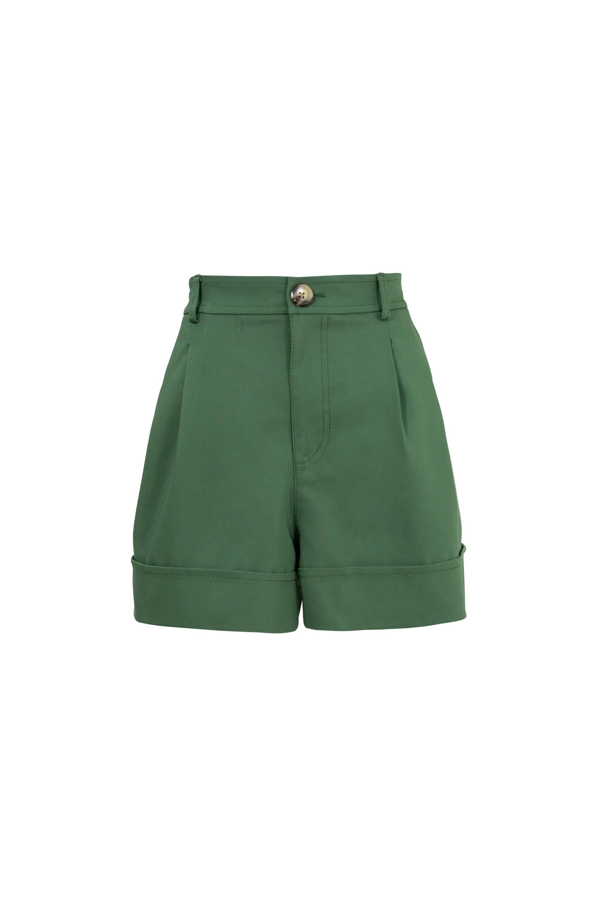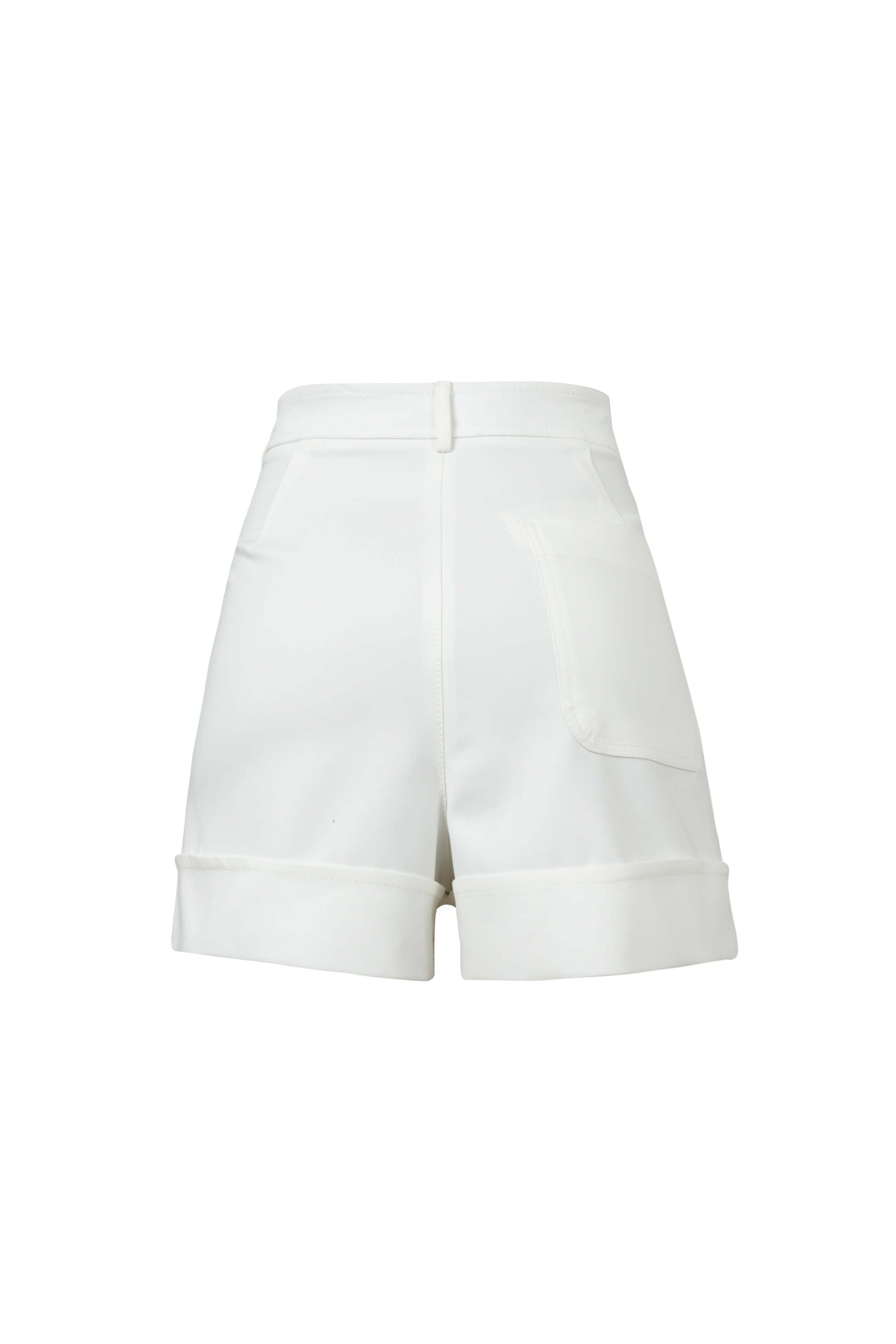 Este short destaca por su impecable silueta de corte sastre y talle alto, diseñada para definir la cintura y ofrecer una presencia de elegancia relajada pero sumamente estructurada. El punto focal de diseño es su bajo con vuelta (cuff) ancha y marcada, que aporta una terminación de alta gama y una verticalidad sutil a las piernas. Se caracteriza por un frontal depurado con pinzas suaves que proyectan una imagen de lujo contemporáneo y precisión en el patronaje.