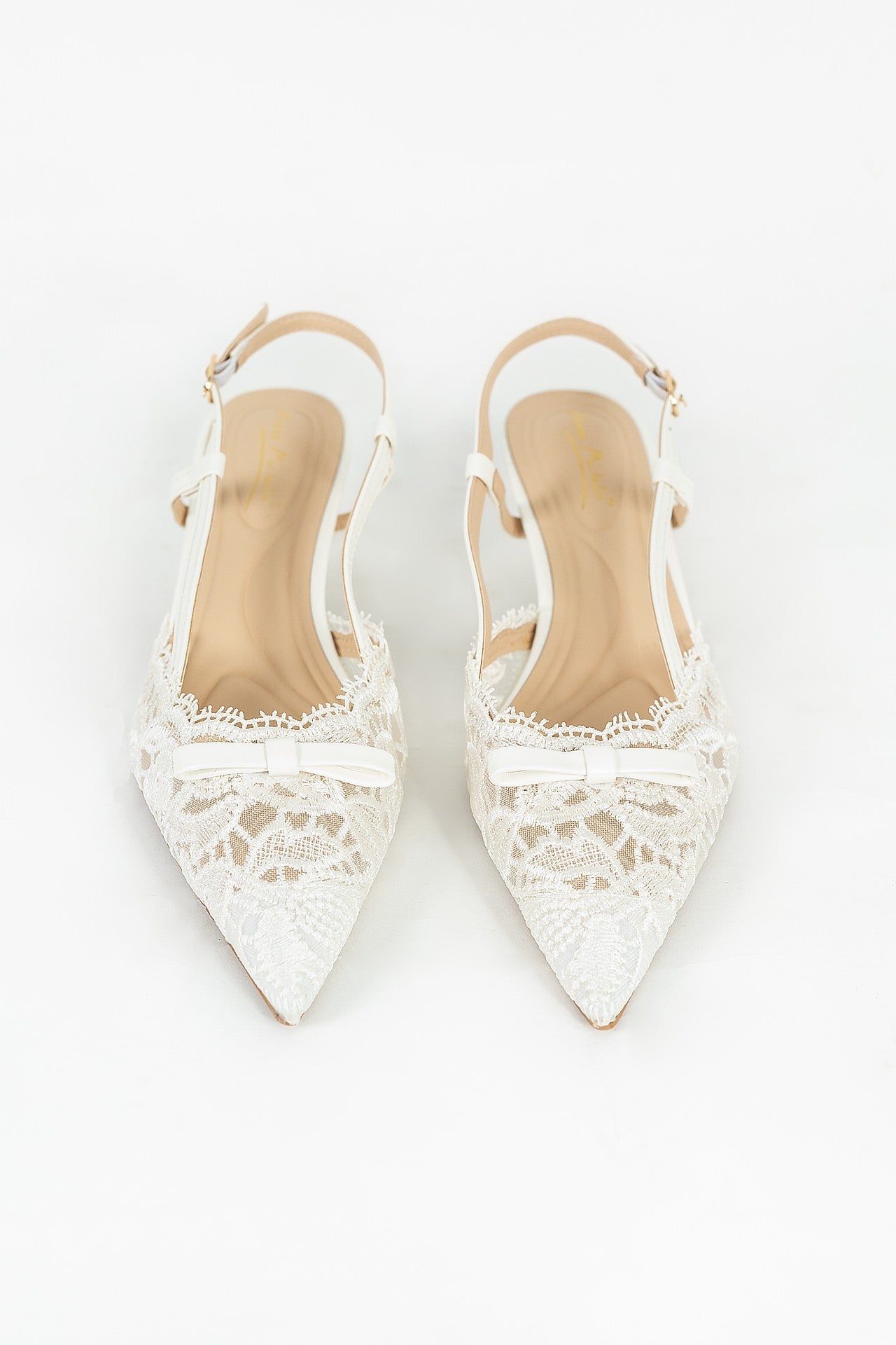 Estos zapatos representan la feminidad etérea y el lujo artesanal. El modelo es un Slingback (talón abierto) que destaca por su confección integral en encaje floral (lace) de alta densidad. La silueta de punta afilada (pointed toe) está adornada con un delicado lazo en la parte superior, que añade un toque romántico y refinado. Es la pieza definitiva para quienes buscan un calzado que combine la estética clásica de ceremonia con detalles contemporáneos.