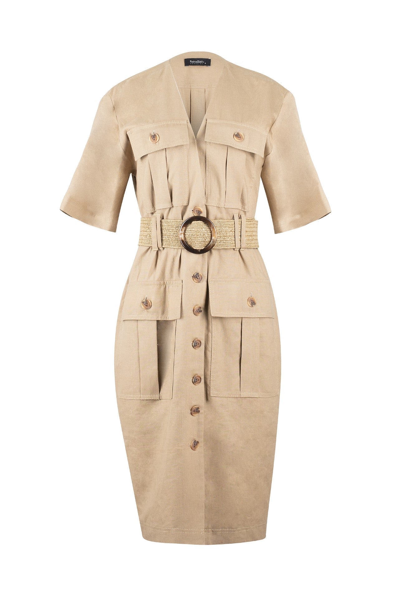 Este vestido destaca por su estética safari contemporánea, presentada en un sofisticado color beige arena. Presenta un elegante cuello en V estilizado sin solapas, que aporta una línea limpia y moderna al torso. El diseño se caracteriza por su enfoque funcional de alta gama, incluyendo múltiples bolsillos de parche con solapa y botones en el pecho y la cadera, los cuales añaden una dimensión arquitectónica y utilitaria a la silueta.