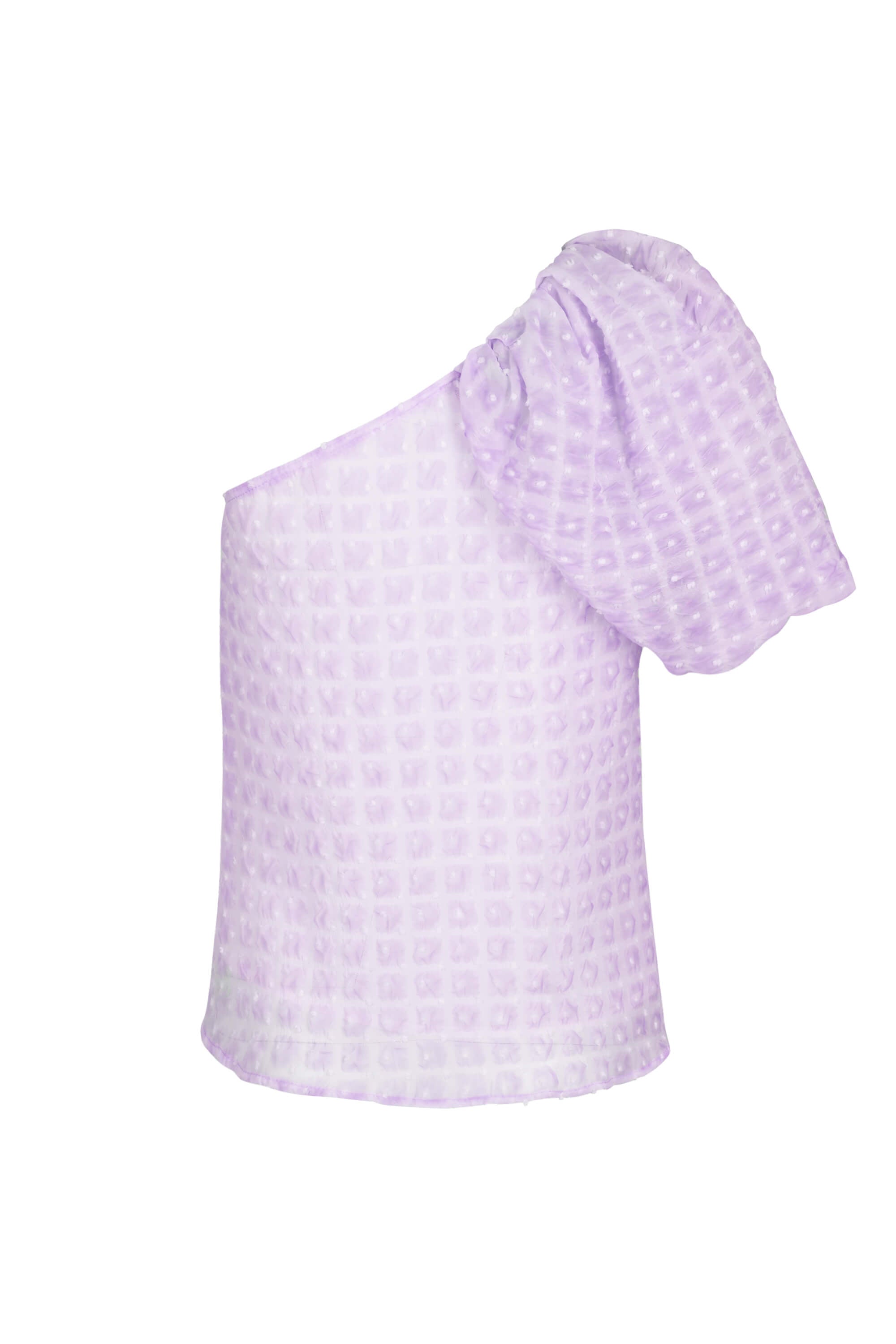Esta blusa destaca por su seductora silueta de un solo hombro (one-shoulder), que enmarca la clavícula con una elegancia moderna y minimalista. El punto focal de diseño es su manga corta con volantes voluminosos, que añade un movimiento dramático y una estructura romántica a la prenda. Se caracteriza por un tejido con un patrón geométrico de pequeños cuadros en relieve, proyectando una imagen de alta costura con una textura visualmente cautivadora.