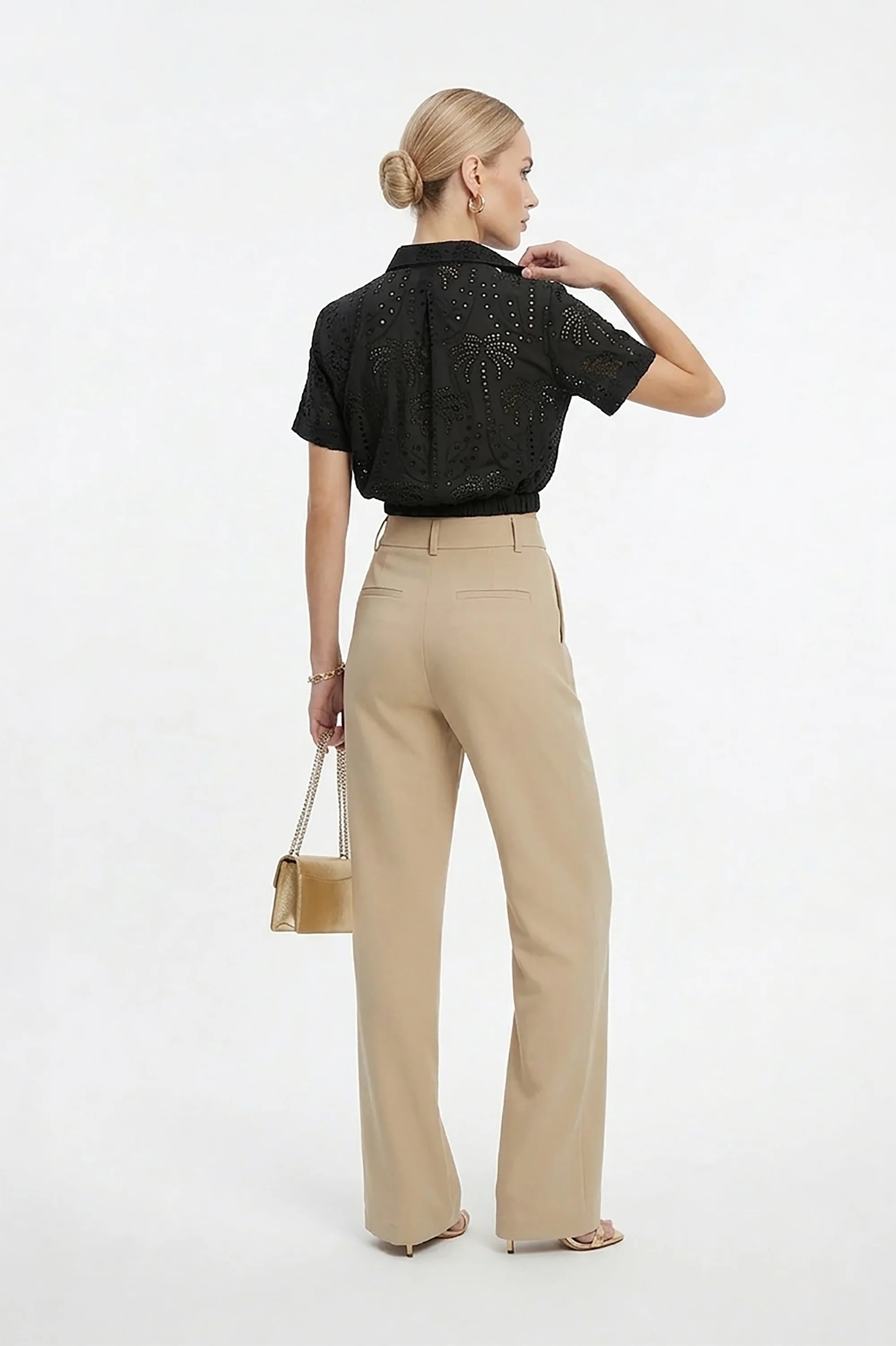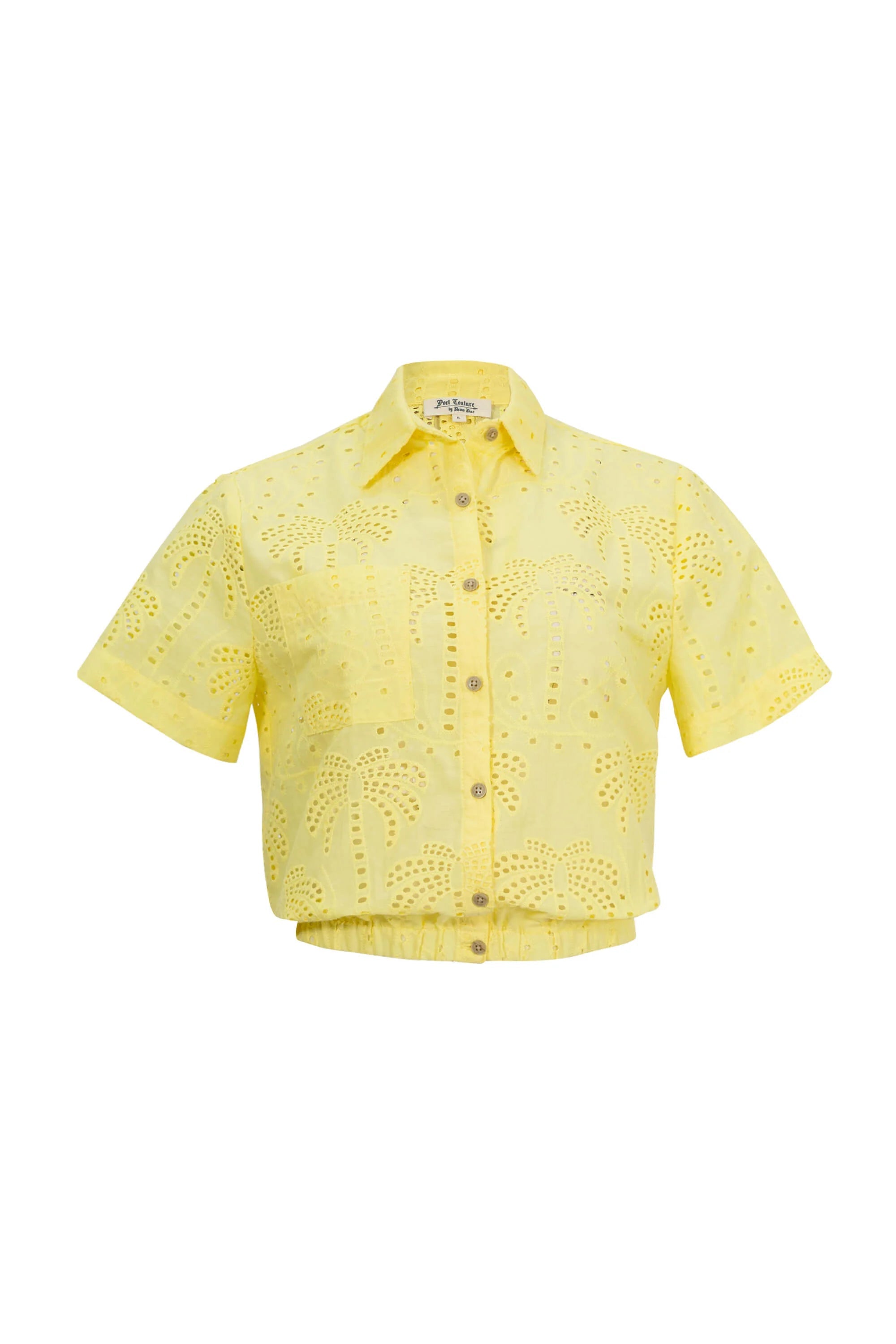 Esta blusa de manga corta destaca por su exquisito trabajo de bordado eyelet (perforado), que forma patrones artísticos de palmeras y motivos botánicos en toda la prenda. El diseño cuenta con un cuello camisero clásico y una botonadura frontal completa, fusionando la estructura de una camisa tradicional con la delicadeza del encaje artesanal. El detalle distintivo es su pretina elástica fruncida, que crea un ligero efecto blouson y define la cintura con modernidad.