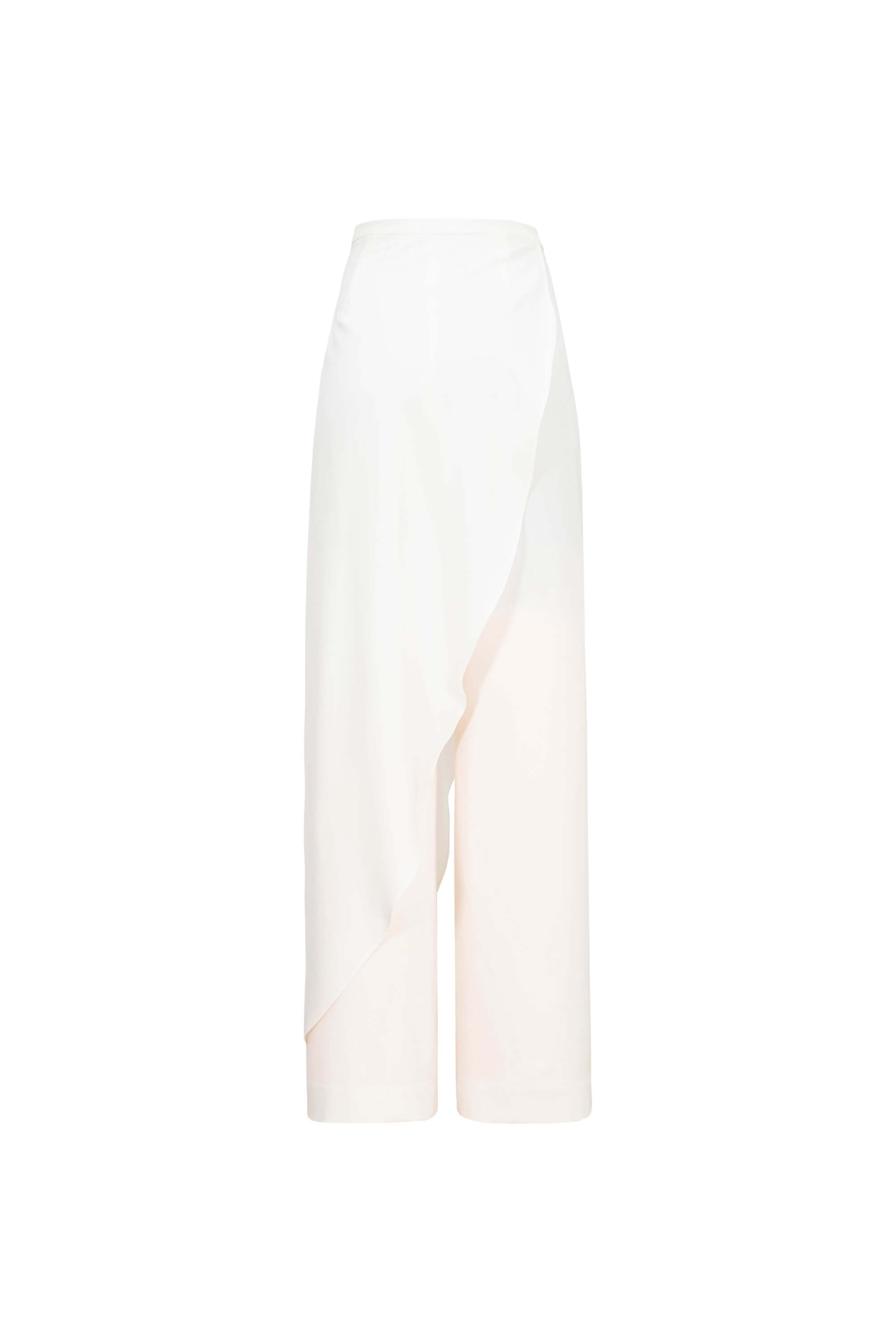 Este pantalón destaca por su impecable silueta híbrida de pierna recta (straight-leg) y talle alto, diseñada para alargar visualmente la figura mientras fusiona la sobriedad del pantalón sastre con el movimiento romántico de una falda. El punto focal de diseño es su sofisticado overlay asimétrico drapeado que nace en la cintura y cae con gracia sobre una de las piernas, creando un juego de volúmenes arquitectónicos único en su clase. Se caracteriza por una pretina limpia y minimalista que proyecta una imagen de alta costura contemporánea y precisión técnica.