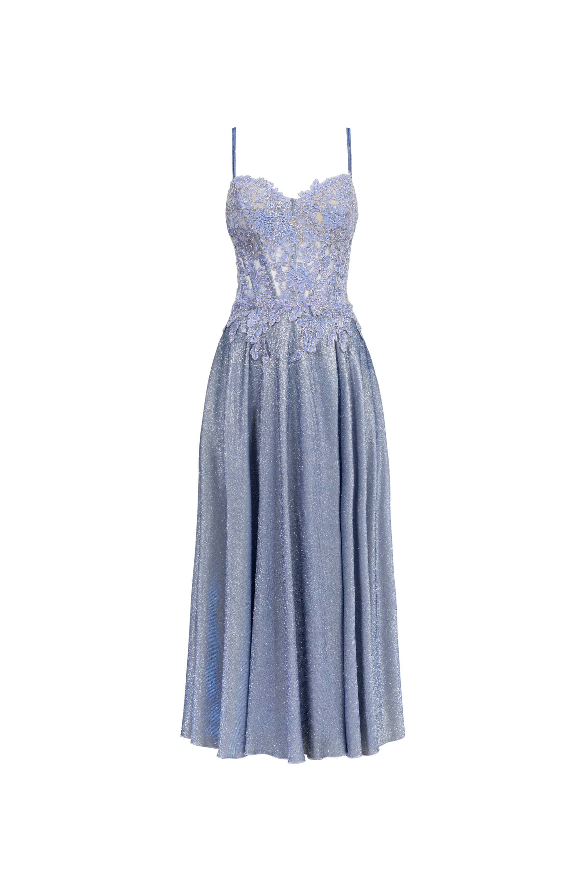 La pieza está elaborada en un tejido de malla técnica premium con acabado de glitter integral. Este material ha sido seleccionado por su excepcional capacidad para capturar y reflejar la luz, creando un efecto de brillo multidimensional que fluye a través de los pliegues de la falda. El textil garantiza una caída vaporosa y ligera, manteniendo la estructura evasé mientras ofrece una suavidad interior óptima, asegurando que el tono azul lavanda conserve su pureza y resplandor bajo cualquier iluminación.