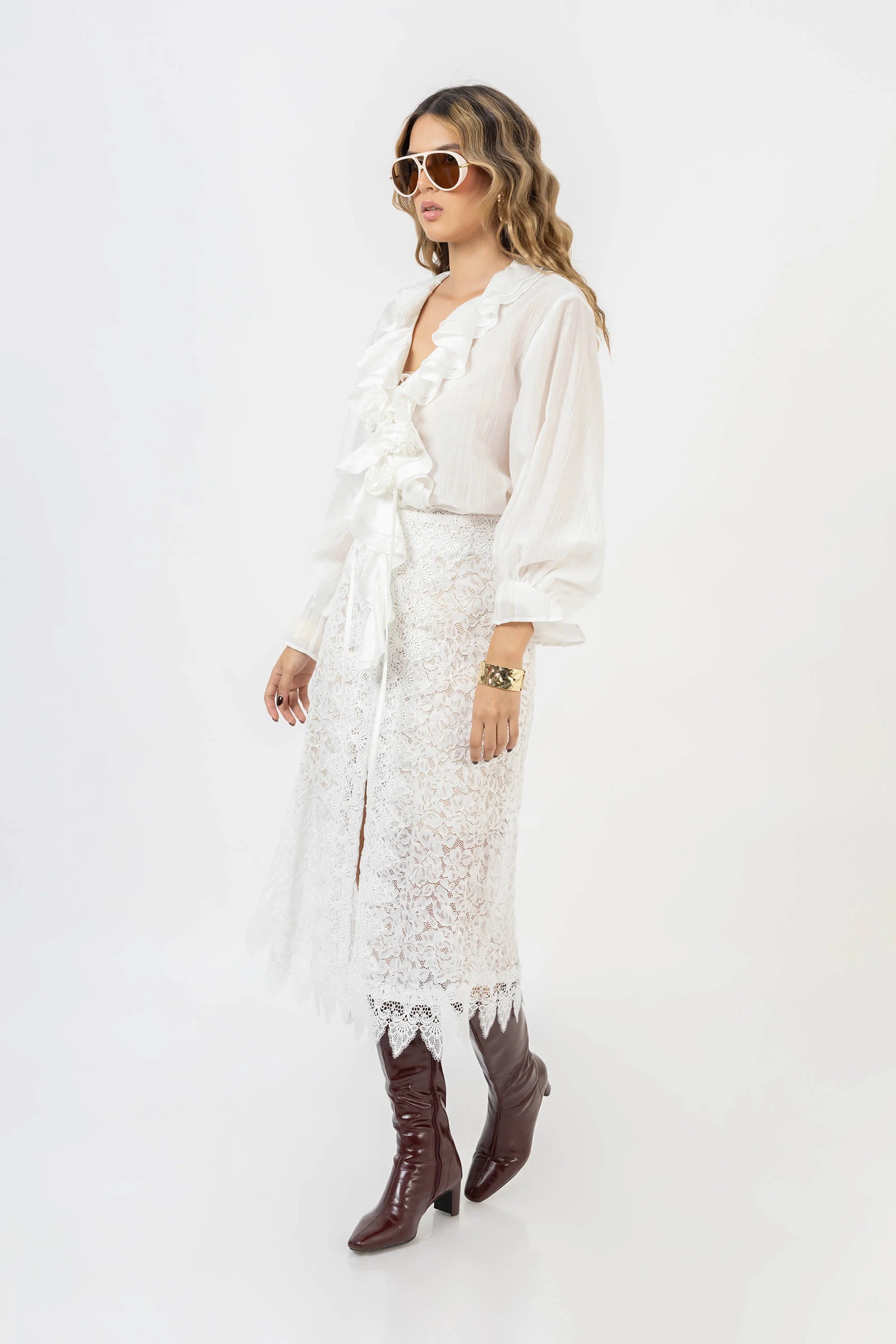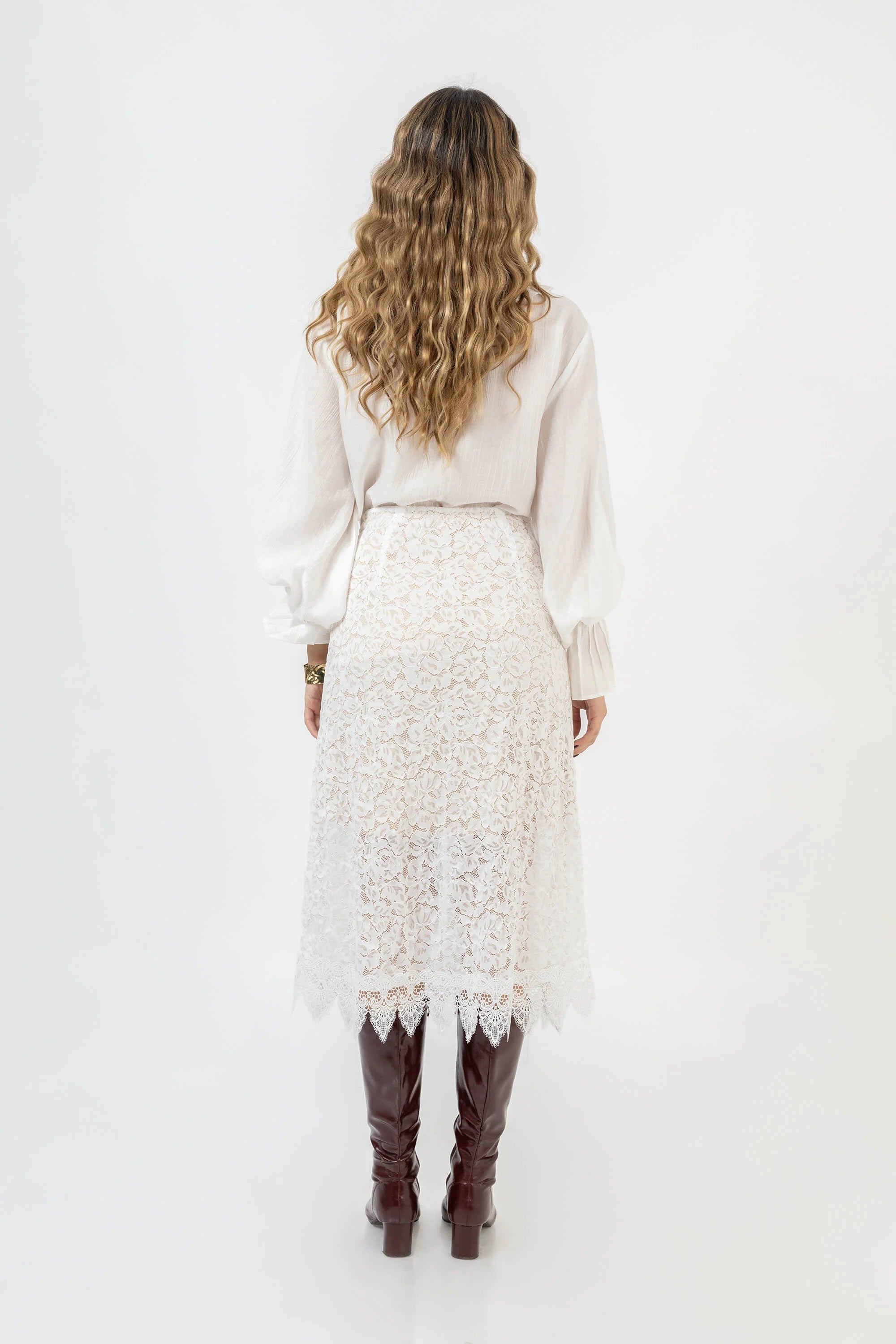 La falda Natalia es una pieza de silueta recta con una caída fluida que llega hasta un largo midi sofisticado. Su diseño se caracteriza por un exquisito encaje floral integral en tono marfil, que aporta una textura rica y romántica. Destaca por su ruedo festoneado de corte orgánico, que añade un detalle de alta costura y un movimiento delicado al caminar.