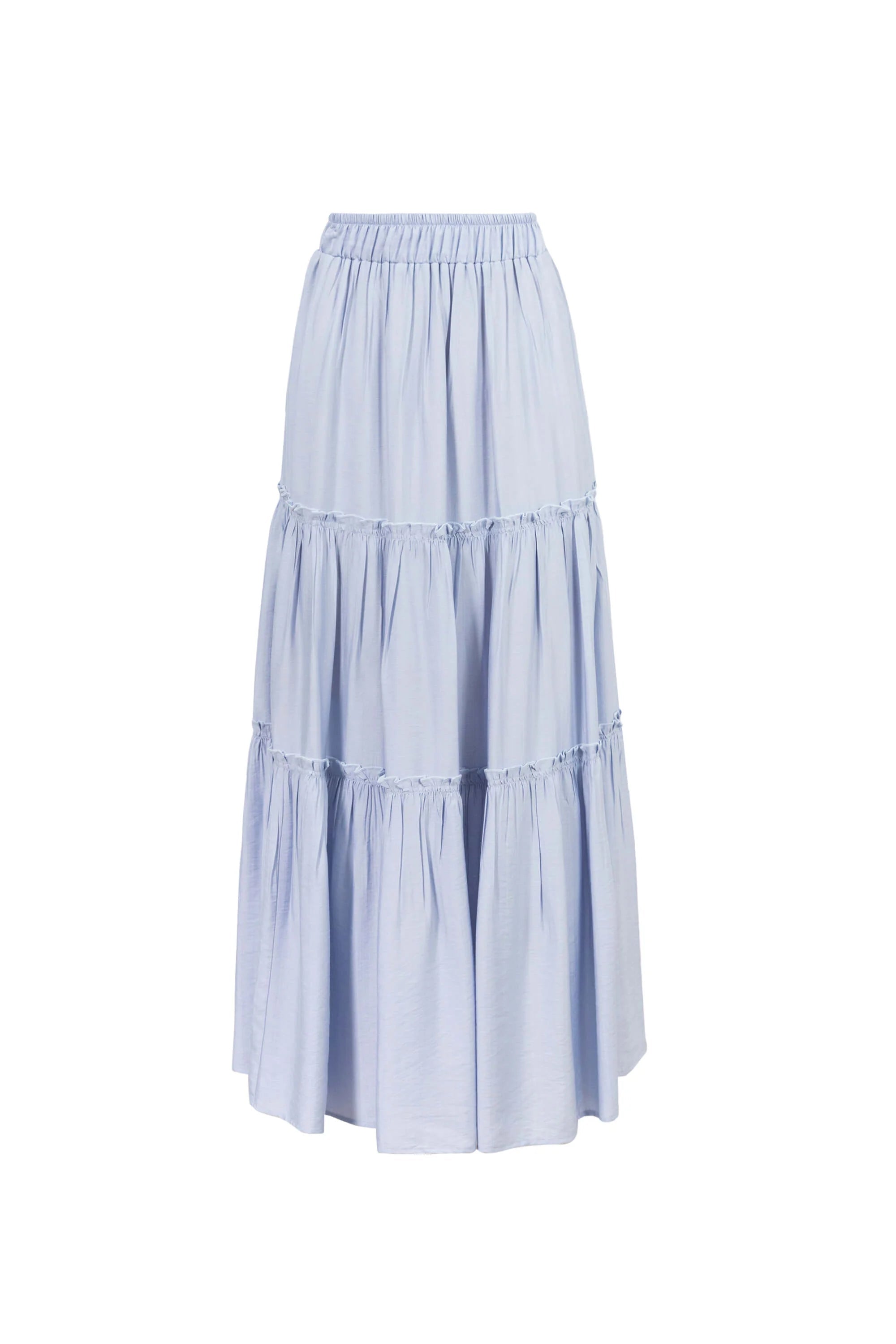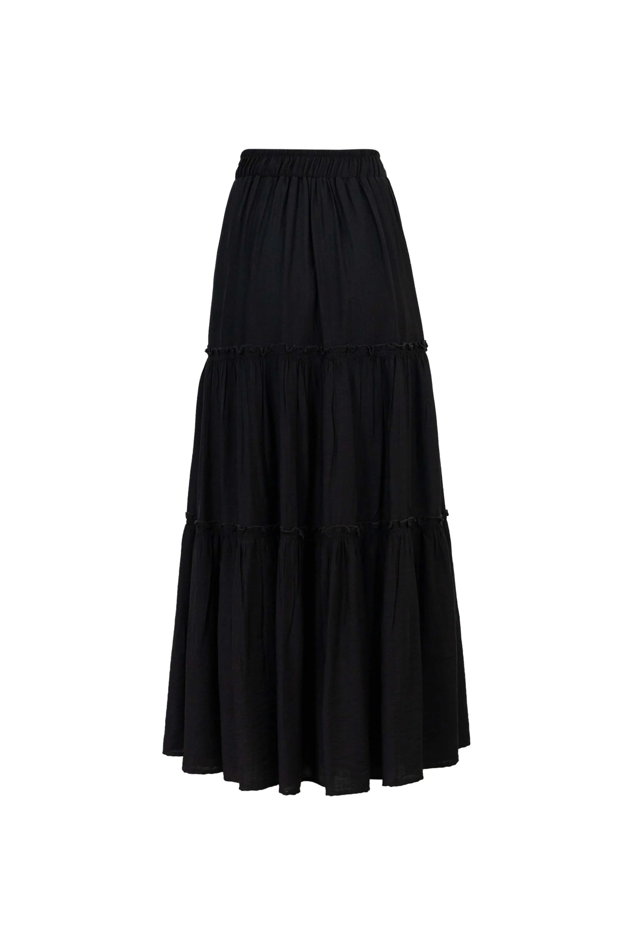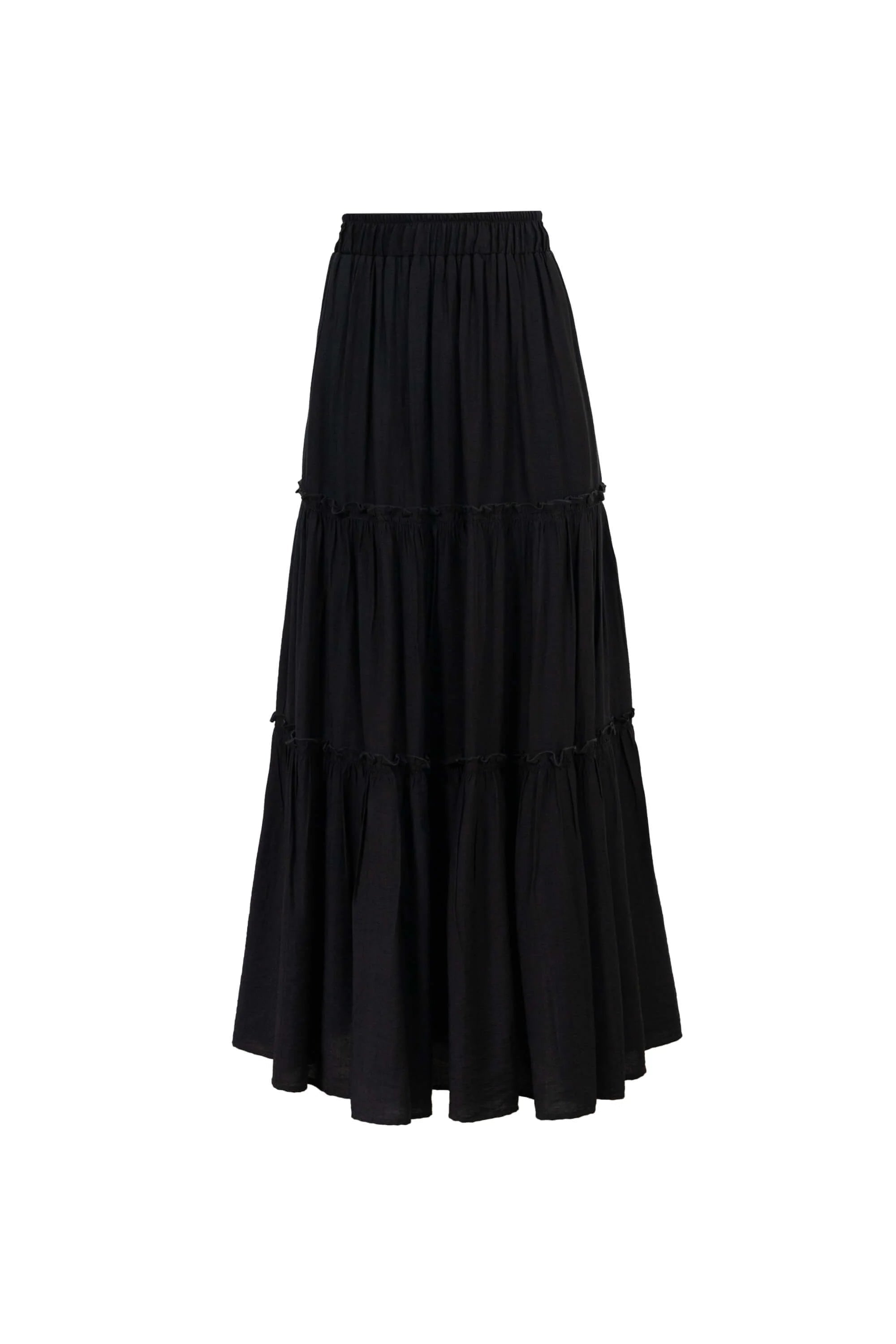 La falda Paige es una pieza de longitud maxi que destaca por su diseño de tres tiempos (tiered), creando una silueta fluida y con movimiento orgánico. Su estética bohemia se eleva mediante una construcción limpia y minimalista, con una cintura elástica fruncida que garantiza un ajuste cómodo y adaptable. Los cortes horizontales están decorados con pequeños volantes sutiles que añaden textura y detalle sin comprometer la ligereza visual de la prenda.